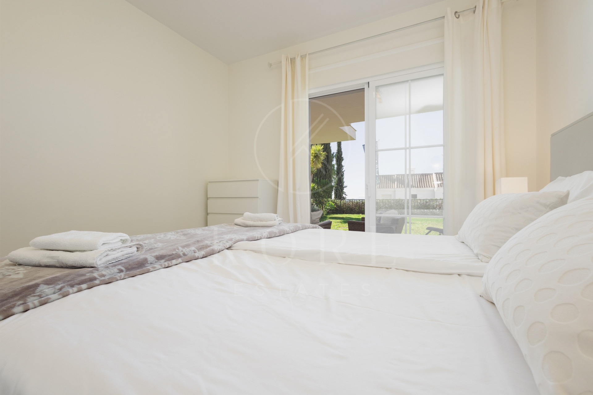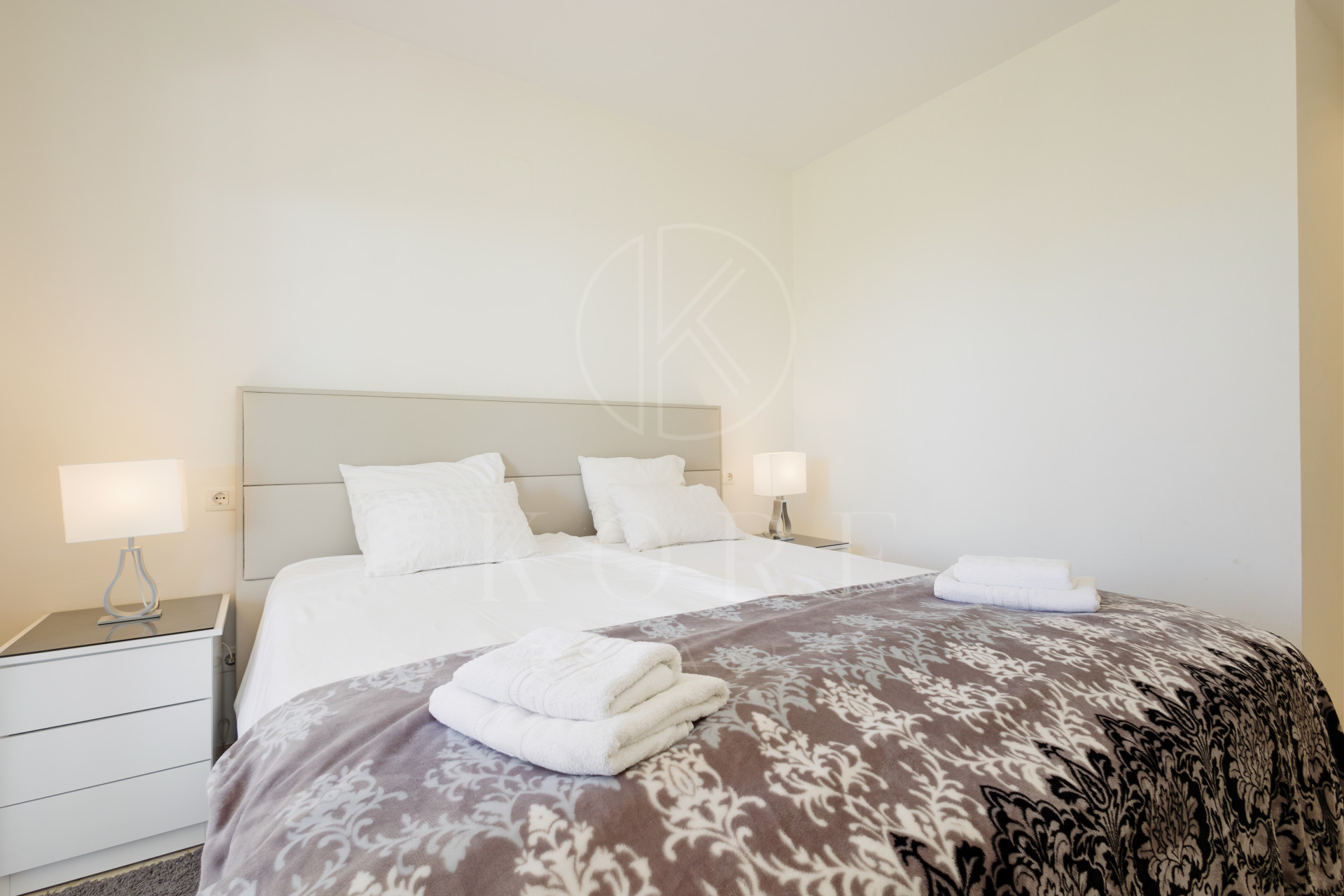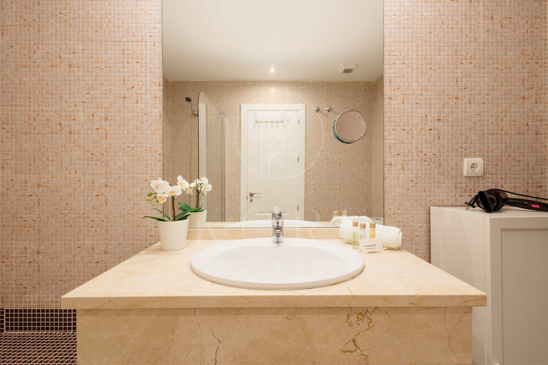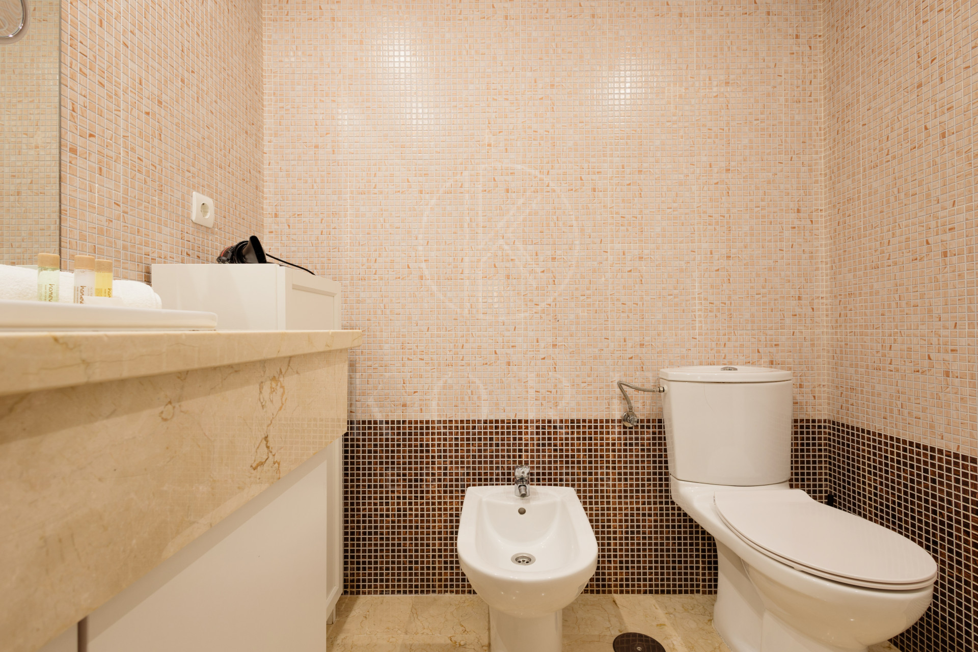 Ambos dormitorios están amueblados con lujosas camas Boxspring de 180×200 que aseguran el descanso perfecto durante sus vacaciones en la Costa del Sol. El dormitorio principal incluye baño en suite con bañera, mampara de ducha, bidé, lavabo e inodoro. El segundo baño ofrece inodoro, lavabo y ducha. Un conveniente cuarto de lavandería alberga lavadora, secadora, plancha y tabla de planchar.