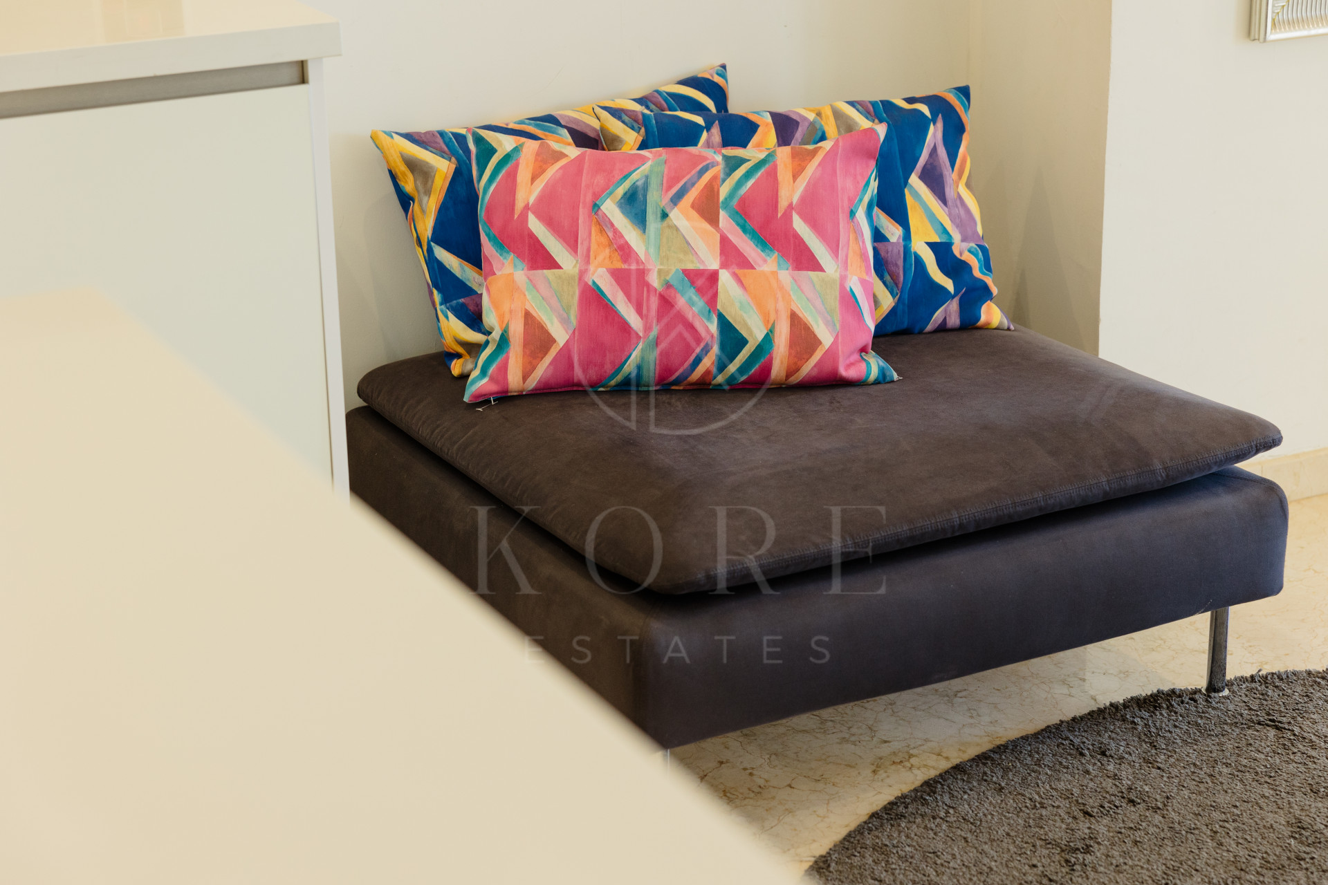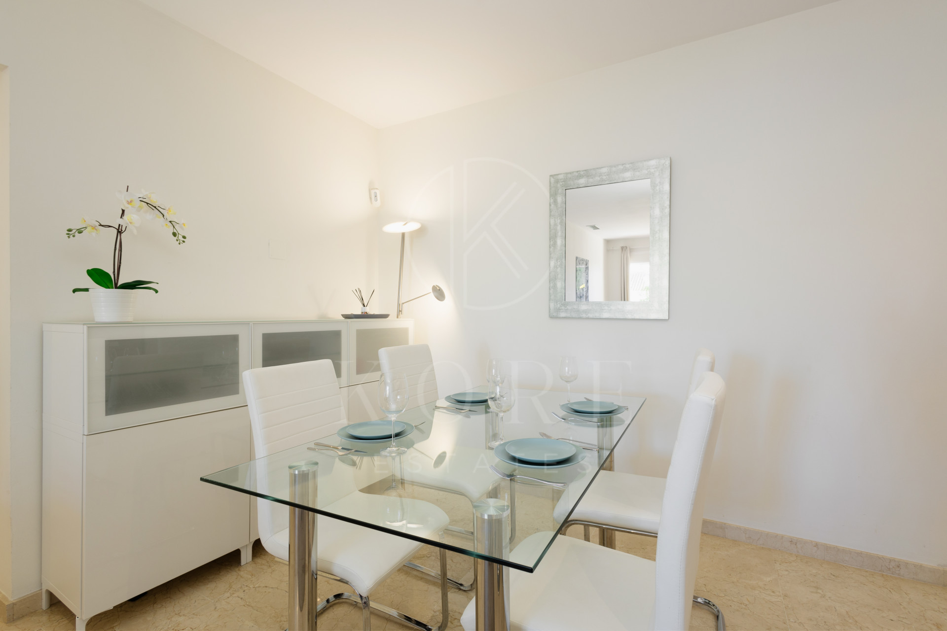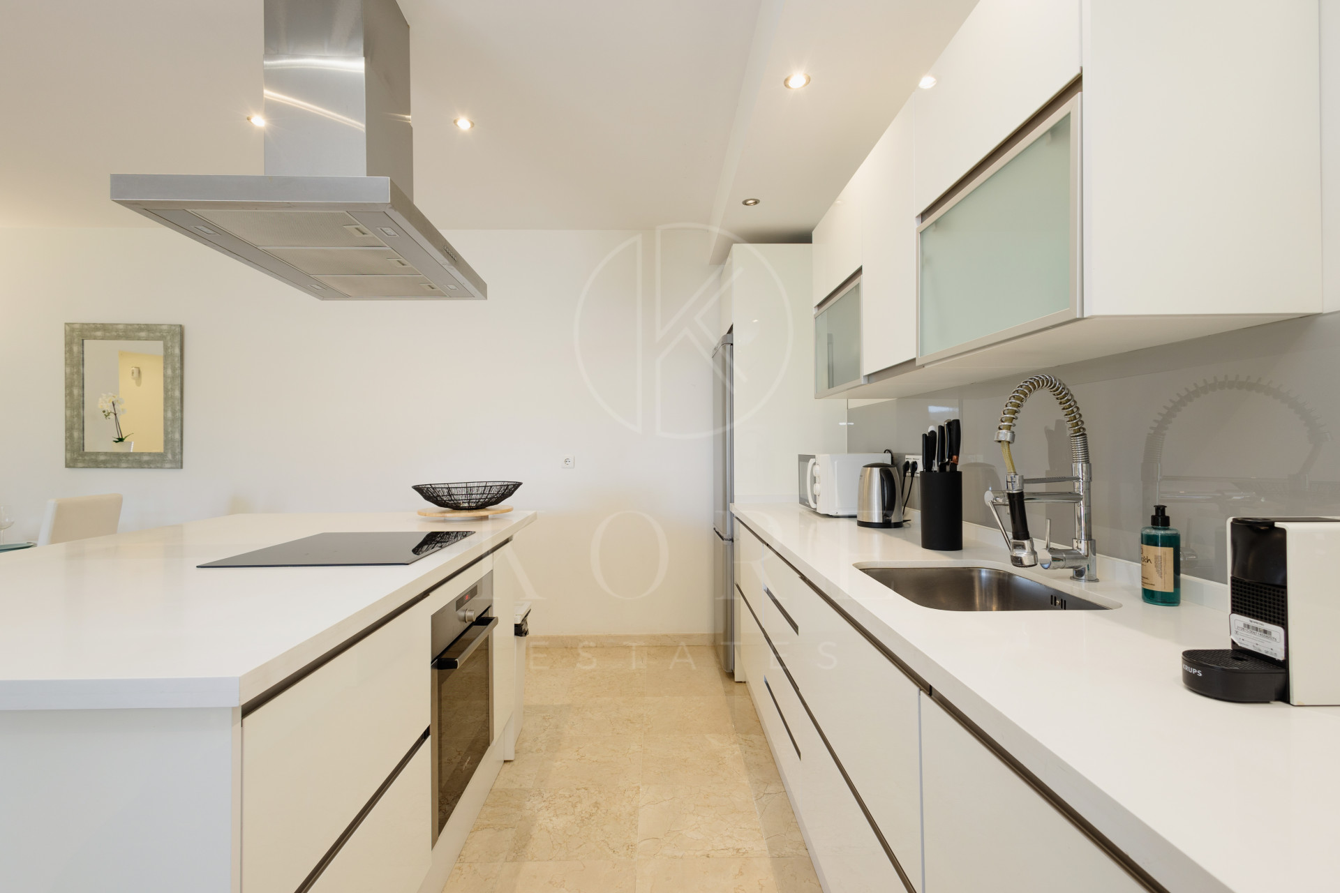 Este hermoso alquiler vacacional Istán cuenta con una sala de estar de planta abierta con vistas panorámicas al mar desde el cómodo sofá. La moderna cocina totalmente equipada presume electrodomésticos premium Bosch incluyendo horno, placa de inducción, refrigerador y lavavajillas, además de máquina de café Nespresso, cafetera de filtro, tostadora, licuadora, microondas y hervidor. El elegante comedor presenta una mesa de cristal para cuatro personas.