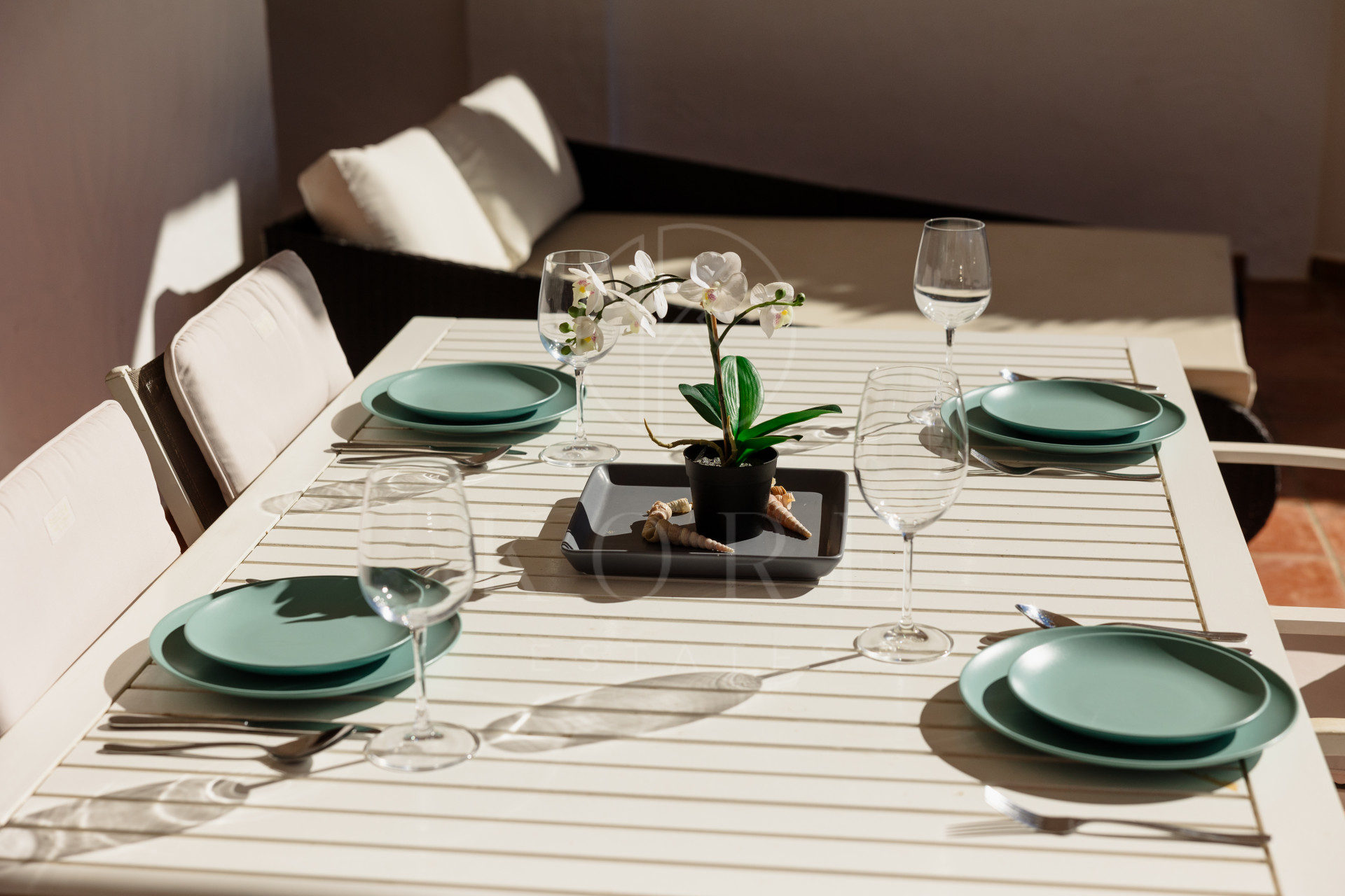 Salga a su terraza privada de 100m² y jardín cerrado que cuenta con sofá exterior con sillones, mesa de centro, mesa de comedor con cuatro sillas, dos tumbonas y área de barbacoa – perfecto para cenar al aire libre mientras disfruta de esas espectaculares vistas al mar. Todas las habitaciones proporcionan acceso directo a este magnífico espacio exterior.