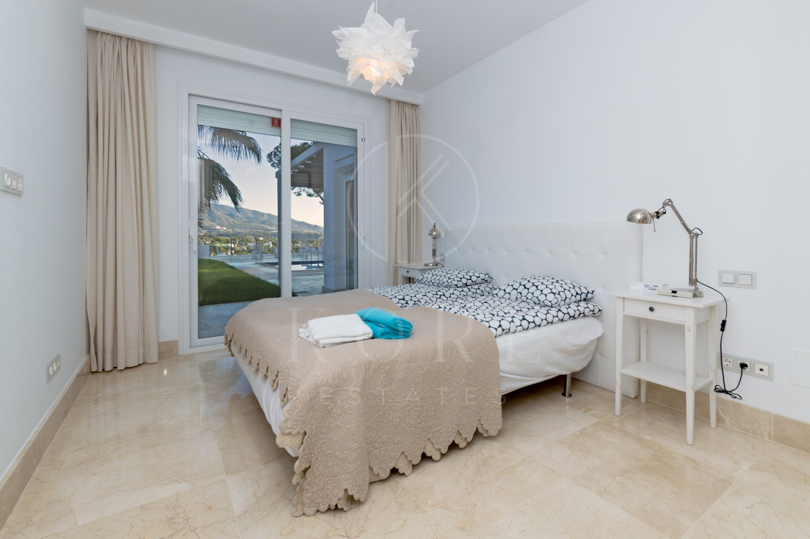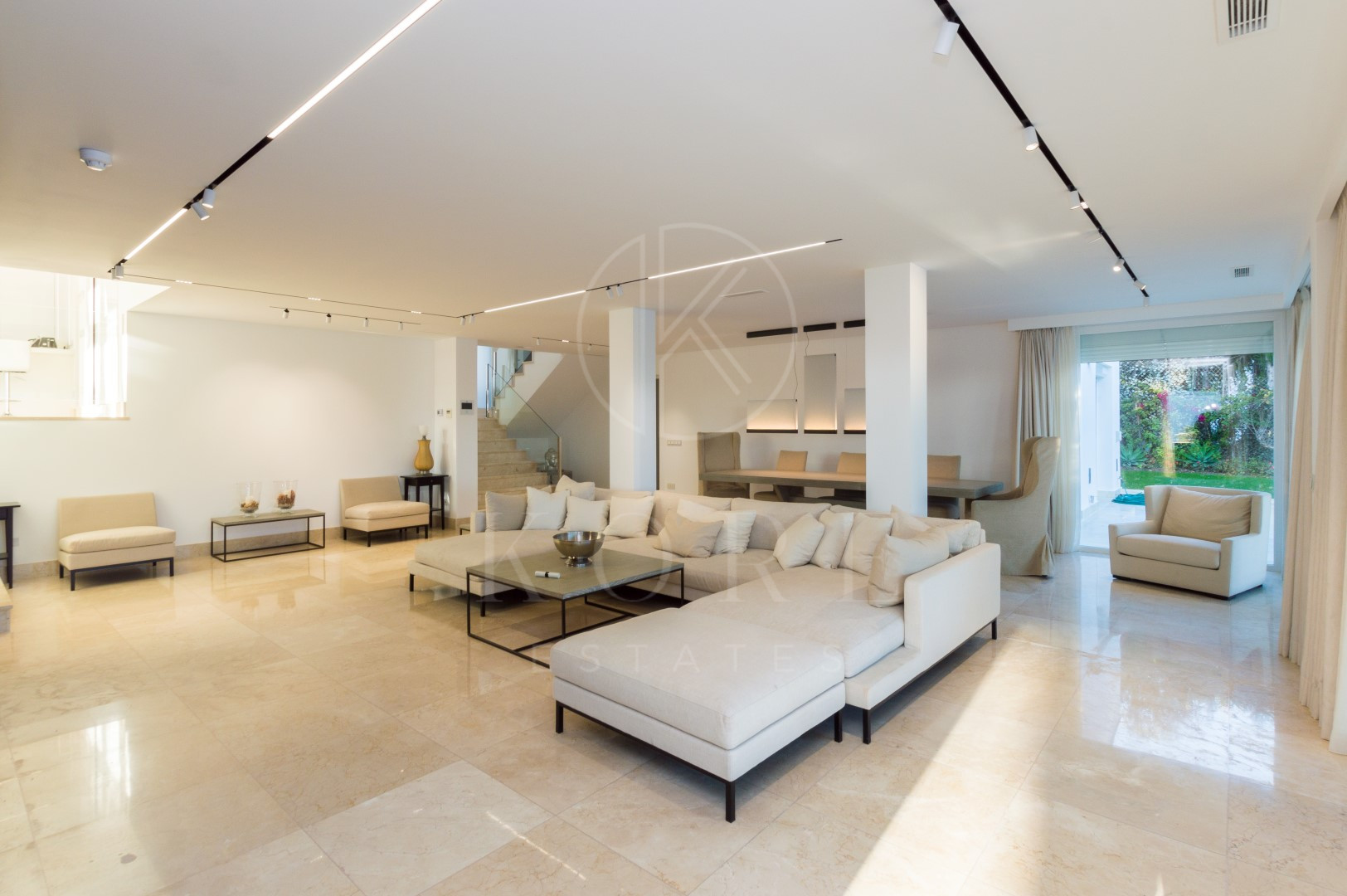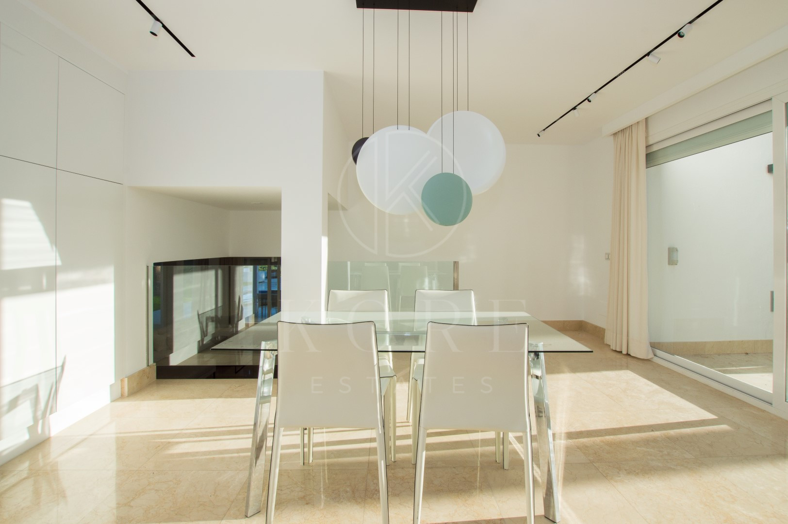 Lujosa villa contemporánea con espectaculares vistas al mar y la montaña para alquiler de corta temporada en Nueva Andalucía, Costa del Sol. Recién renovada, en excelente estado y completamente amueblada. Situada en una zona residencial privilegiada a un paso de todos los servicios. Construida con materiales de alta calidad, distribuida en 2 niveles con mucha luz natural.