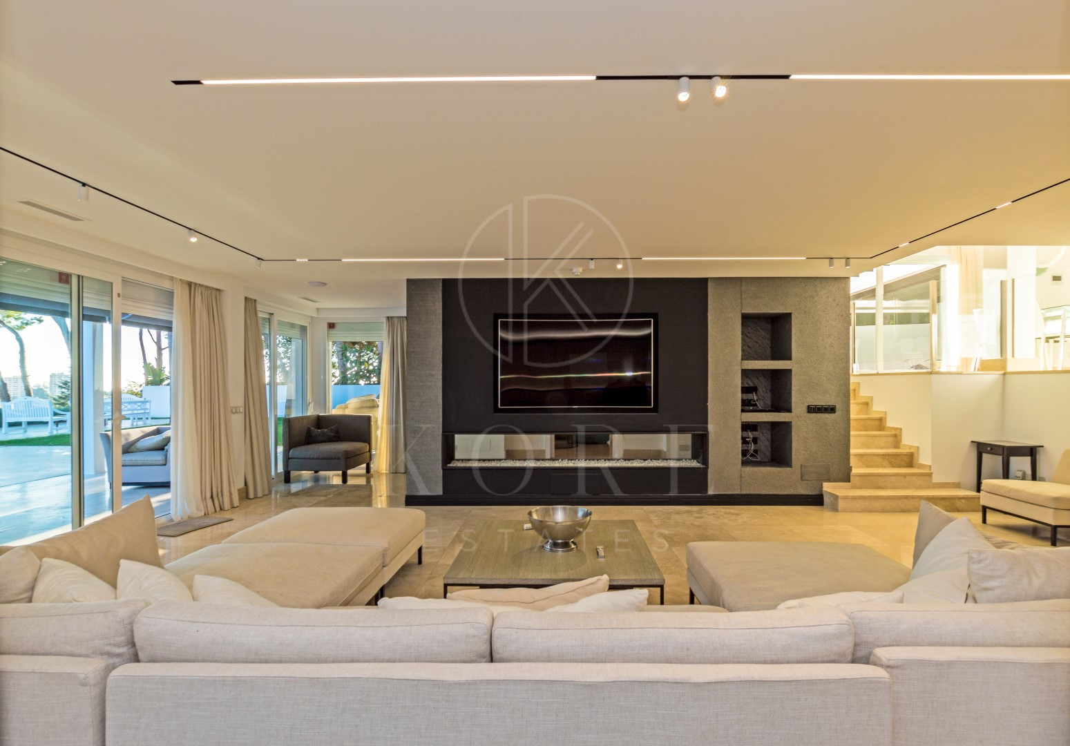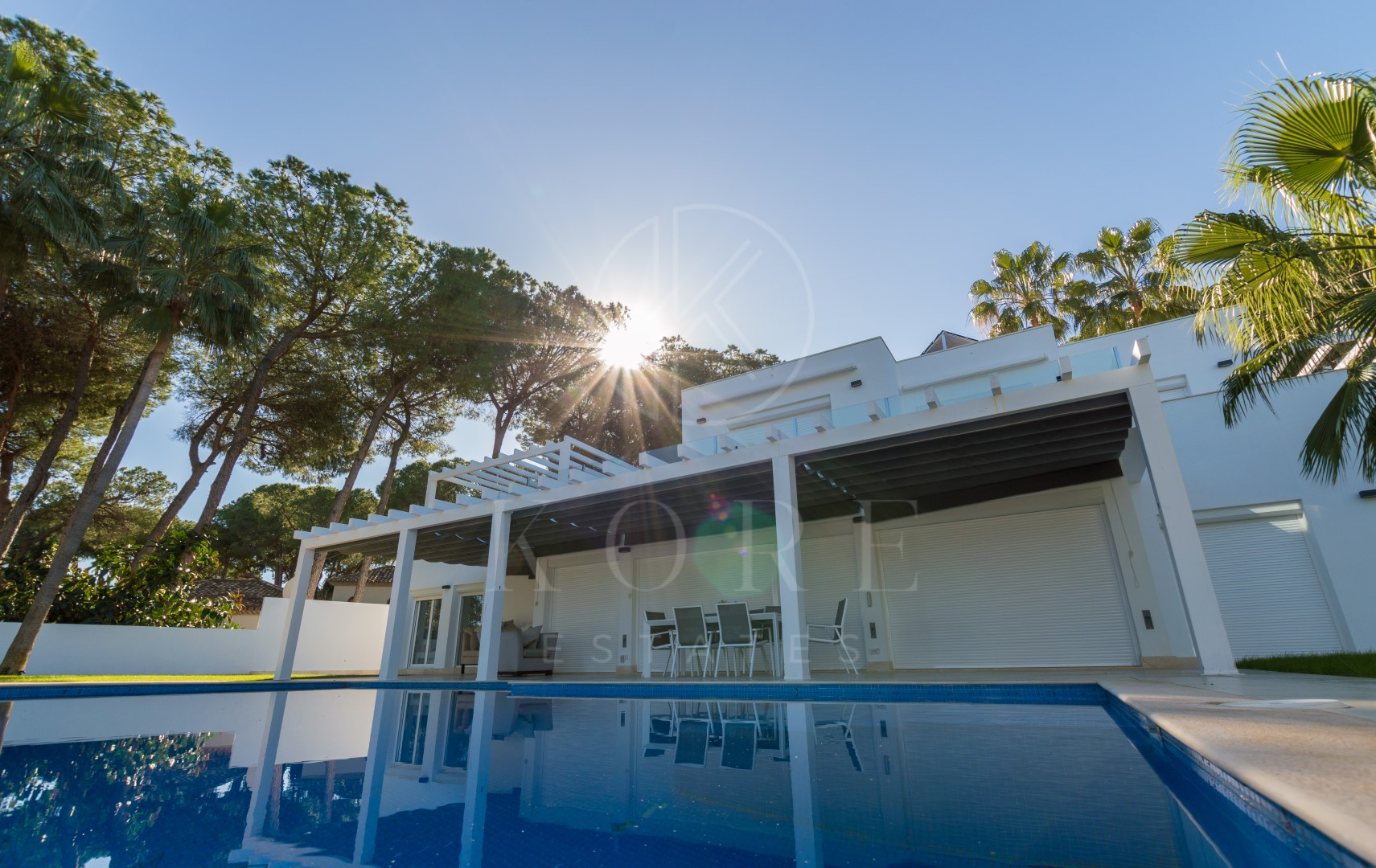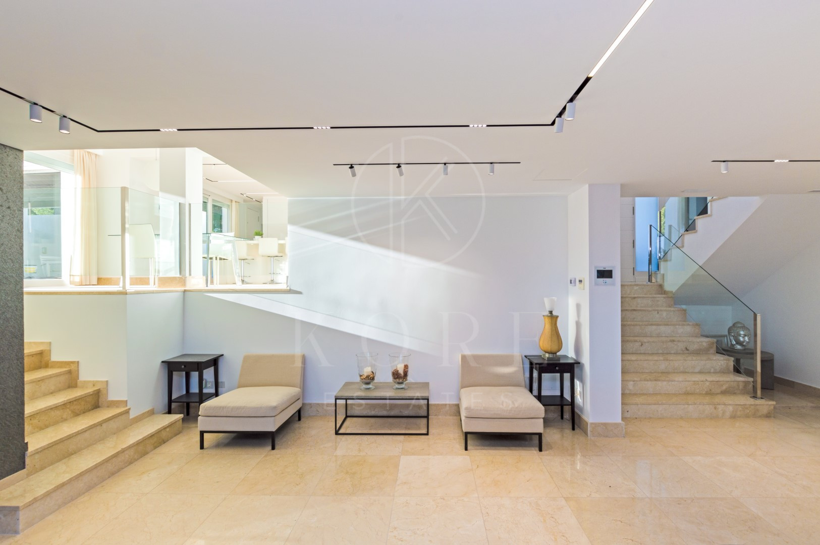 Lujosa villa contemporánea con espectaculares vistas al mar y la montaña para alquiler de corta temporada en Nueva Andalucía, Costa del Sol. Recién renovada, en excelente estado y completamente amueblada. Situada en una zona residencial privilegiada a un paso de todos los servicios. Construida con materiales de alta calidad, distribuida en 2 niveles con mucha luz natural.