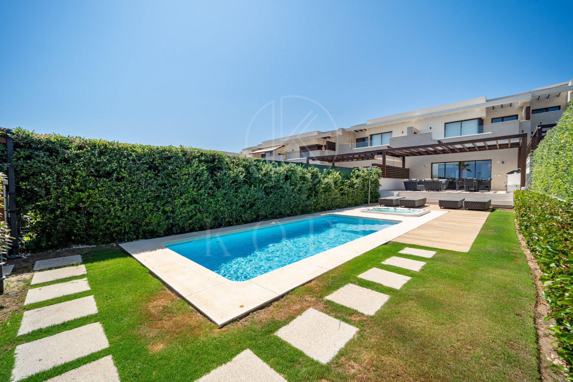 La propiedad se distribuye en tres niveles e incluye tres luminosos dormitorios y cuatro elegantes baños. La cocina americana de diseño abierto se integra perfectamente con la zona de salón-comedor, donde los ventanales enmarcan vistas despejadas al mar y llenan la vivienda de luz natural. Desde el salón se accede a una gran terraza y al jardín privado con piscina propia, ideal para relajarse o disfrutar con amigos y familia.