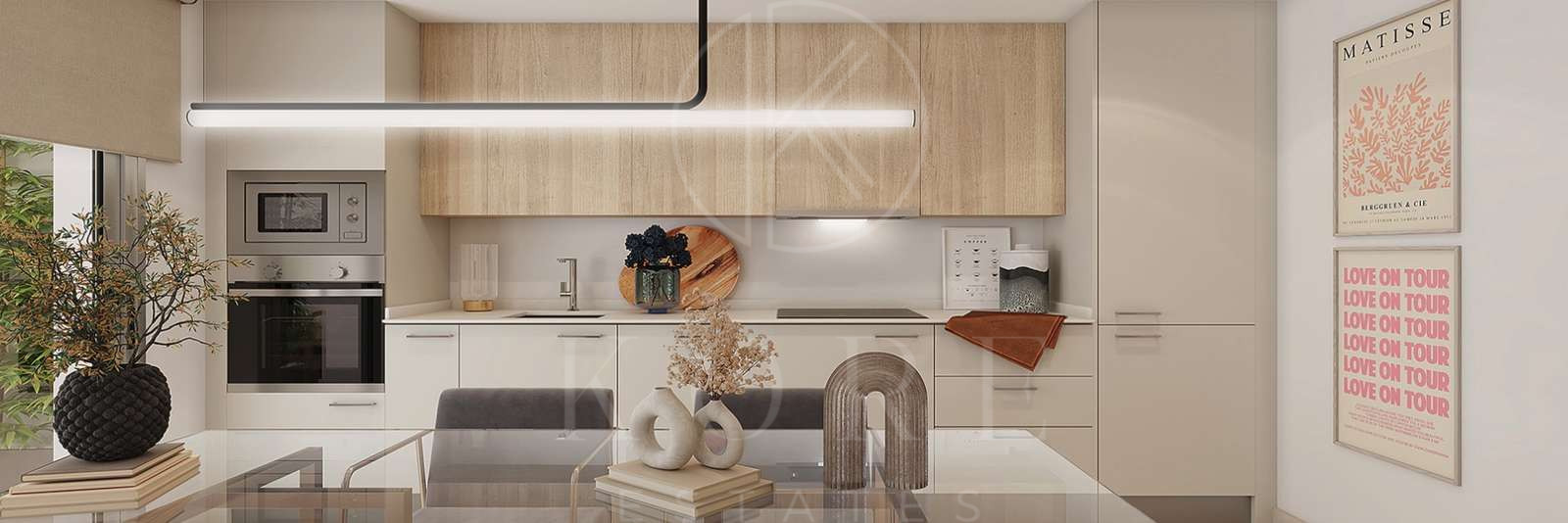 La cocina se entrega completamente amueblada y equipada con electrodomésticos de la marca Bosch o similar con horno eléctrico, microondas, placa de inducción, campana extractora, frigorífico integrado, lavavajillas, lavadora, fregadero de un seno en color acero inoxidable.