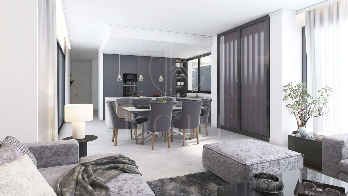 Las zonas de estar ofrecen un equilibrio perfecto entre lujo y confort, y están cuidadosamente distribuidas para crear espacios acogedores y sofisticados. Inundadas de luz natural, estas habitaciones luminosas y ventiladas cuentan con una distribución de planta abierta que promueve una sensación de fluidez y conectividad, ideal tanto para relajarse como para entretenerse. La distribución da prioridad a la amplitud, con grandes puertas acristaladas y ventanales que se abren sin esfuerzo a amplias terrazas.Los grandes ventanales que se abren sin esfuerzo a amplias terrazas, ofreciendo una transición perfecta entre la vida en el interior y la relajación al aire libre. Tanto si se trata de recibir invitados como de disfrutar de momentos de tranquilidad, estos espacios versátiles ofrecen un marco exquisito para cualquier ocasión. Cada detalle, desde los refinados acabados hasta la armoniosa integración de los materiales, contribuye a crear un entorno elegante y acogedor.