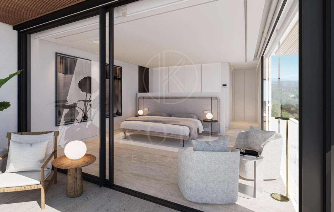 Distribuida en tres plantas que respetan la topografía natural del terreno, la villa cuenta con 4 amplios dormitorios en suite, ofreciendo privacidad y confort en cada rincón. La orientación sur garantiza una luminosidad excepcional durante todo el día y vistas ininterrumpidas desde prácticamente cualquier estancia.
