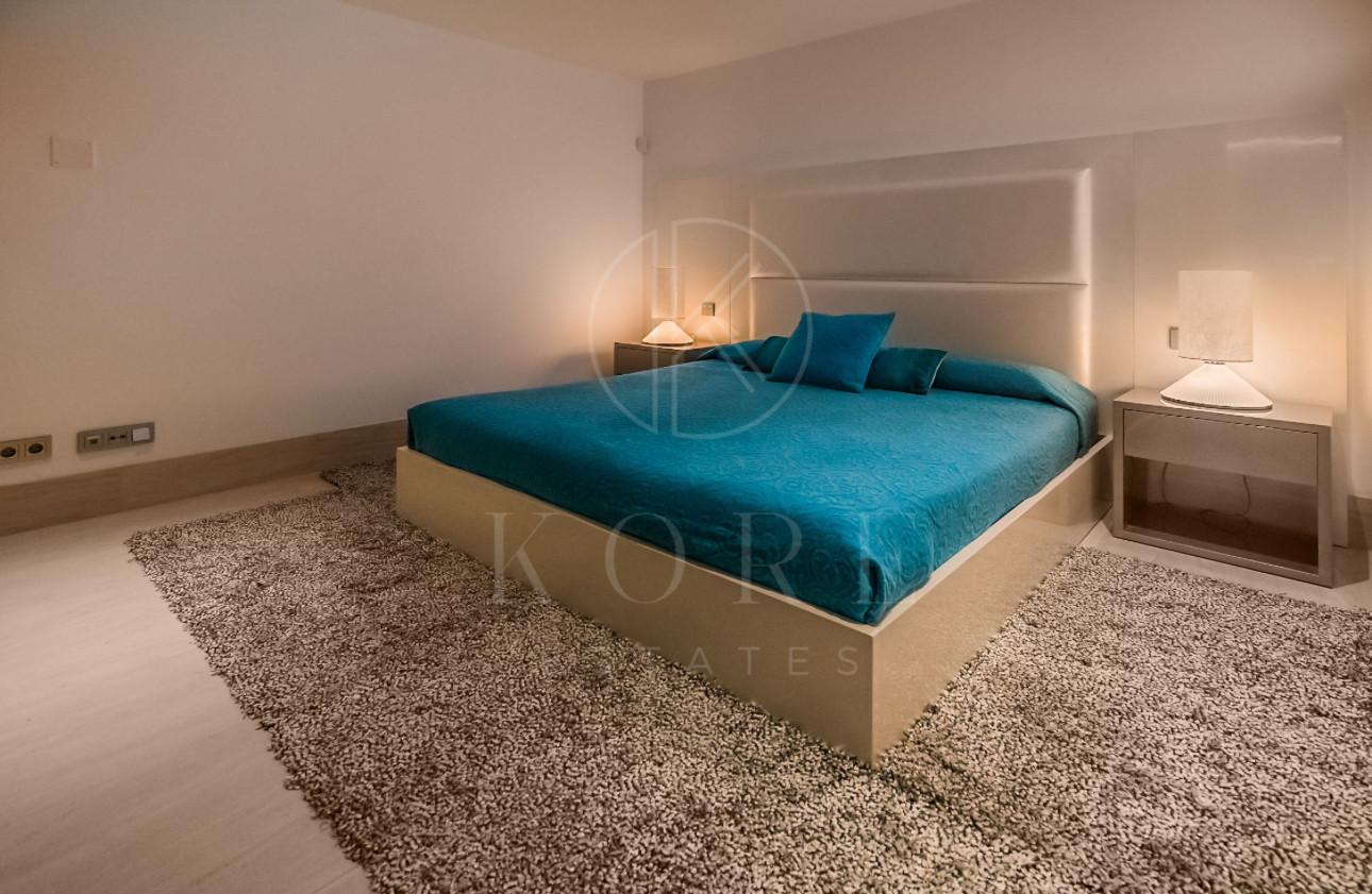 En la primera planta, la exquisita suite principal toma el escenario central con una terraza privada, un vestidor y un techo de cristal que ofrece una vista única a la piscina en la azotea, todo complementado con espectaculares vistas al mar y a la montaña. Dos dormitorios adicionales en suite con zonas de vestir ofrecen una gran comodidad y privacidad.