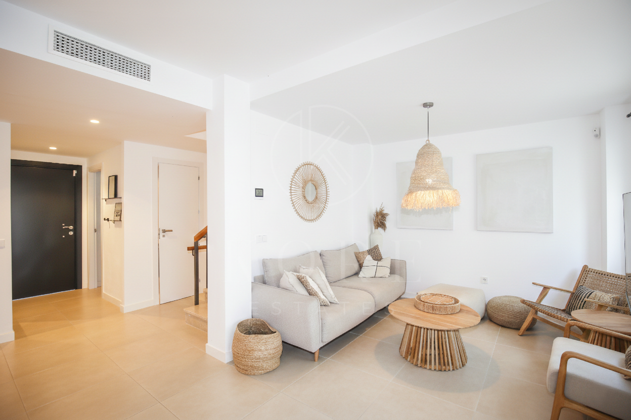 Elegante casa adosada de tres dormitorios situada en la urbanización cerrada de Agra Residencial, un encantador complejo de estilo mediterráneo de 47 amplias casas situadas junto al Campanario Golf & Country Club, en el corazón del prestigioso triángulo dorado de Estepona. Listo para entrar, esta propiedad muestra interiores luminosos y abiertos con acabados de calidad, incluyendo suelos de cerámica, armarios empotrados, baños modernos con pantallas de ducha de vidrio, y una cocina totalmente amueblada. Diseñado para vivir cómodamente, cuenta con amplias terrazas, un solárium privado y una piscina privada, perfecta para disfrutar del estilo de vida de la Costa del Sol. Destacan además aire acondicionado frío y caliente, dos plazas de aparcamiento subterráneo y acceso a hermosos jardines comunitarios y una piscina dentro de esta comunidad segura y cerrada.