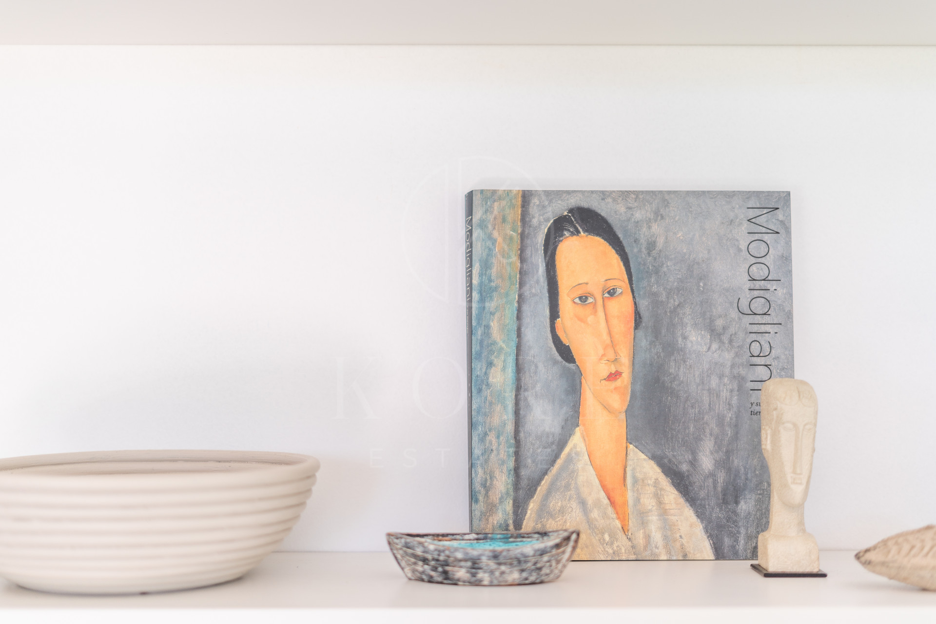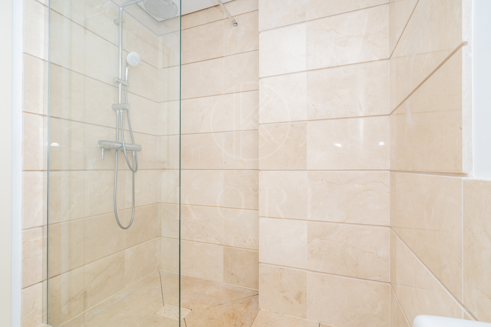 El apartamento tiene un amplio salón / comedor abierto con grandes ventanales hacia el jardín. Hay acceso directo a la terraza cubierta que está equipada con cortinas de vidrio que hacen posible utilizar como un lanzamiento/sala extra.