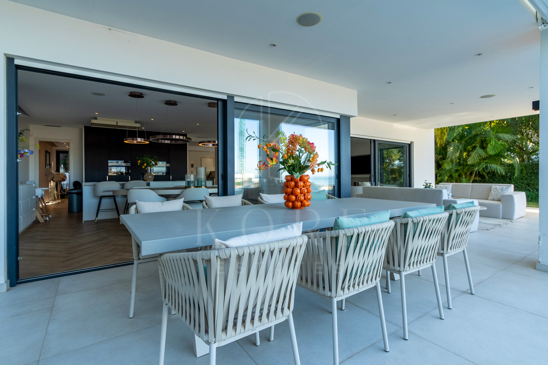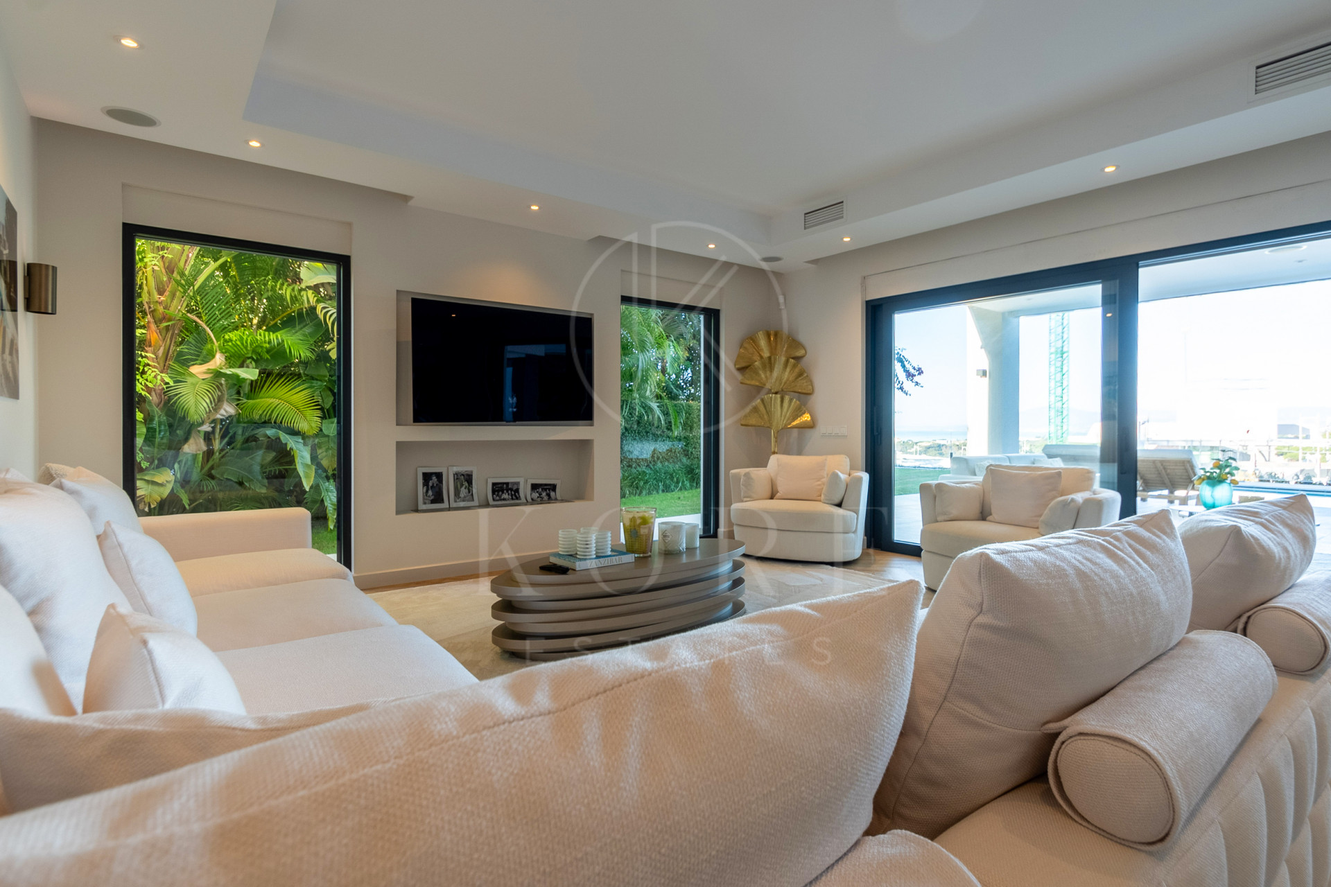 Salón luminoso con acceso directo al jardín y piscina