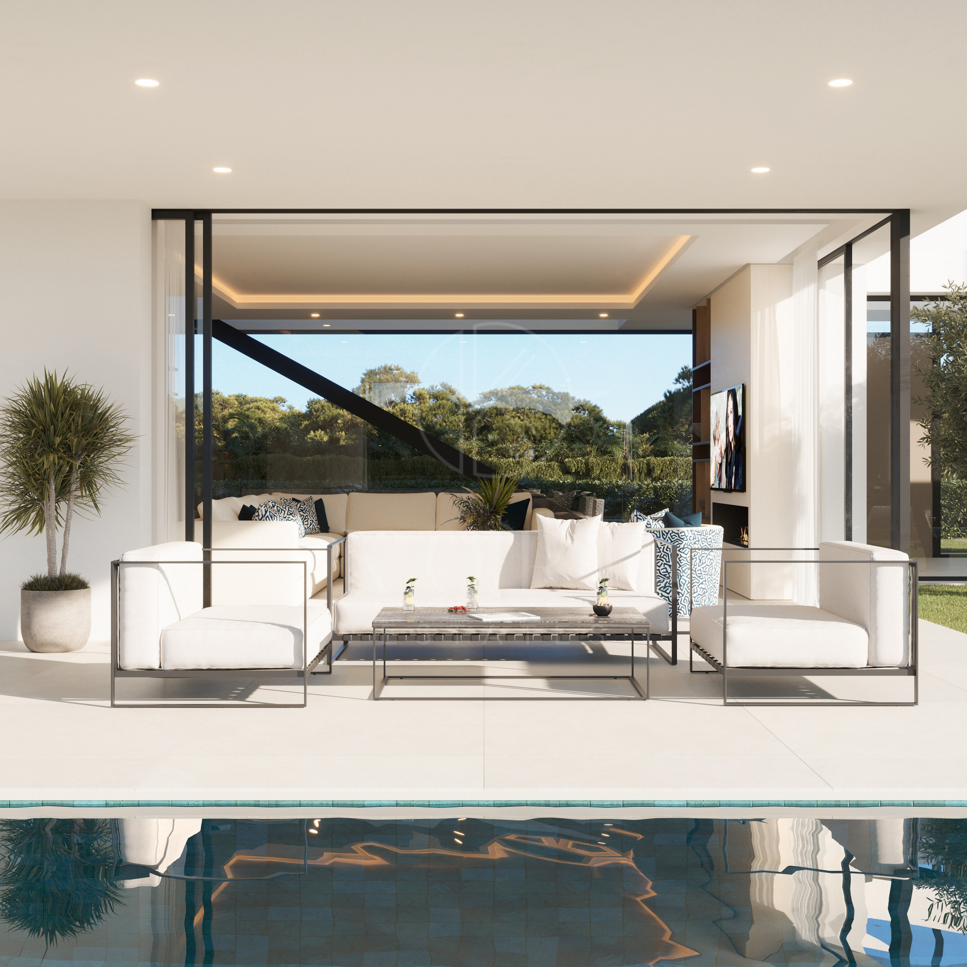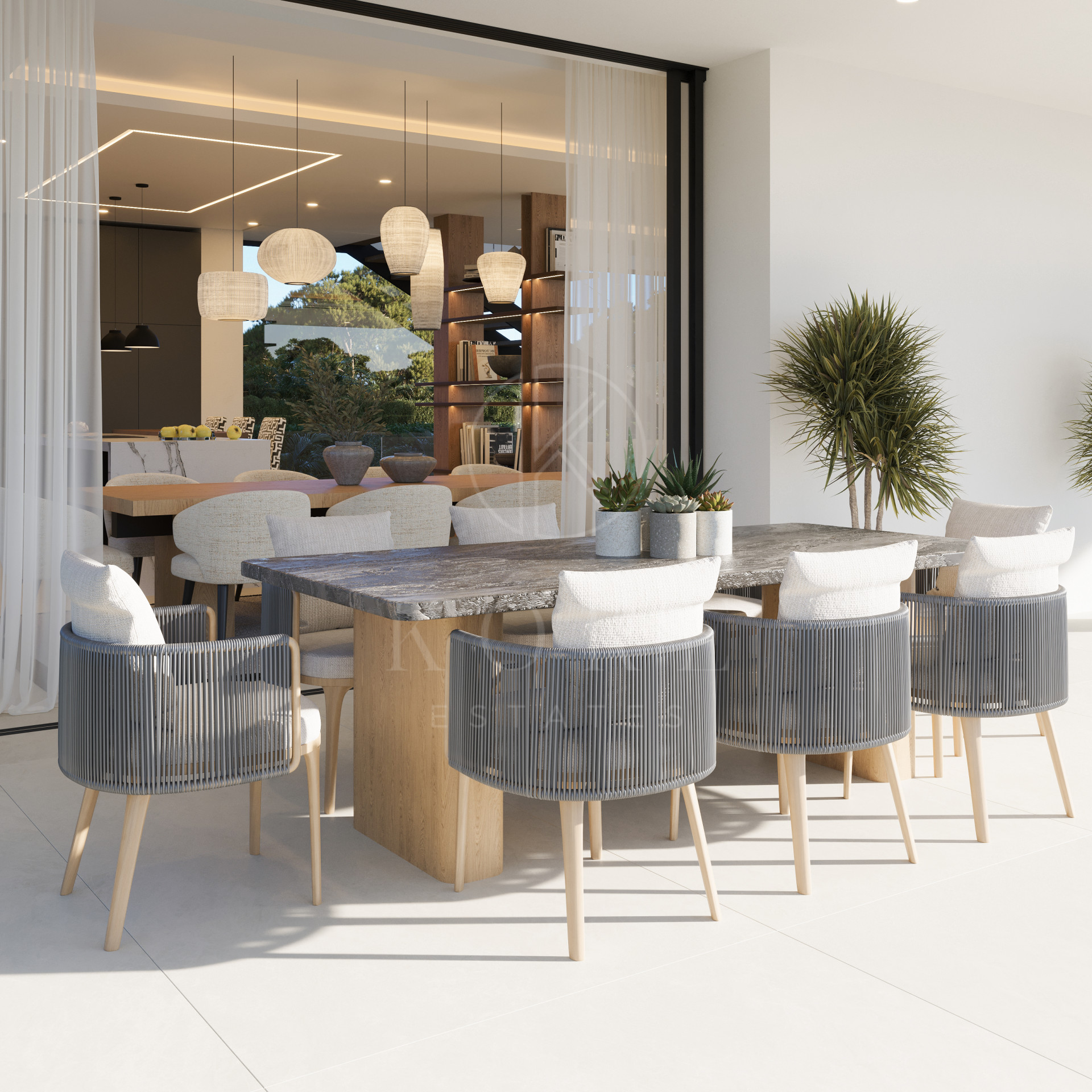 Espectacular villa de lujo moderna con vistas panorámicas al mar y al golf, situada en la exclusiva zona de Artola Alta de Cabopino Golf, Marbella. Actualmente en construcción y prevista para su finalización en 2027, esta elegante propiedad llena de luz se distribuye en cuatro niveles y ofrece cinco dormitorios en suite, amplios espacios de estar de planta abierta con una cocina de alta gama, un sótano multiusos con garaje para dos coches, y un solárium impresionante con jacuzzi y cocina al aire libre. La villa cuenta con jardines ajardinados, grandes terrazas, una piscina de agua salada y aparcamiento cubierto adicional, todo diseñado para la privacidad y el disfrute al aire libre. Equipado con climatización aerterómica, calefacción por suelo radiante, aire acondicionado, domótica y sistemas de seguridad, goza de una ubicación privilegiada a pocos minutos de la playa, Marbella ciudad, Puerto Banús, mejores campos de golf y Málaga International Airport, ofreciendo un estilo de vida refinado en la Costa del Sol.