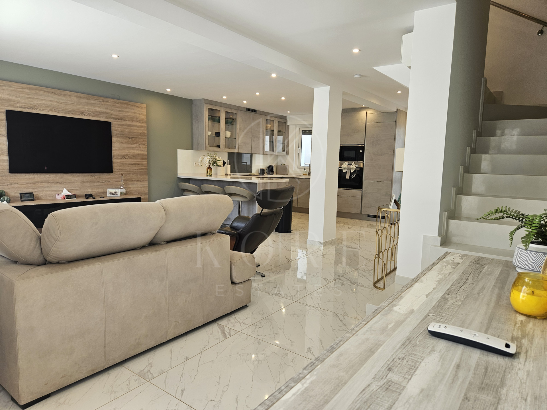 Se accede a la vivienda a través de una amplia terraza privada y segura, orientada al oeste para aprovechar al máximo el sol. Al entrar, encontramos un gran espacio diáfano con una cocina de alta gama equipada con encimeras de Silestone y electrodomésticos modernos, zona de comedor y salón. Junto a la cocina hay también una barra de desayuno en la parte trasera y un lavadero independiente con aseo y acceso a un patio posterior que ofrece espacio adicional de almacenaje. En la planta superior se encuentran los 4 dormitorios: el principal con baño en suite y los otros tres comparten un baño. Todos los dormitorios disponen de aire acondicionado y tienen un buen tamaño.