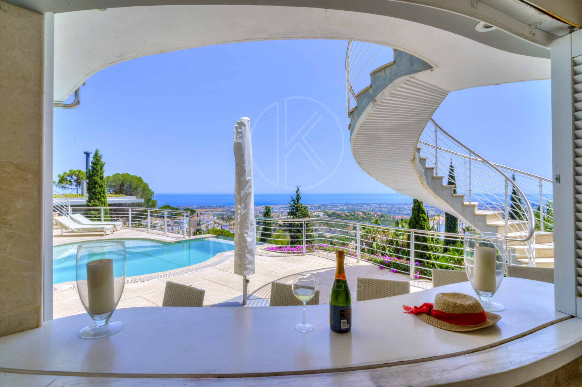 - La villa está situada en una posición elevada en el punto más alto de la urbanización, ofreciendo unas vistas panorámicas absolutamente impresionantes y excepcionales sobre todo el valle de Marbella – Estepona y su costa.