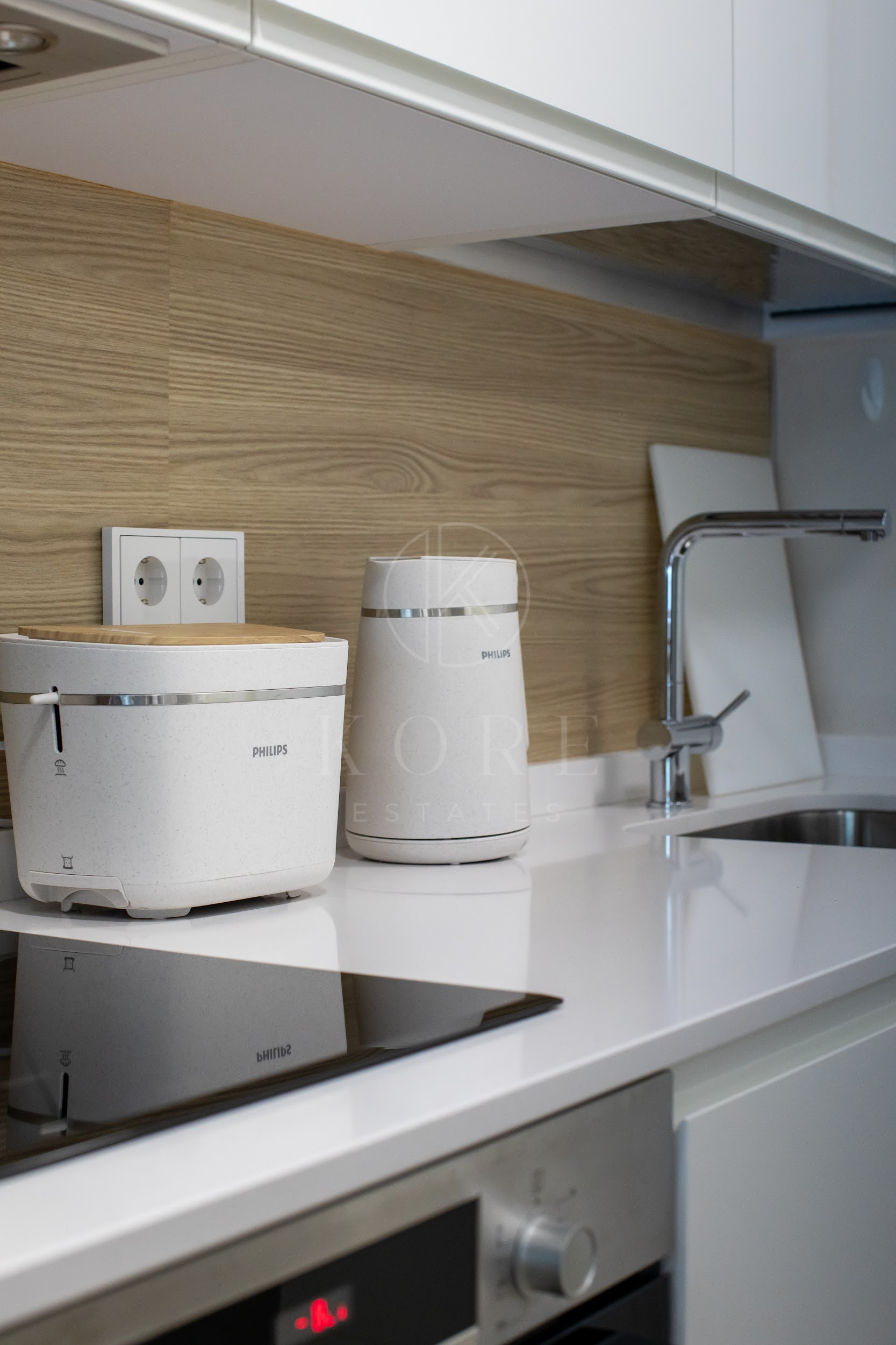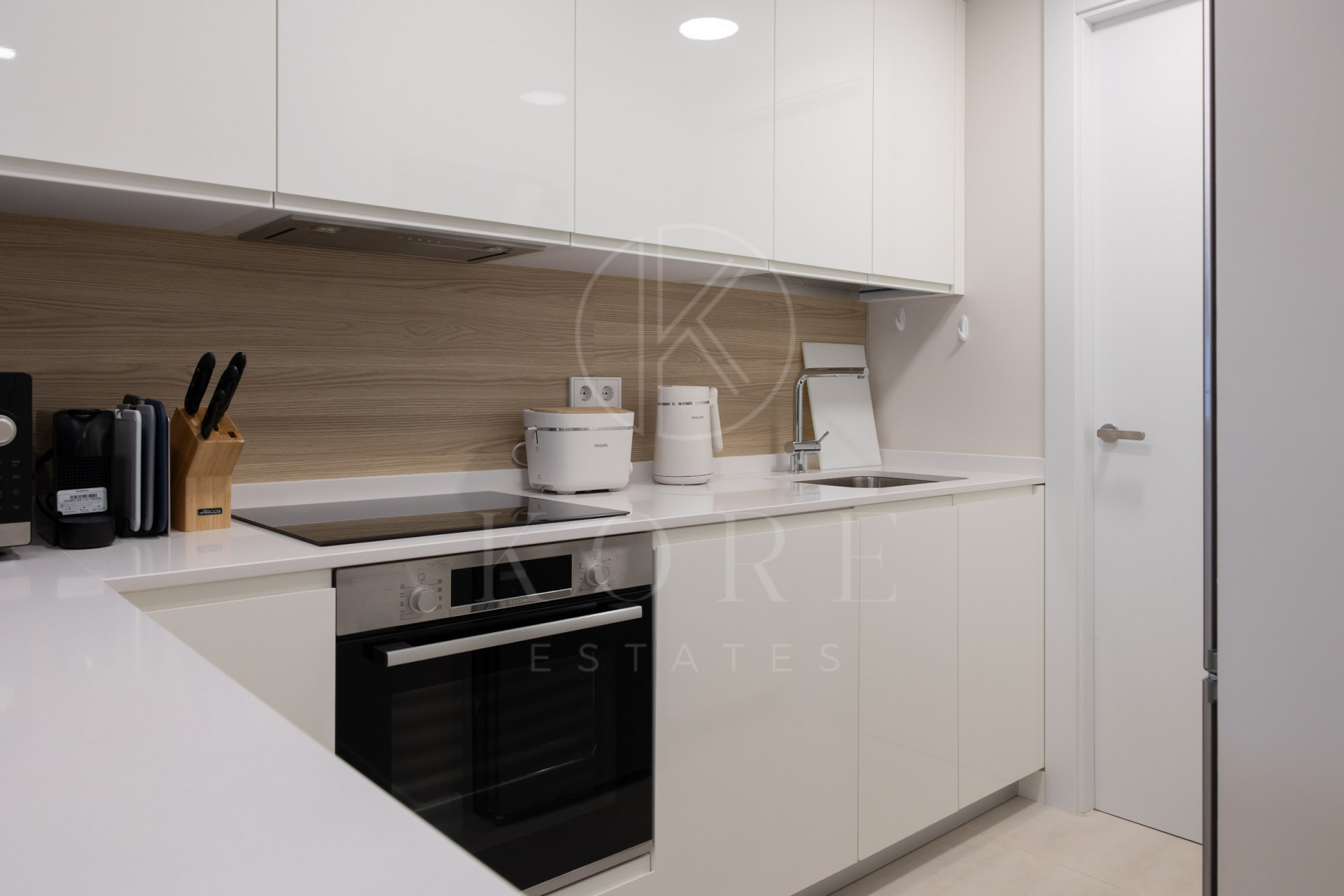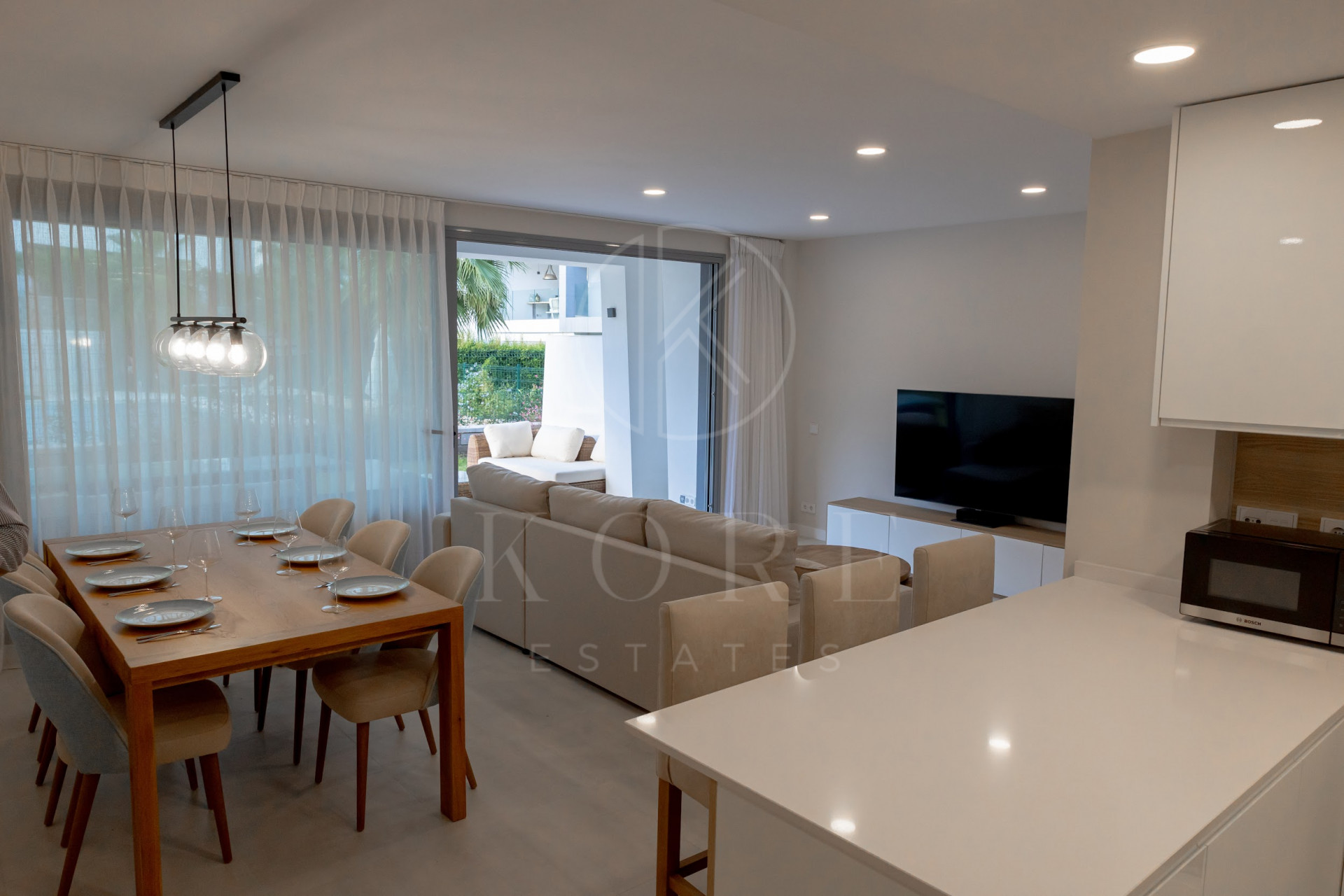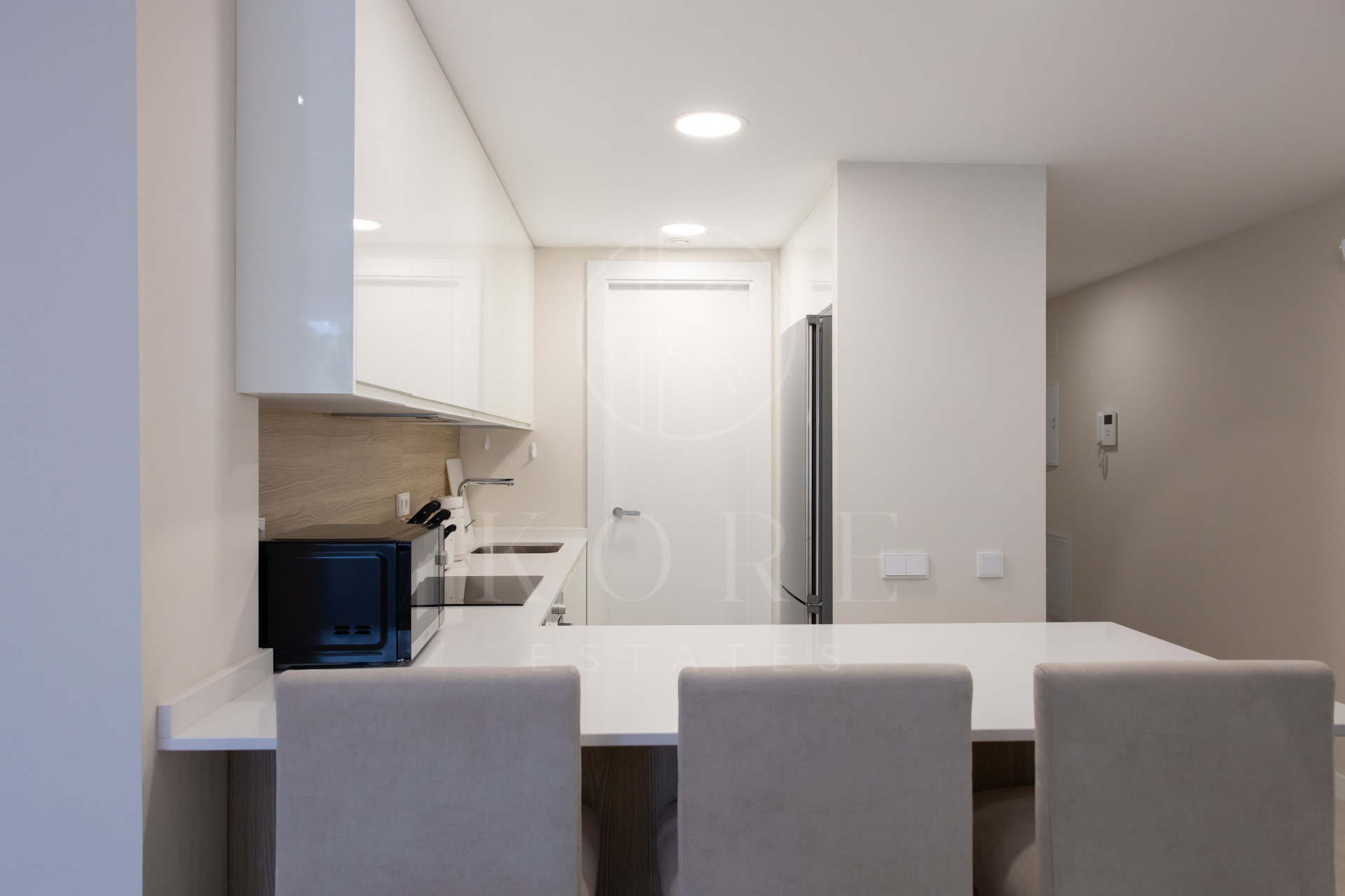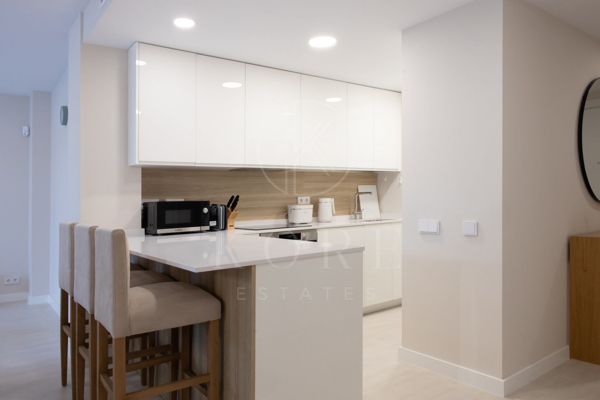 Cocina moderna completamente equipada con diseño abierto y barra. La cocina incluye electrodomésticos Bosch, como horno, placa de cocción, lavavajillas y frigorífico con congelador. También hay una lavandería independiente con lavadora.