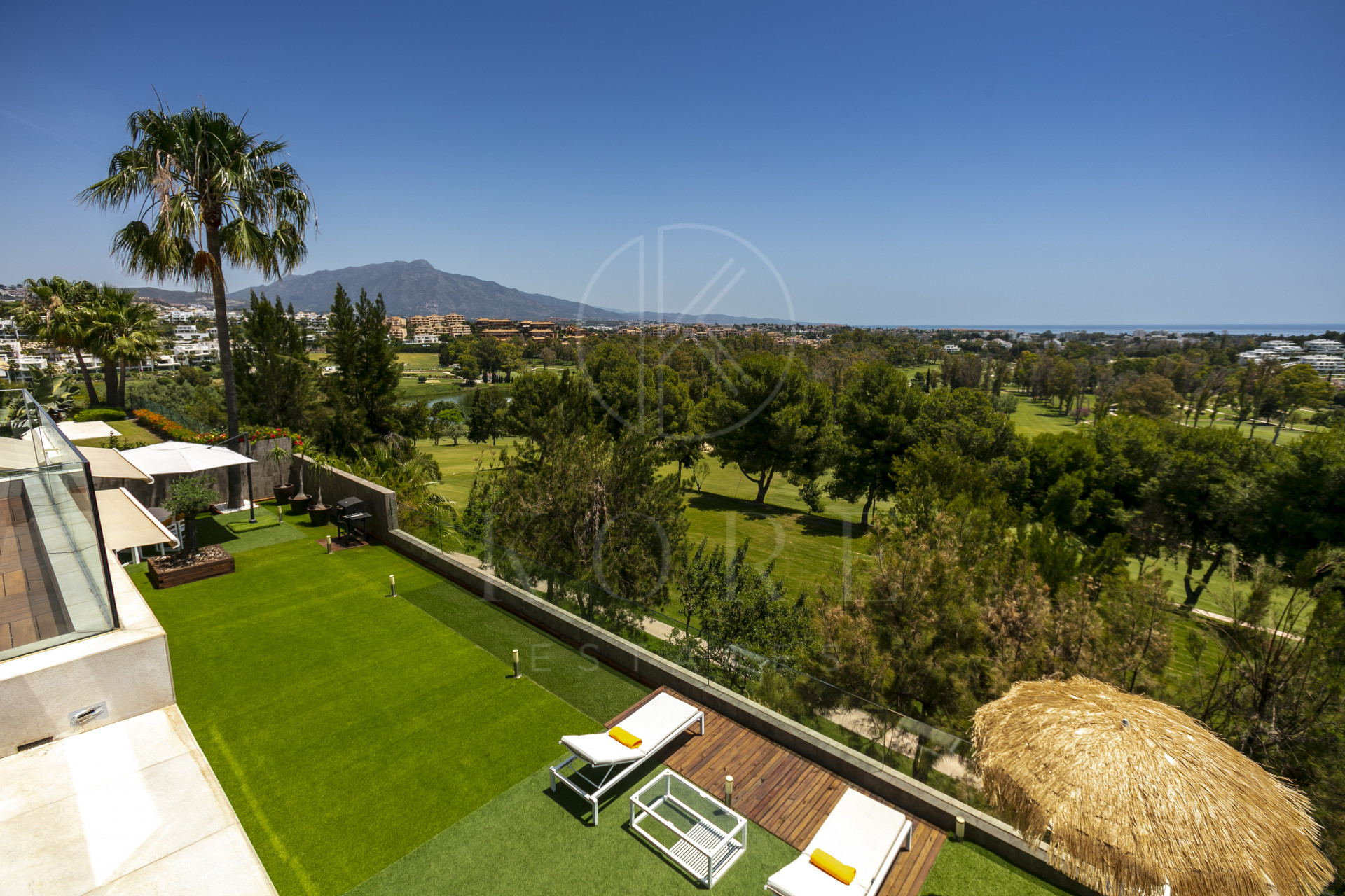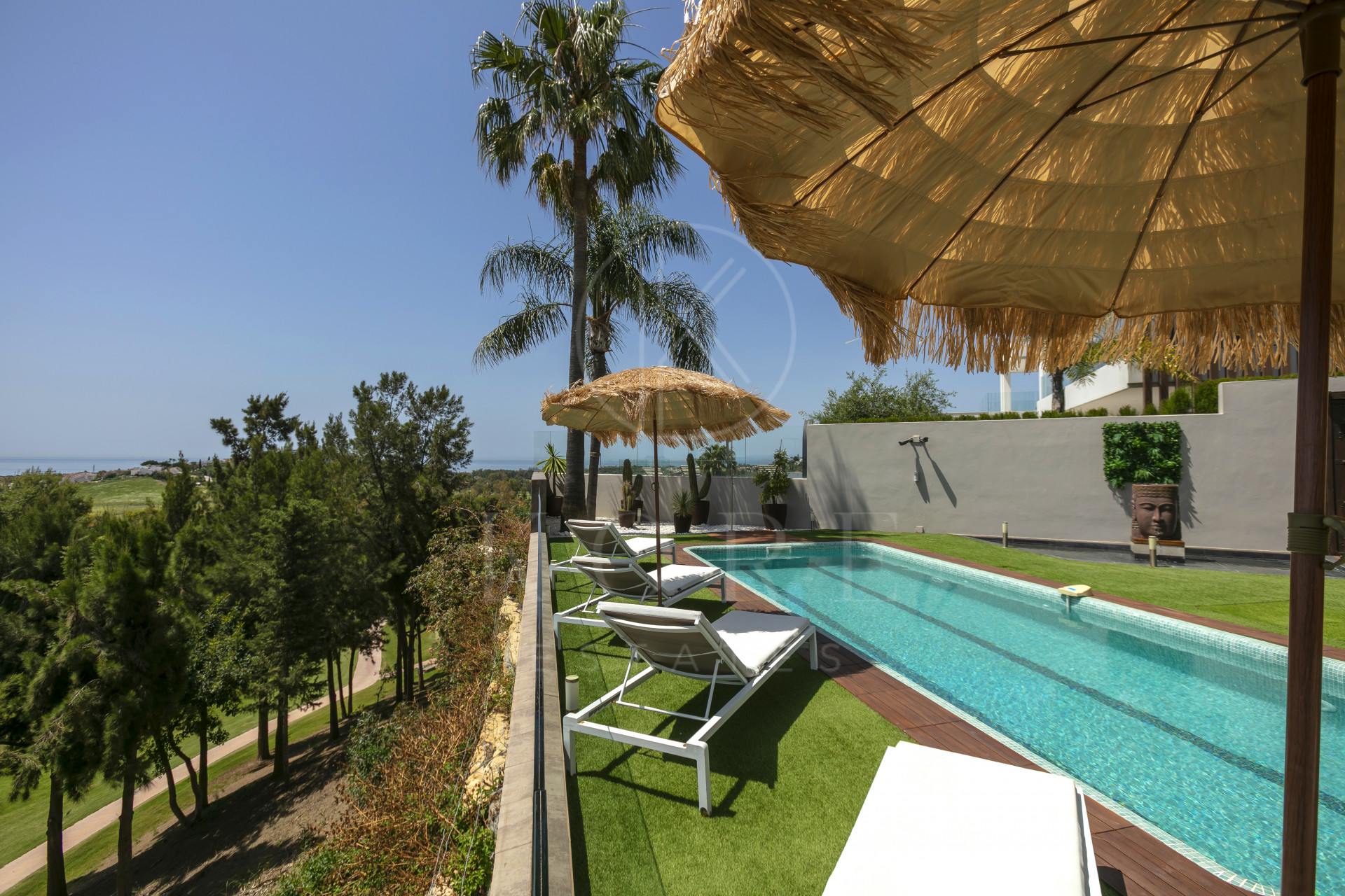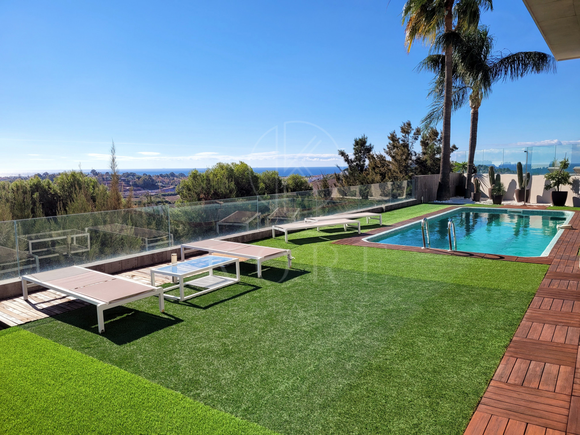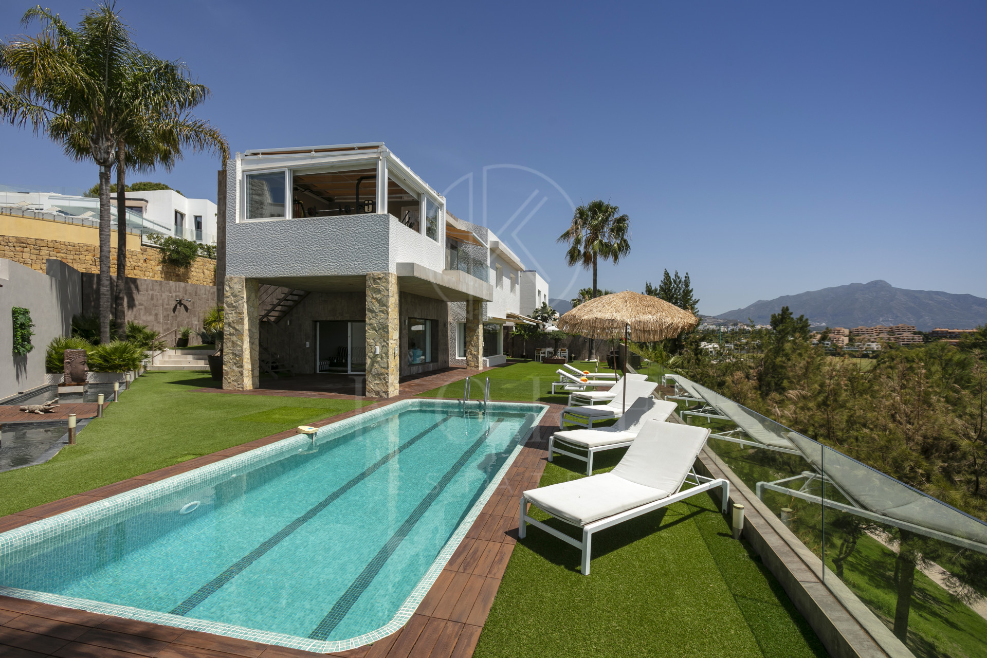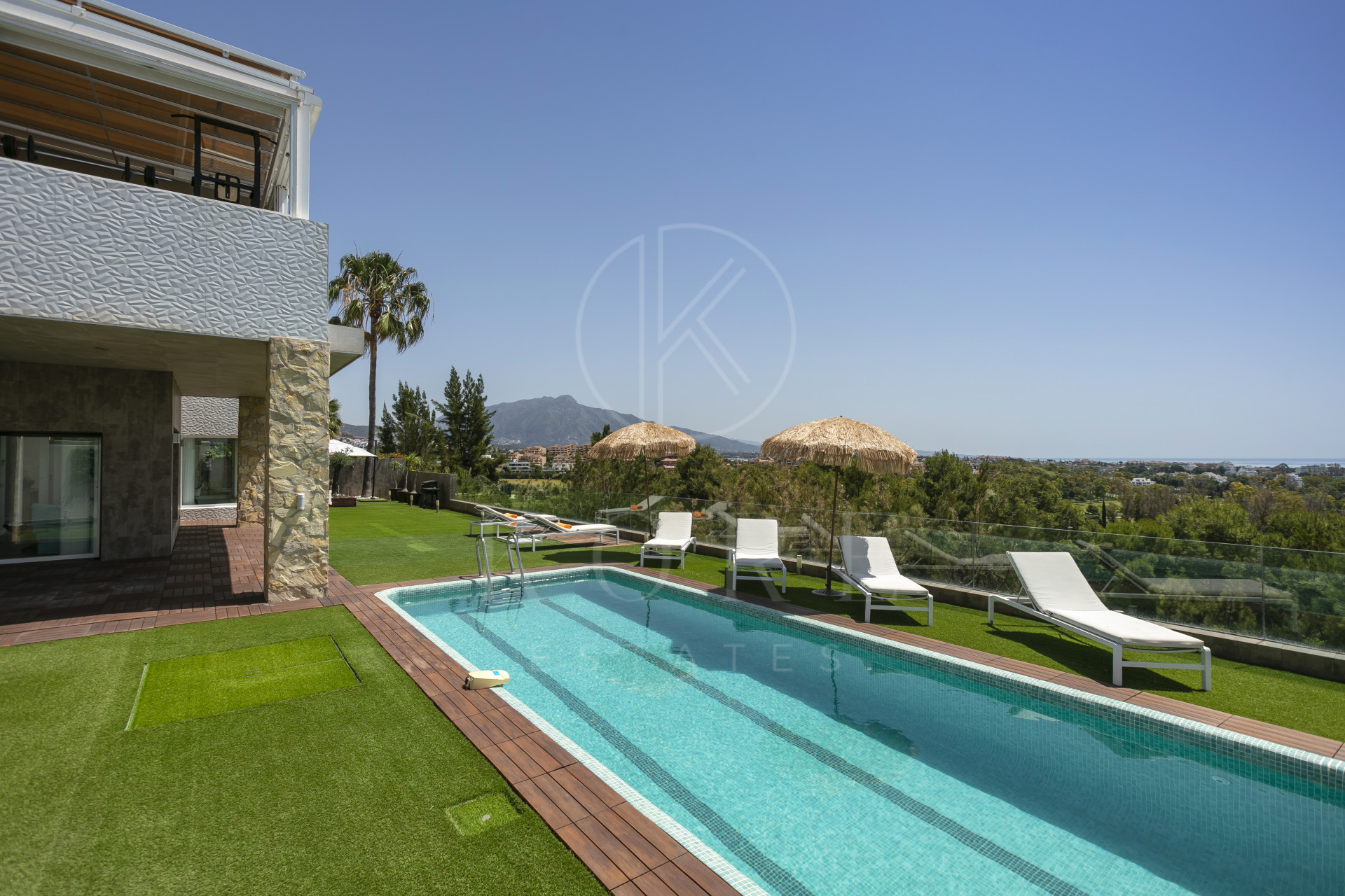Impresionante villa de cuatro dormitorios en primera línea de golf con orientación sur en venta en Nueva Atalaya, Benahavis, con impresionantes vistas panorámicas al mar, al golf y a La Concha. La casa está ubicada en una calle muy tranquila, en primera línea de golf Atalaya. La villa es muy privada y ha sido renovada recientemente. Está en excelentes condiciones y ha sido diseñado para un fácil mantenimiento. Hay una gran piscina climatizada con agua salada, jardín privado y terrazas exteriores muy bien decoradas, perfectas para cenar al aire libre y disfrutar de las fantásticas vistas panorámicas durante todo el día. La casa se distribuye de tres niveles; En la planta baja se encuentra el hall de entrada, aseo de invitados, amplio salón con chimenea con salida a una bonita terraza cubierta, zona de comedor con grandes ventanales y cocina independiente totalmente equipada. Los dormitorios en suite se distribuyen en las otras plantas. Hay estacionamiento para dos autos.