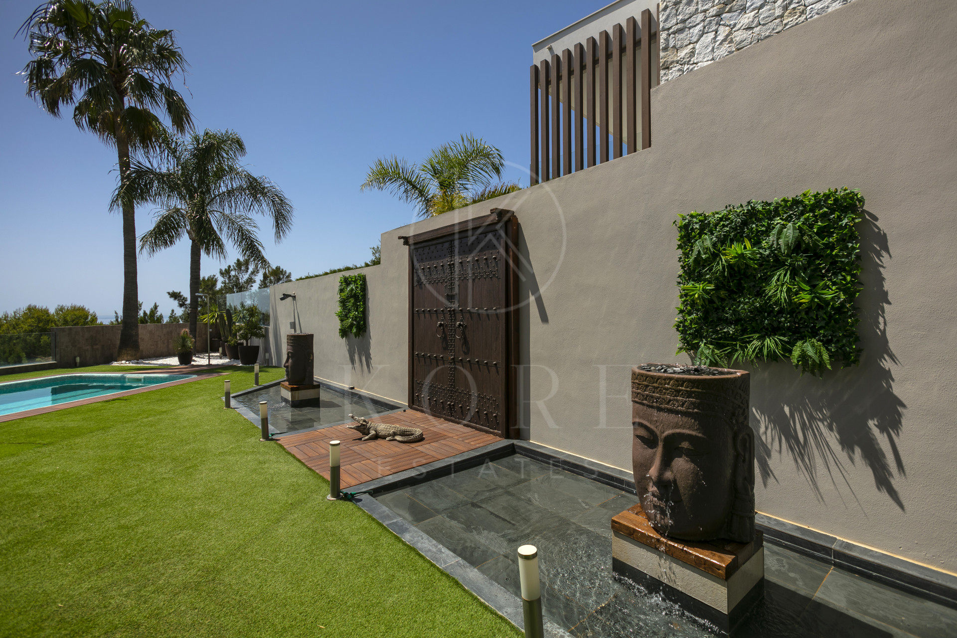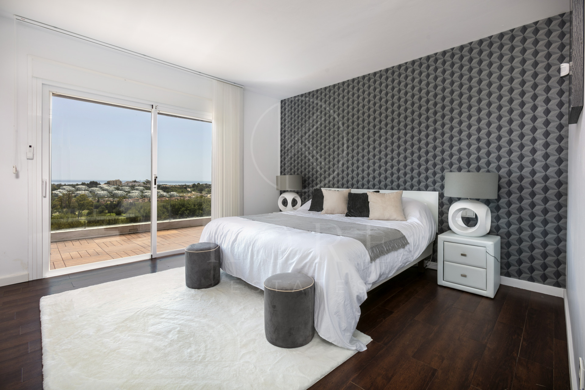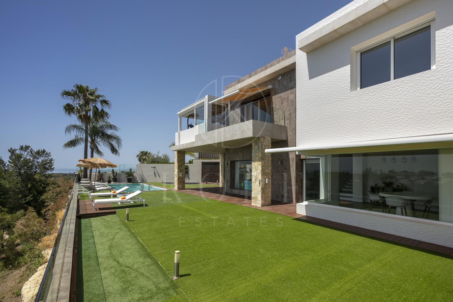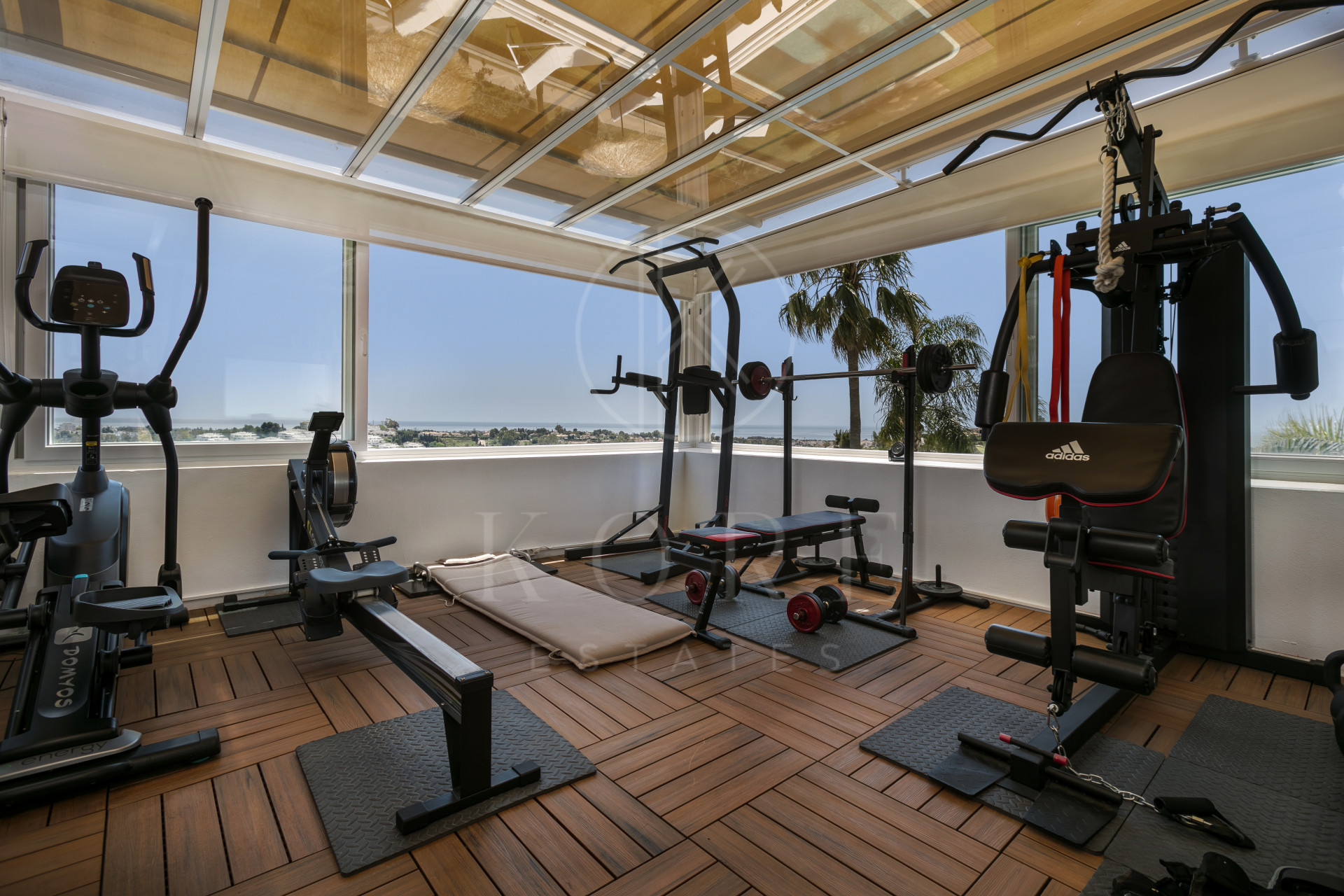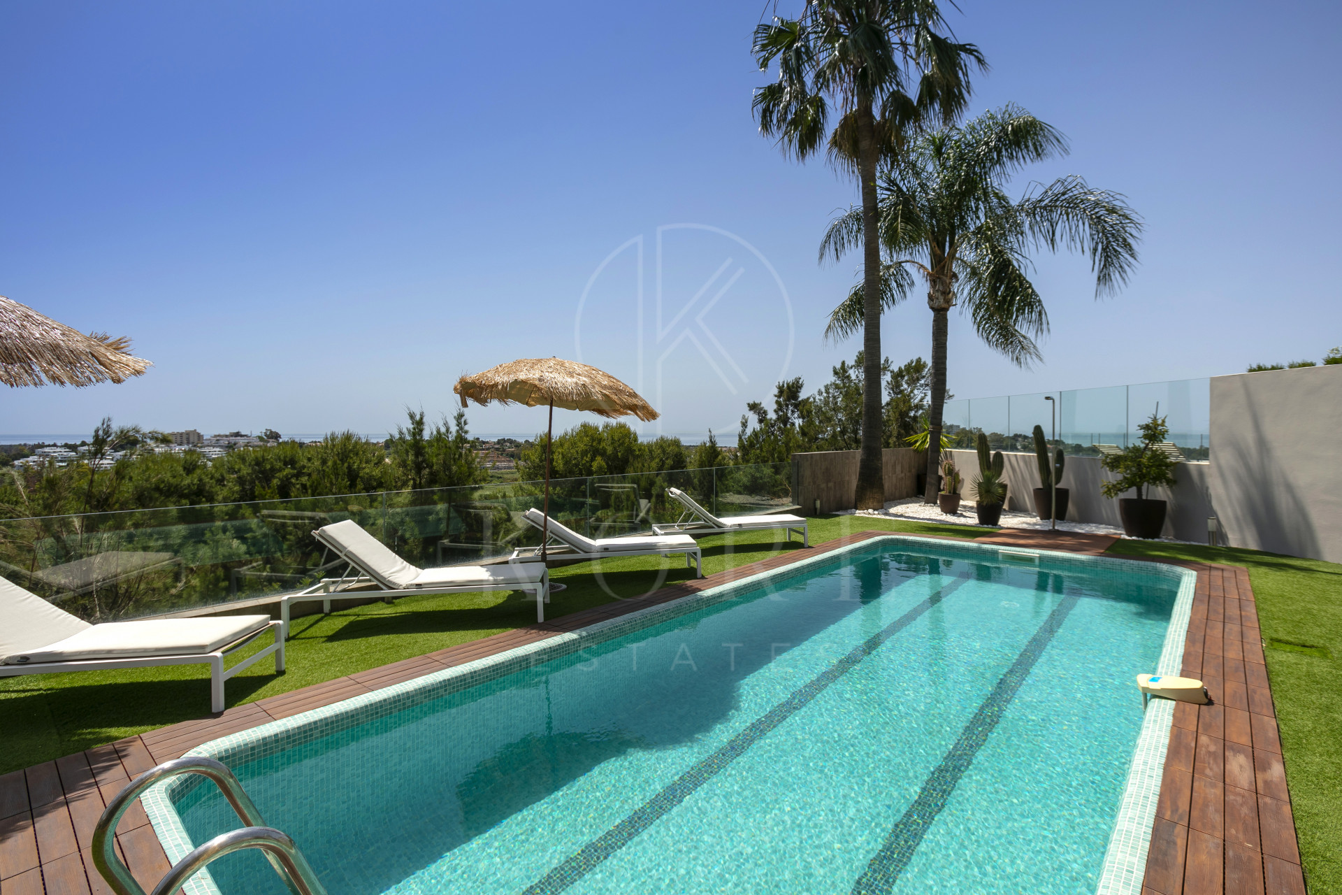 Impresionante villa de cuatro dormitorios en primera línea de golf con orientación sur en venta en Nueva Atalaya, Benahavis, con impresionantes vistas panorámicas al mar, al golf y a La Concha. La casa está ubicada en una calle muy tranquila, en primera línea de golf Atalaya. La villa es muy privada y ha sido renovada recientemente. Está en excelentes condiciones y ha sido diseñado para un fácil mantenimiento. Hay una gran piscina climatizada con agua salada, jardín privado y terrazas exteriores muy bien decoradas, perfectas para cenar al aire libre y disfrutar de las fantásticas vistas panorámicas durante todo el día. La casa se distribuye de tres niveles; En la planta baja se encuentra el hall de entrada, aseo de invitados, amplio salón con chimenea con salida a una bonita terraza cubierta, zona de comedor con grandes ventanales y cocina independiente totalmente equipada. Los dormitorios en suite se distribuyen en las otras plantas. Hay estacionamiento para dos autos.
