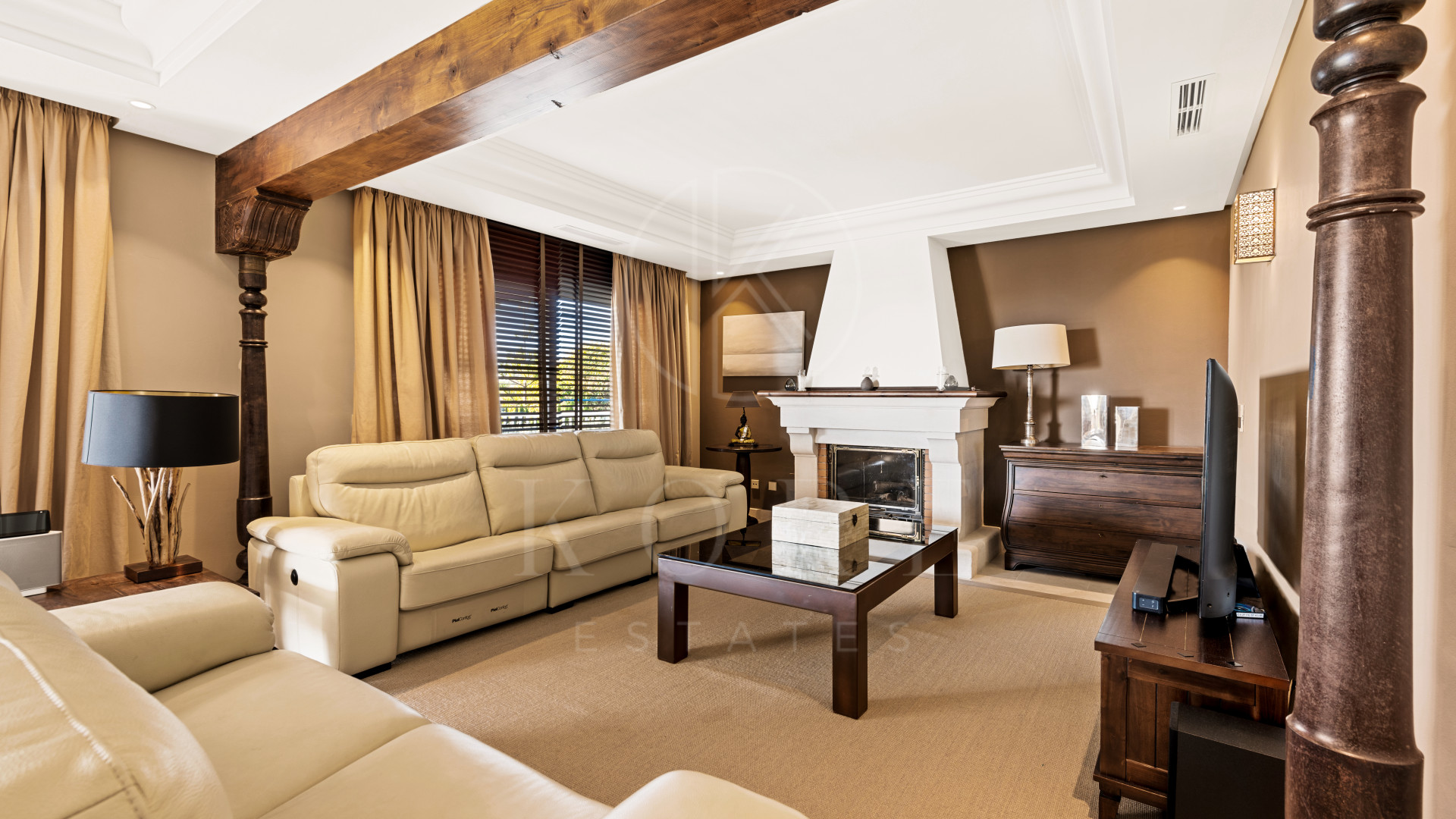 Esta villa de estilo clásico y cinco dormitorios cuenta con un amplio hall de entrada que conduce a una cocina de planta abierta con isla central. La cocina se abre directamente al jardín, ampliando el espacio vital al exterior. Junto a la cocina se encuentra el comedor y el salón principal, que incluye una chimenea. En la planta baja hay un dormitorio de invitados y un aseo.