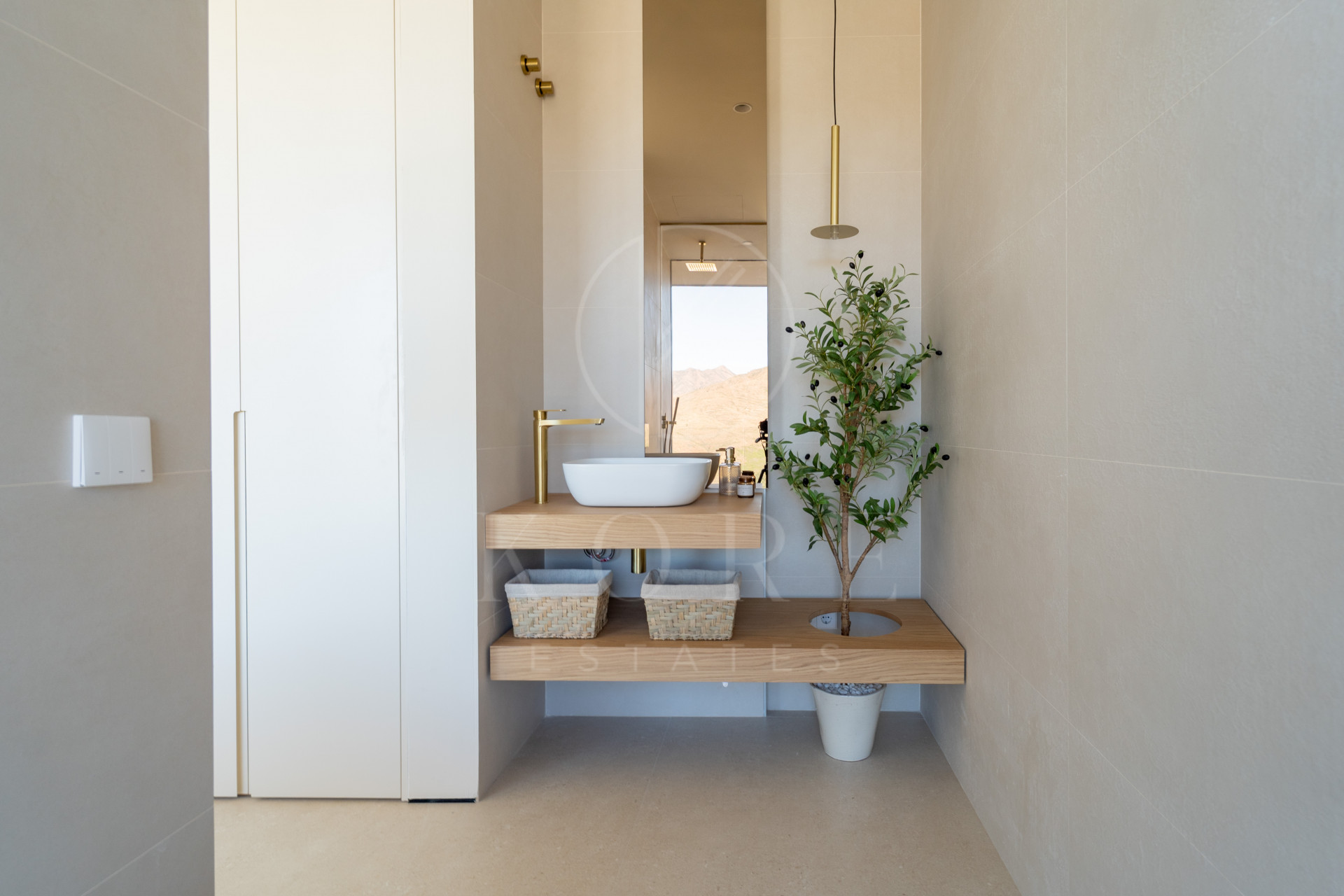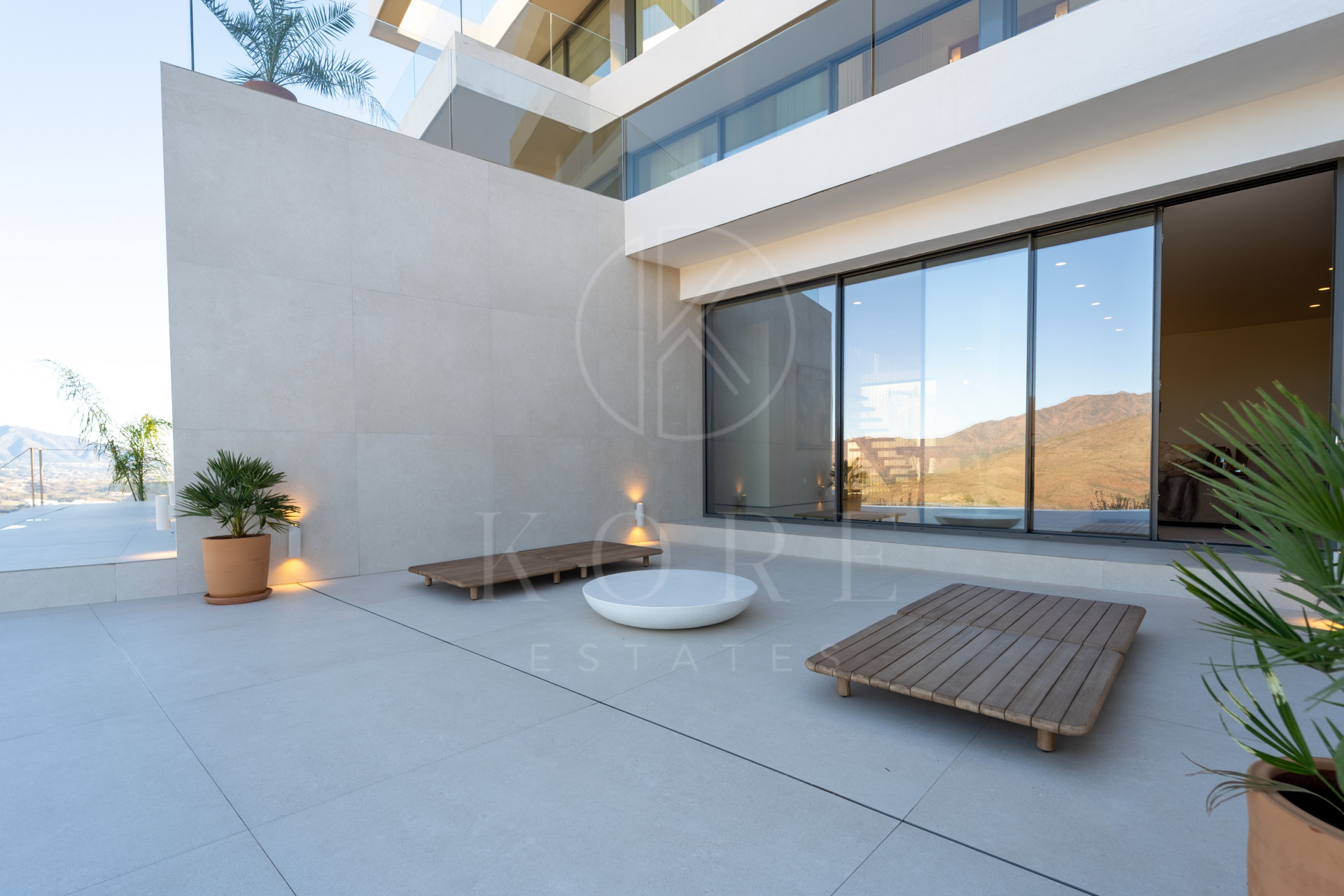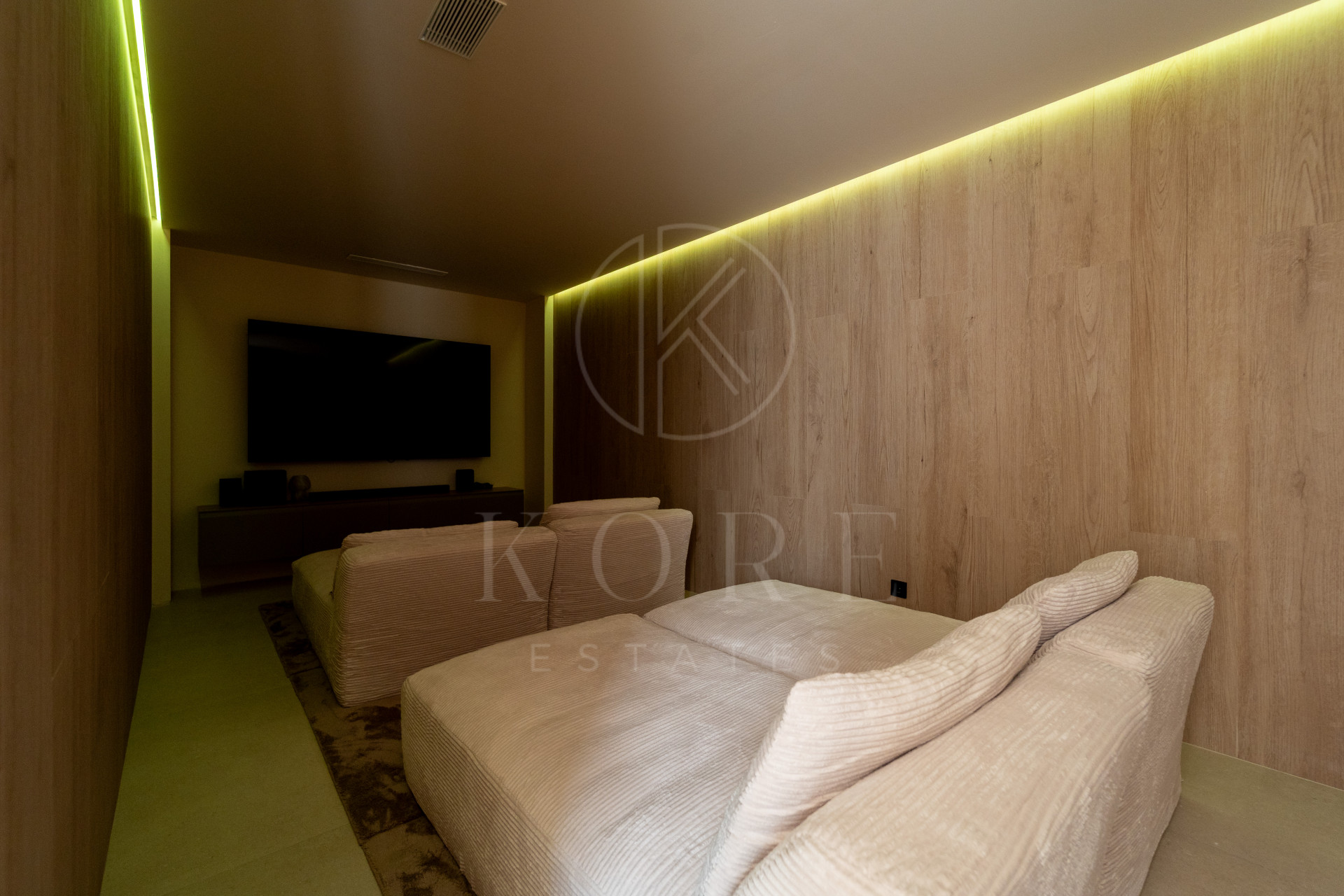 La planta baja ofrece un segundo salón con acceso directo al exterior, tres dormitorios, dos baños, una sala de cine, sauna, baño turco y una zona de gimnasio. Todas las plantas estarán conectadas por un ascensor panorámico de cristal (en proceso de instalación).