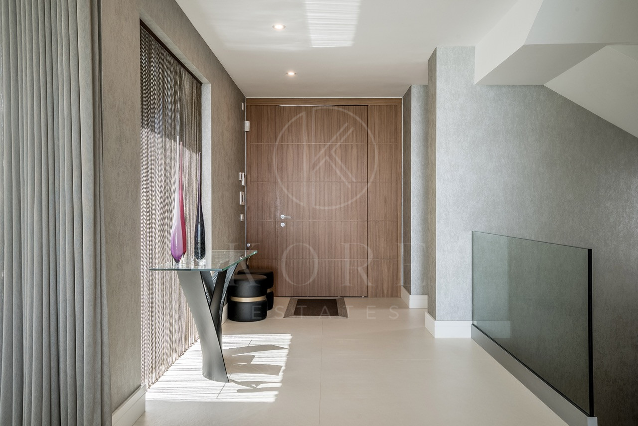 En su interior, la casa exude la sofisticación contemporánea. La sala de estar de planta abierta está mejorada por la iluminación de techo ambiente y una paleta de color neutro suave, creando un ambiente cálido y acogedor. El comedor fluye sin problemas en la cocina y las zonas sociales, lo que lo hace perfectamente adecuado tanto para la vida cotidiana como para ocasiones especiales. Un sistema de sonido interior / exterior de alta gama garantiza un entretenimiento sin esfuerzo en todas partes.
