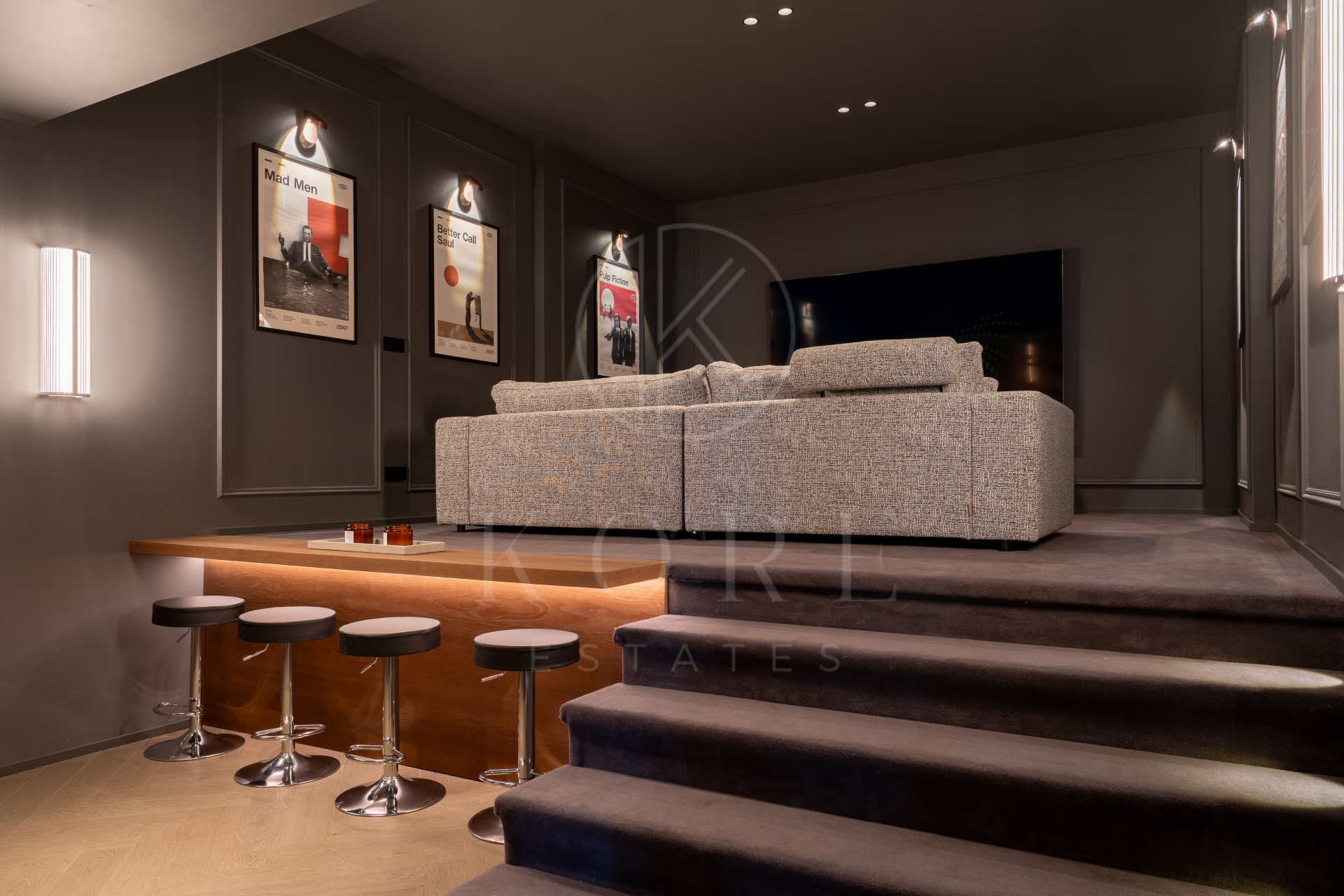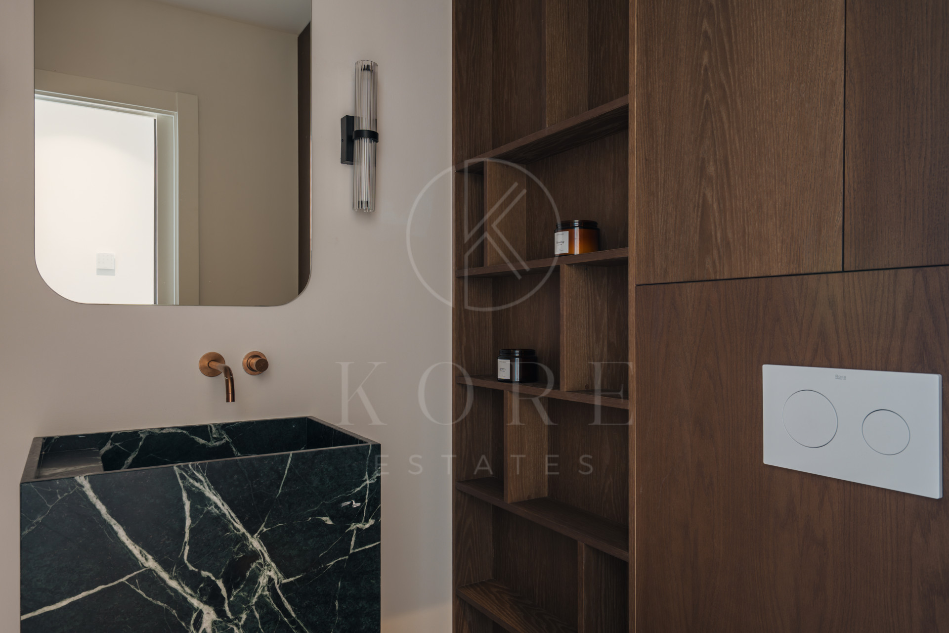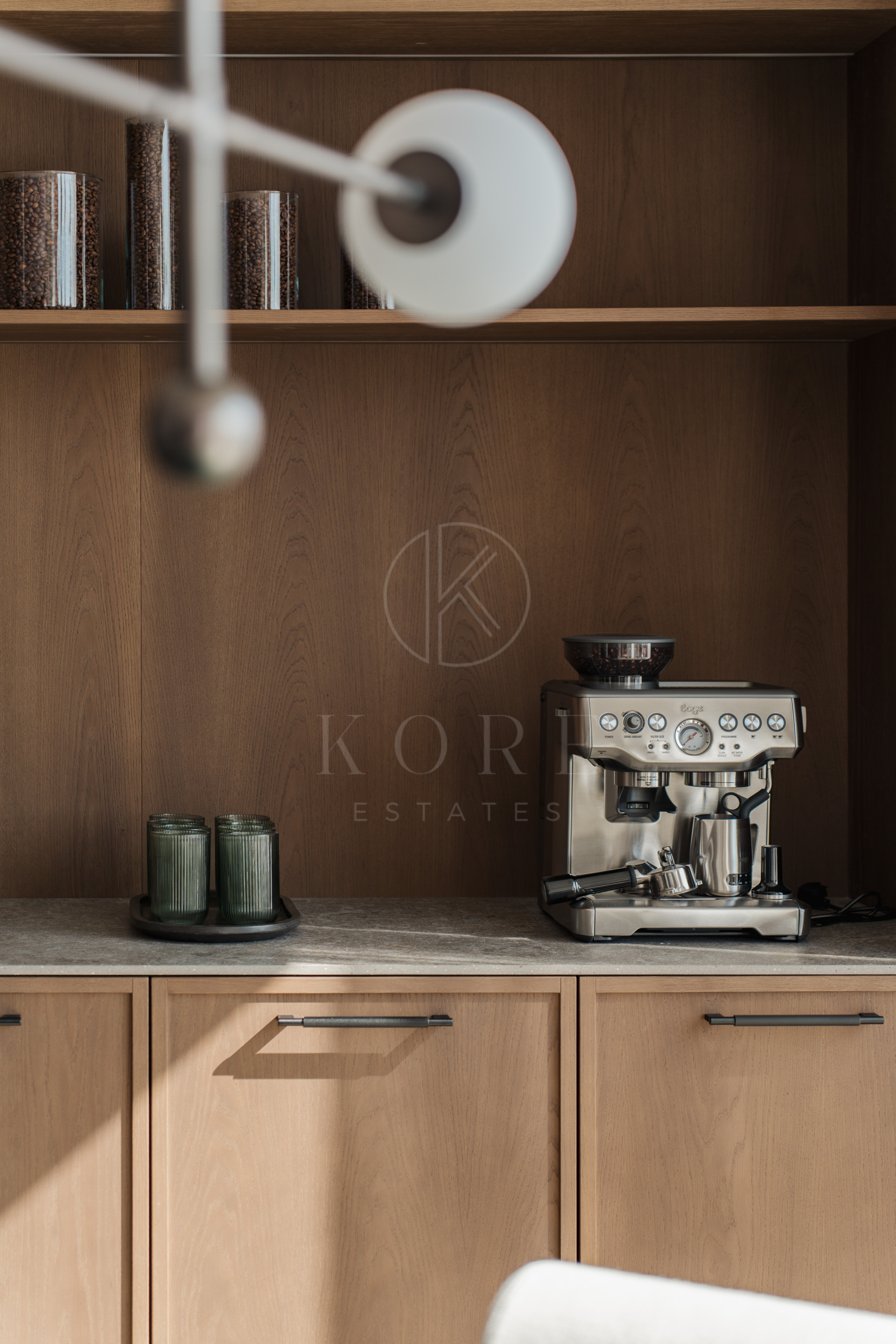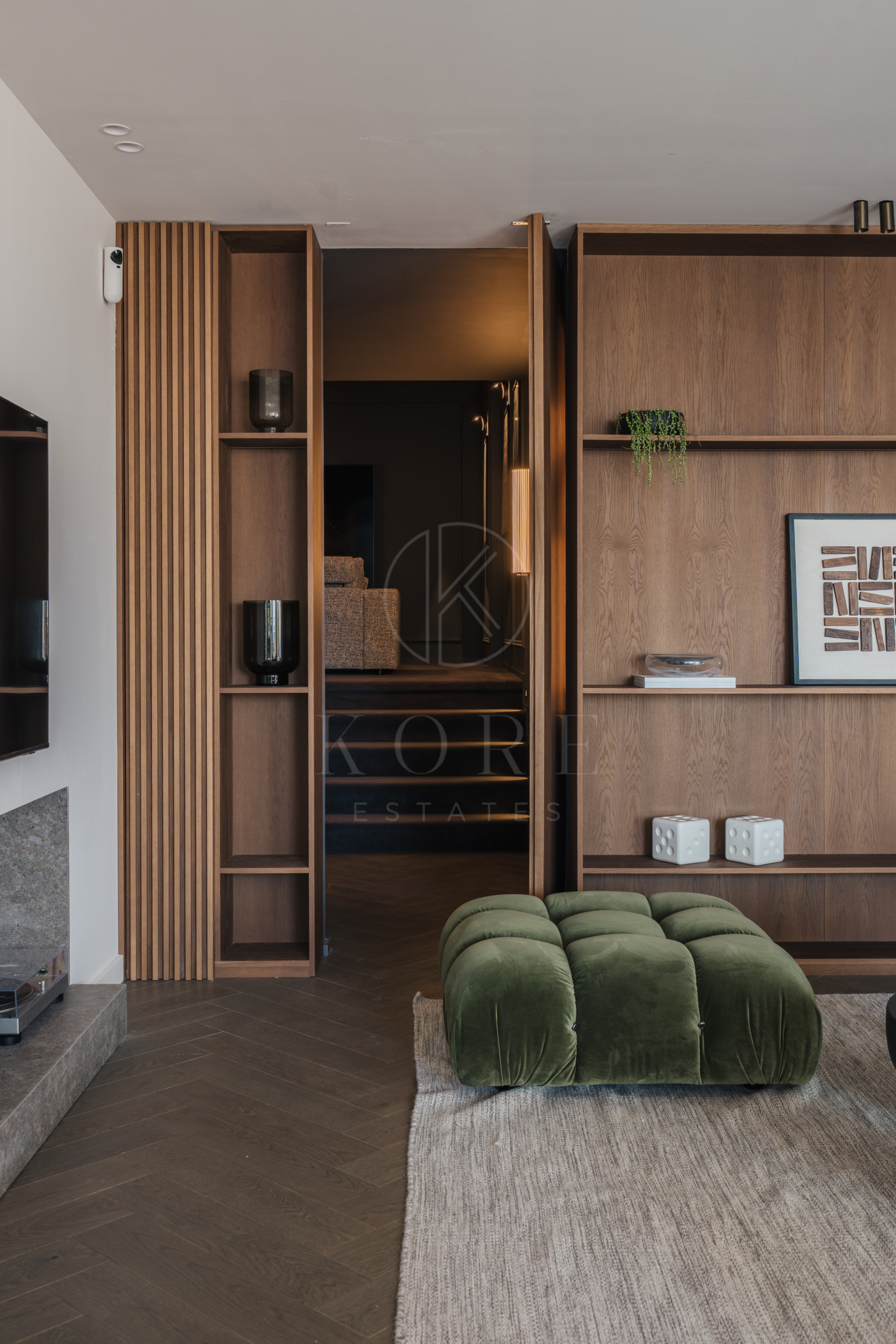 Esta propiedad excepcional presenta una refinada combinación de diseño de mediados de siglo y moderno, con materiales premium como roble oscuro y robusto, elegante suelo de parquet y revestimientos a medida de pequeño formato. Tonalidades sofisticadas de oliva y verde real aportan profundidad y carácter, creando un ambiente cálido pero contemporáneo en todo el espacio.