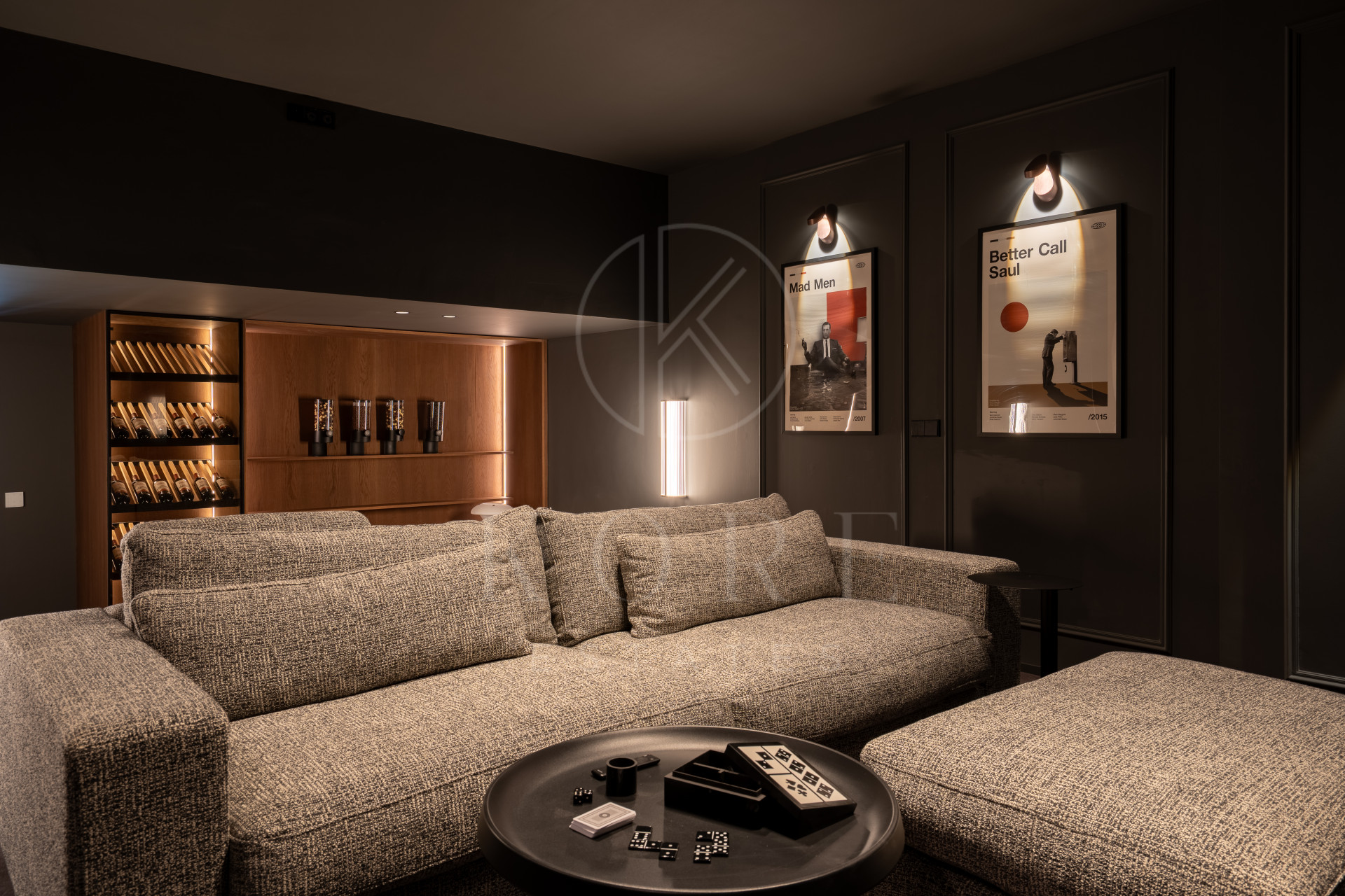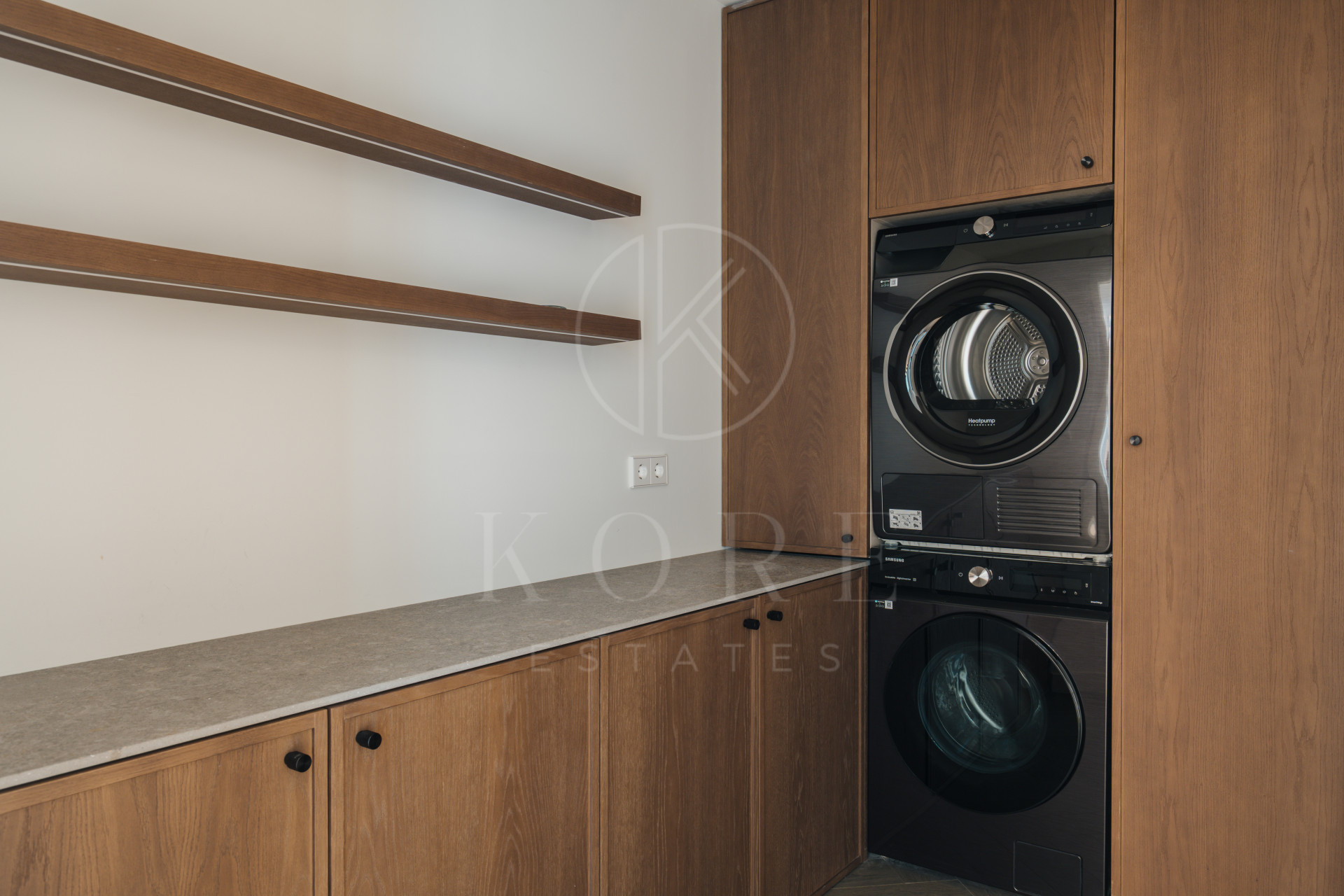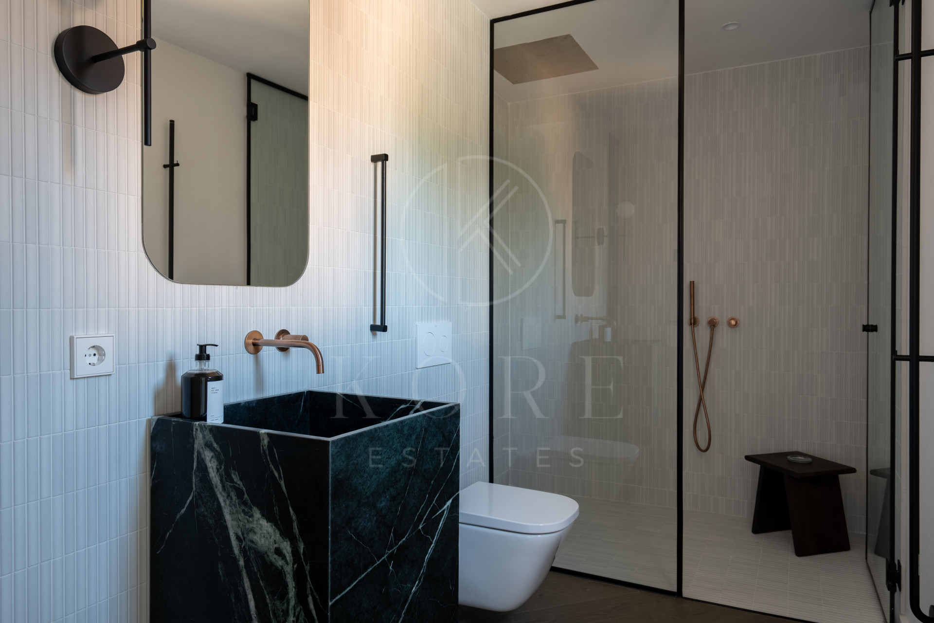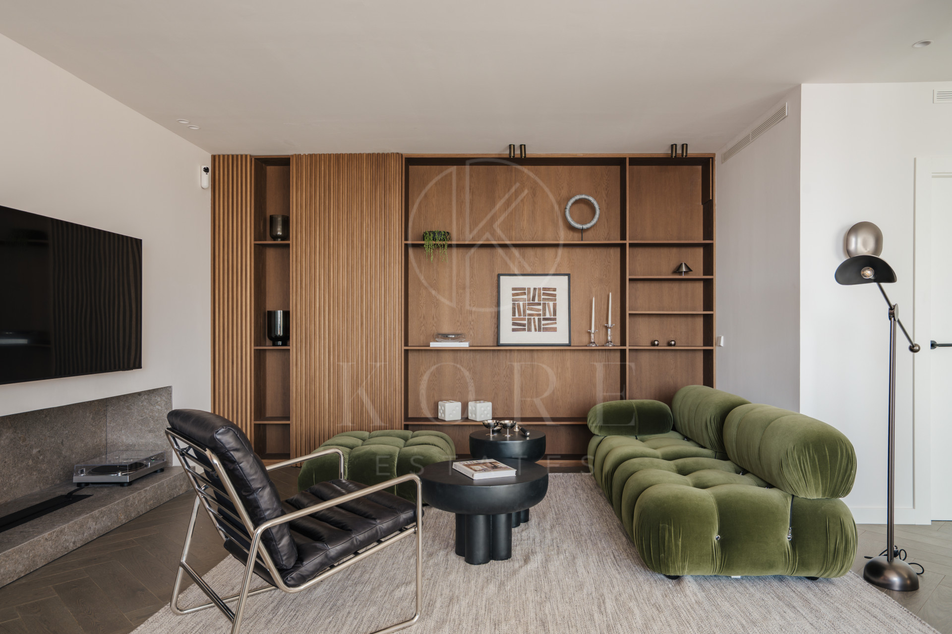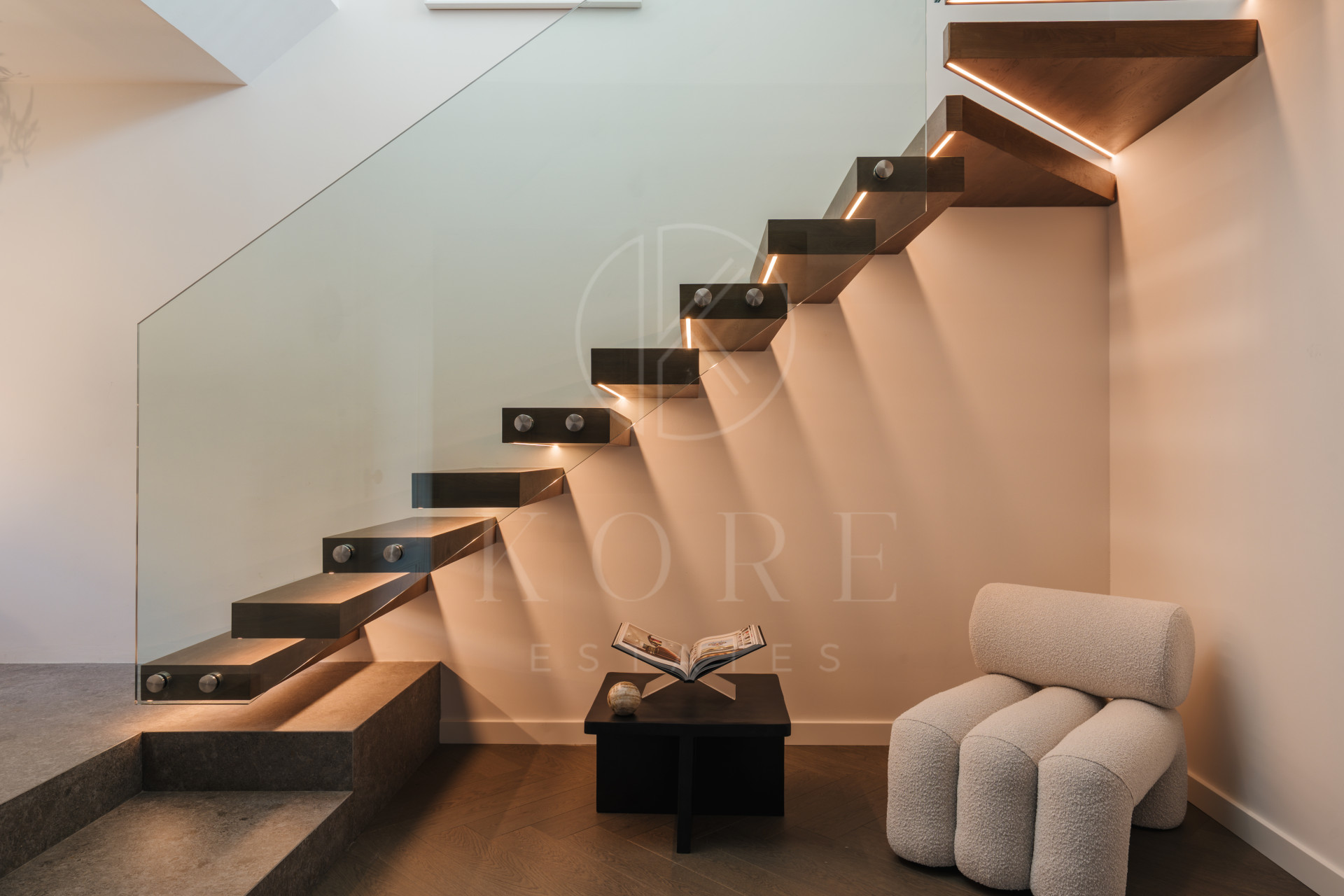 Esta propiedad excepcional presenta una refinada combinación de diseño de mediados de siglo y moderno, con materiales premium como roble oscuro y robusto, elegante suelo de parquet y revestimientos a medida de pequeño formato. Tonalidades sofisticadas de oliva y verde real aportan profundidad y carácter, creando un ambiente cálido pero contemporáneo en todo el espacio.