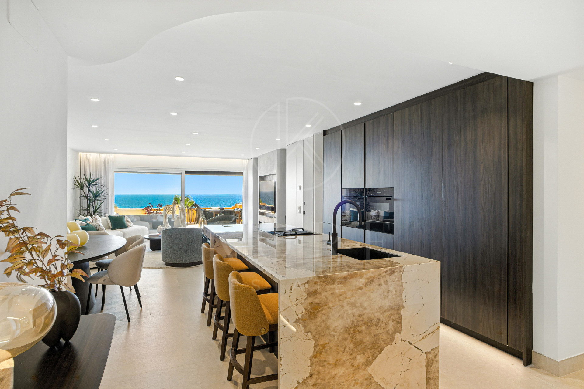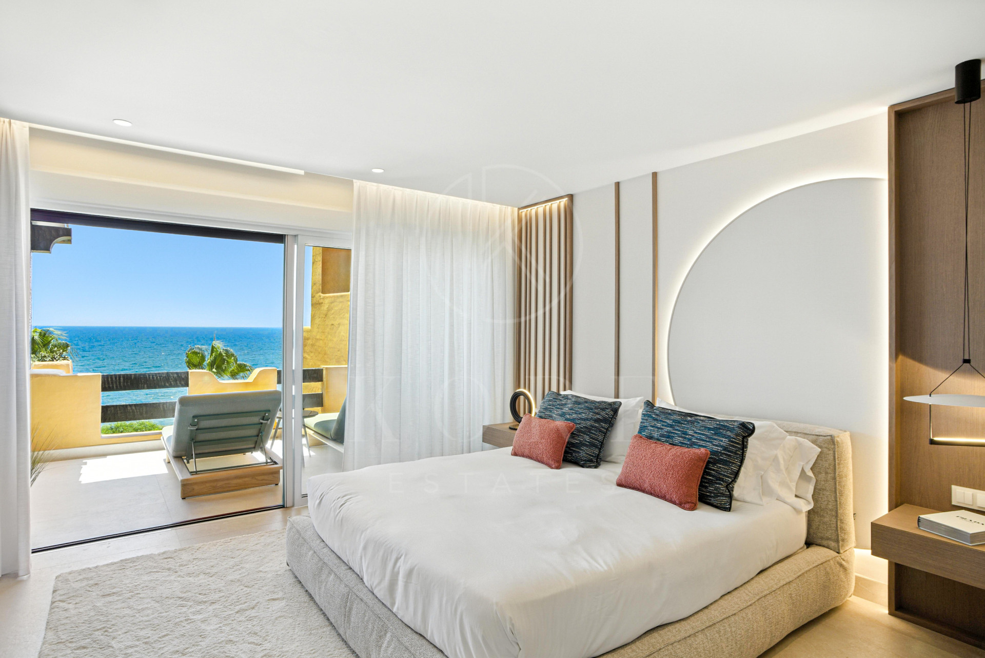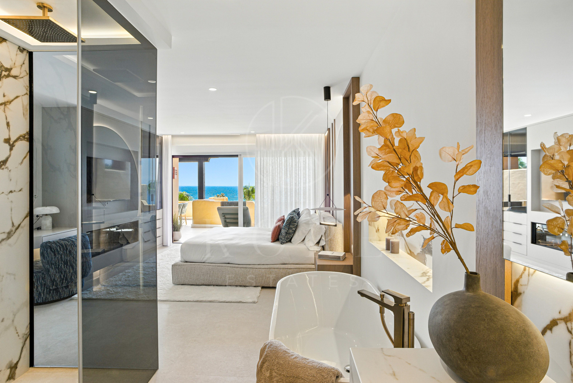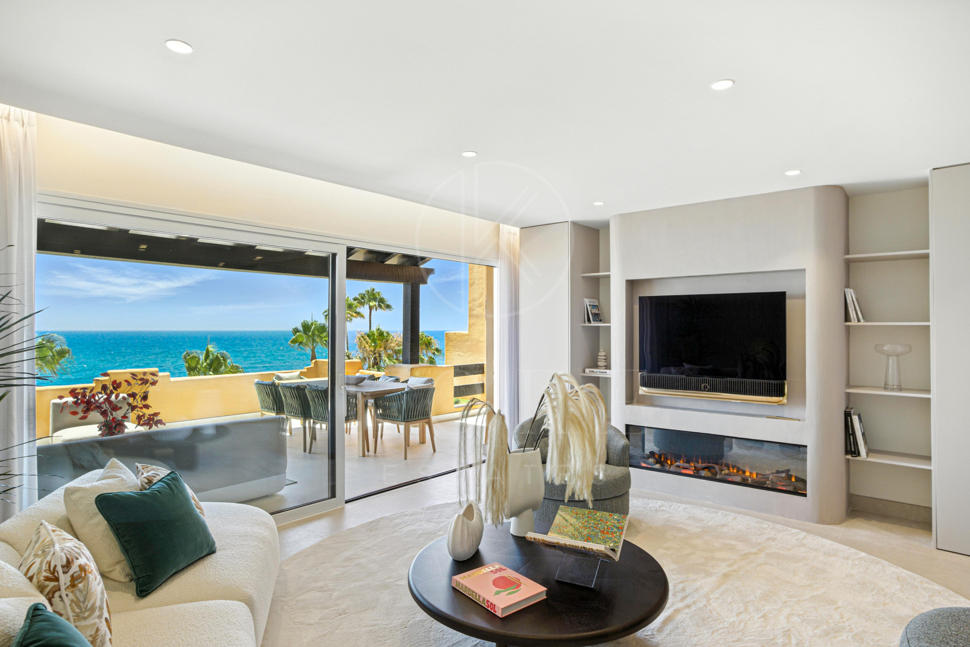 Precioso frente a la playa, apartamento orientado al sur con cuatro amplios dormitorios y tres baños modernos, combinando un diseño sofisticado con una vida inmejorable frente a la playa. La lujosa suite principal cuenta con baño en suite, walk-in closet y acceso a una amplia terraza con impresionantes vistas panorámicas del Mediterráneo. La sala de estar y comedor de planta abierta también se abre directamente a la terraza, creando un flujo interior sin costuras. Los acabados Premium incluyen un sistema de sonido B plagaamp;O, nevera de vino, segunda cocina, chimenea eléctrica, bañera independiente, oficina dedicada, lavadero y calefacción por suelo radiante. Situado en el prestigioso Los Granados del Mar en la Nueva Milla de Oro, la residencia ofrece acceso directo a la playa y servicios de primera clase como dos piscinas al aire libre, una piscina cubierta climatizada, gimnasio, sauna, jacuzzi, restaurante in situ, seguridad 24 horas y jardines inmaculados. Idealmente situado cerca del complejo Laguna, centro Estepona, restaurantes de alta gama, tiendas y escuelas internacionales, este es el lujoso litoral que vive en su mejor.