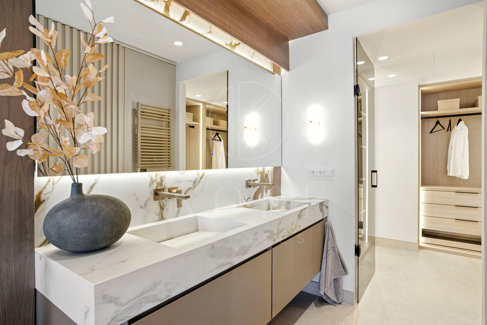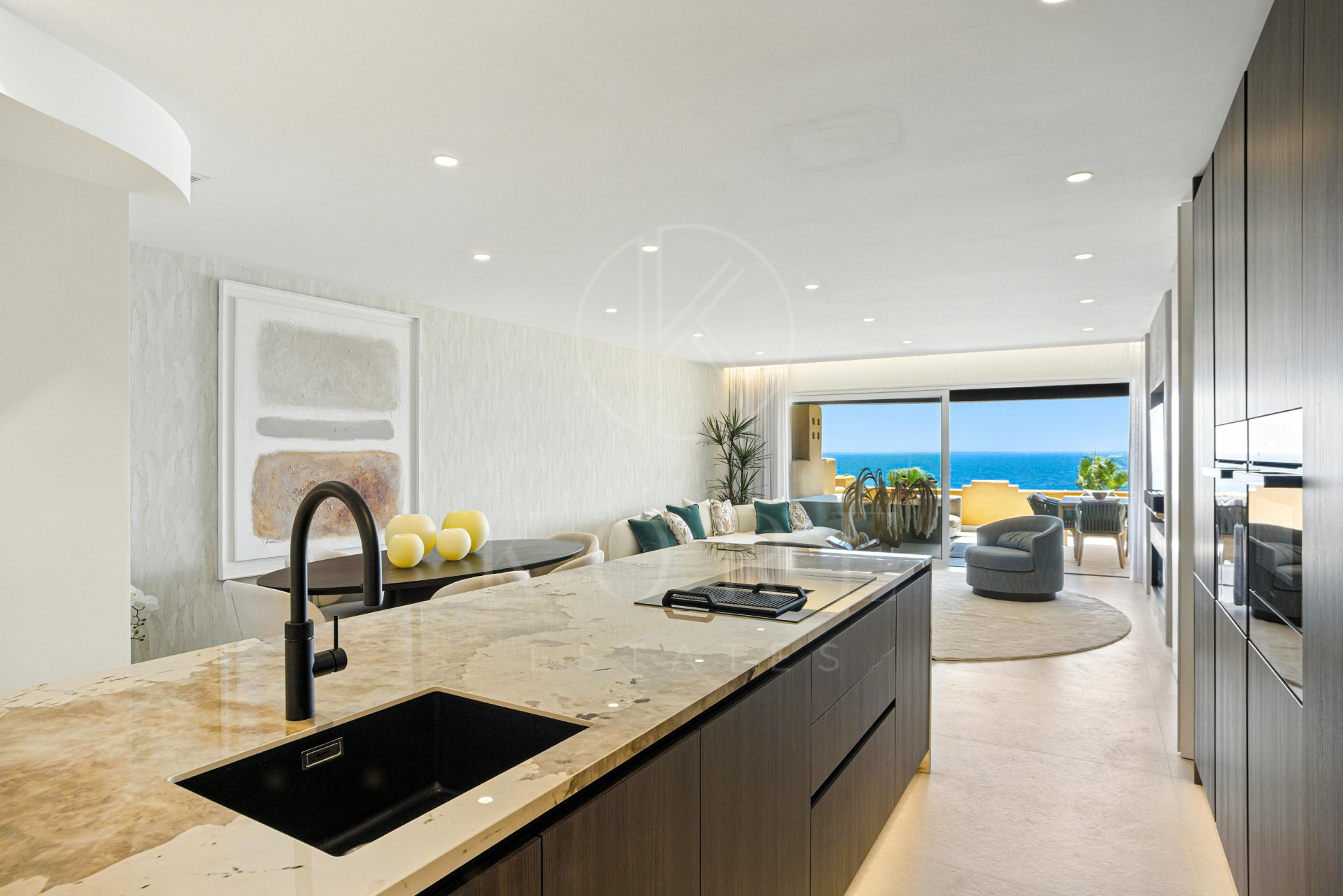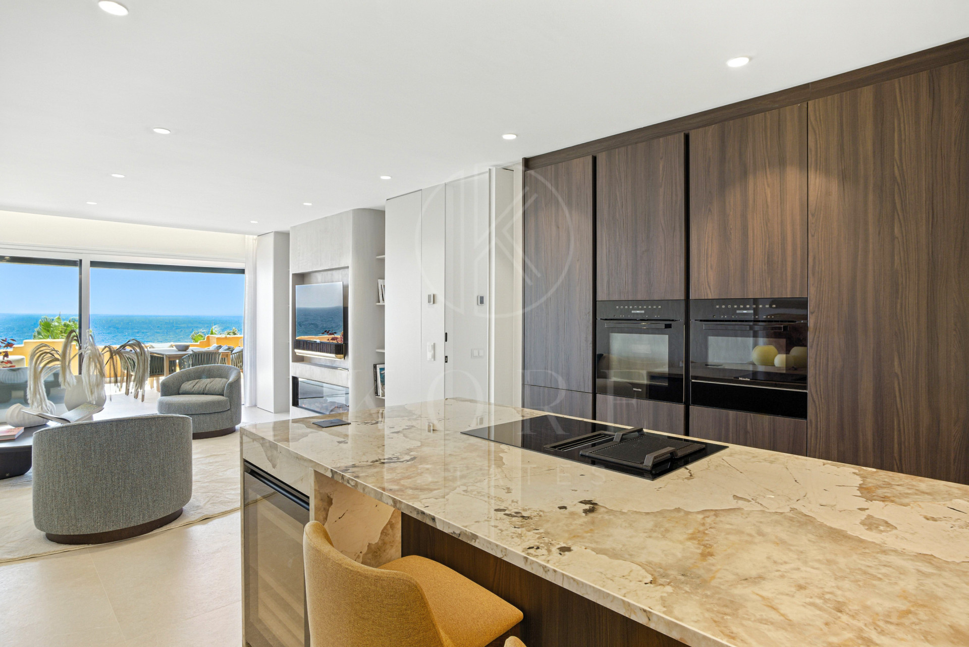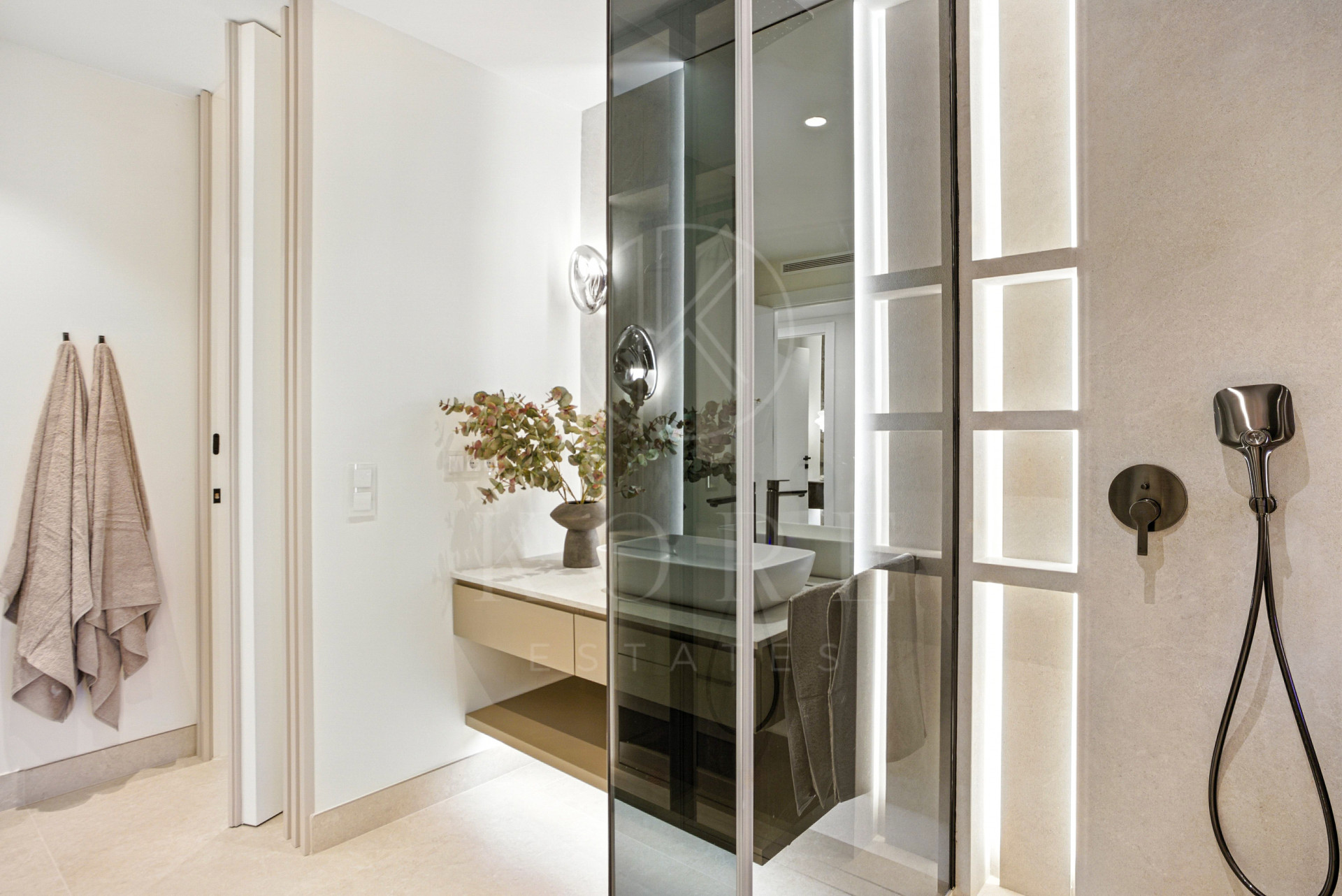 Precioso frente a la playa, apartamento orientado al sur con cuatro amplios dormitorios y tres baños modernos, combinando un diseño sofisticado con una vida inmejorable frente a la playa. La lujosa suite principal cuenta con baño en suite, walk-in closet y acceso a una amplia terraza con impresionantes vistas panorámicas del Mediterráneo. La sala de estar y comedor de planta abierta también se abre directamente a la terraza, creando un flujo interior sin costuras. Los acabados Premium incluyen un sistema de sonido B plagaamp;O, nevera de vino, segunda cocina, chimenea eléctrica, bañera independiente, oficina dedicada, lavadero y calefacción por suelo radiante. Situado en el prestigioso Los Granados del Mar en la Nueva Milla de Oro, la residencia ofrece acceso directo a la playa y servicios de primera clase como dos piscinas al aire libre, una piscina cubierta climatizada, gimnasio, sauna, jacuzzi, restaurante in situ, seguridad 24 horas y jardines inmaculados. Idealmente situado cerca del complejo Laguna, centro Estepona, restaurantes de alta gama, tiendas y escuelas internacionales, este es el lujoso litoral que vive en su mejor.