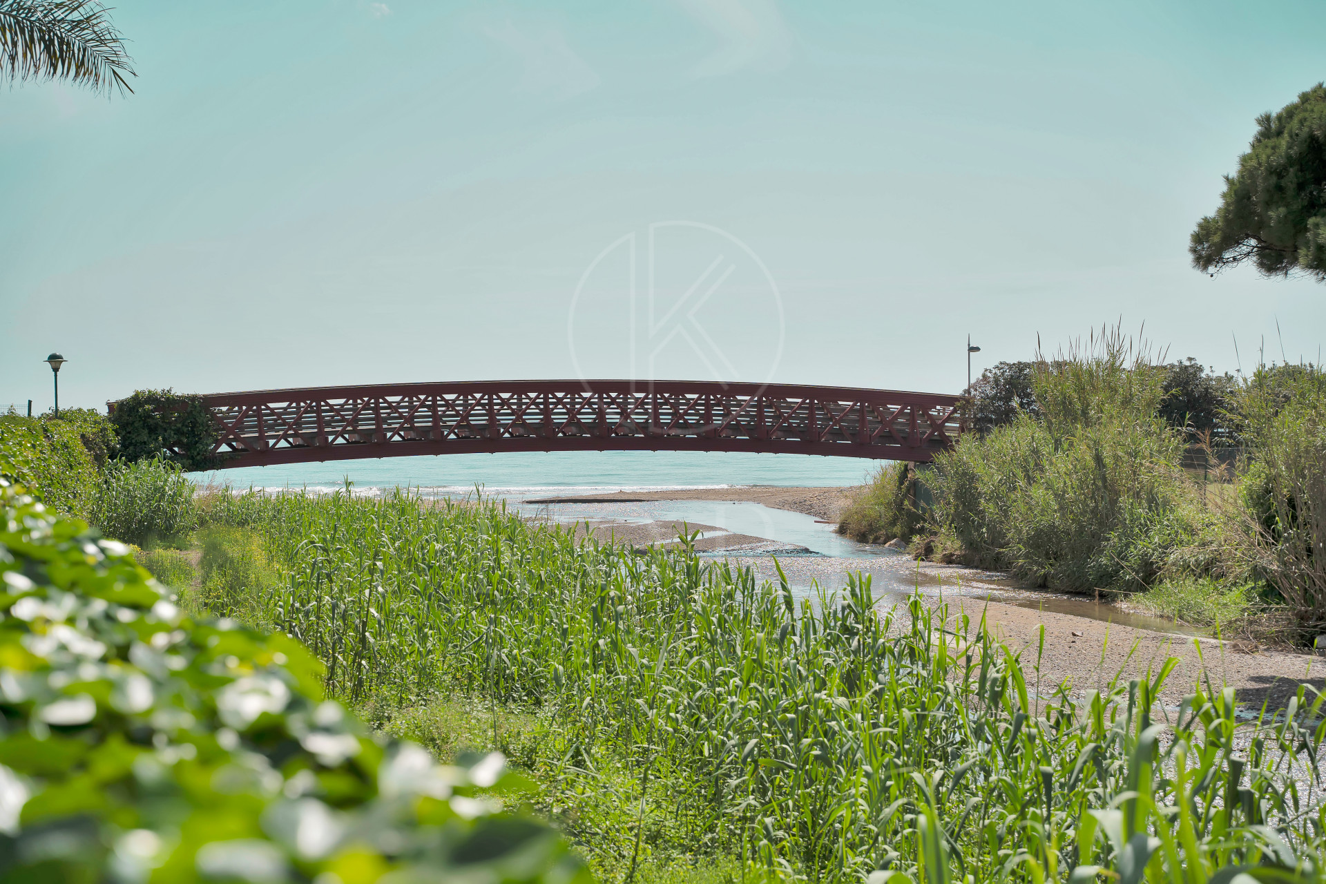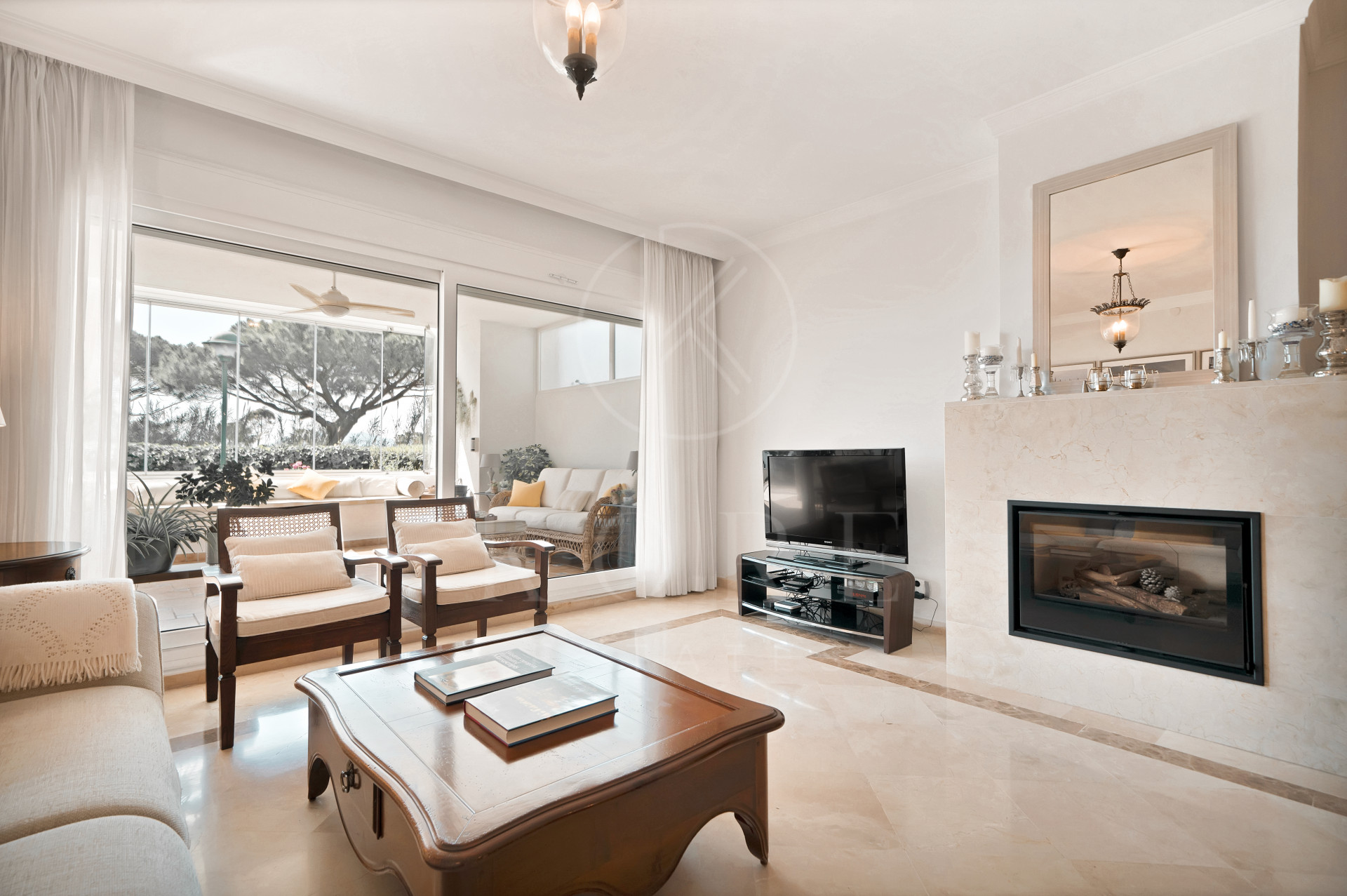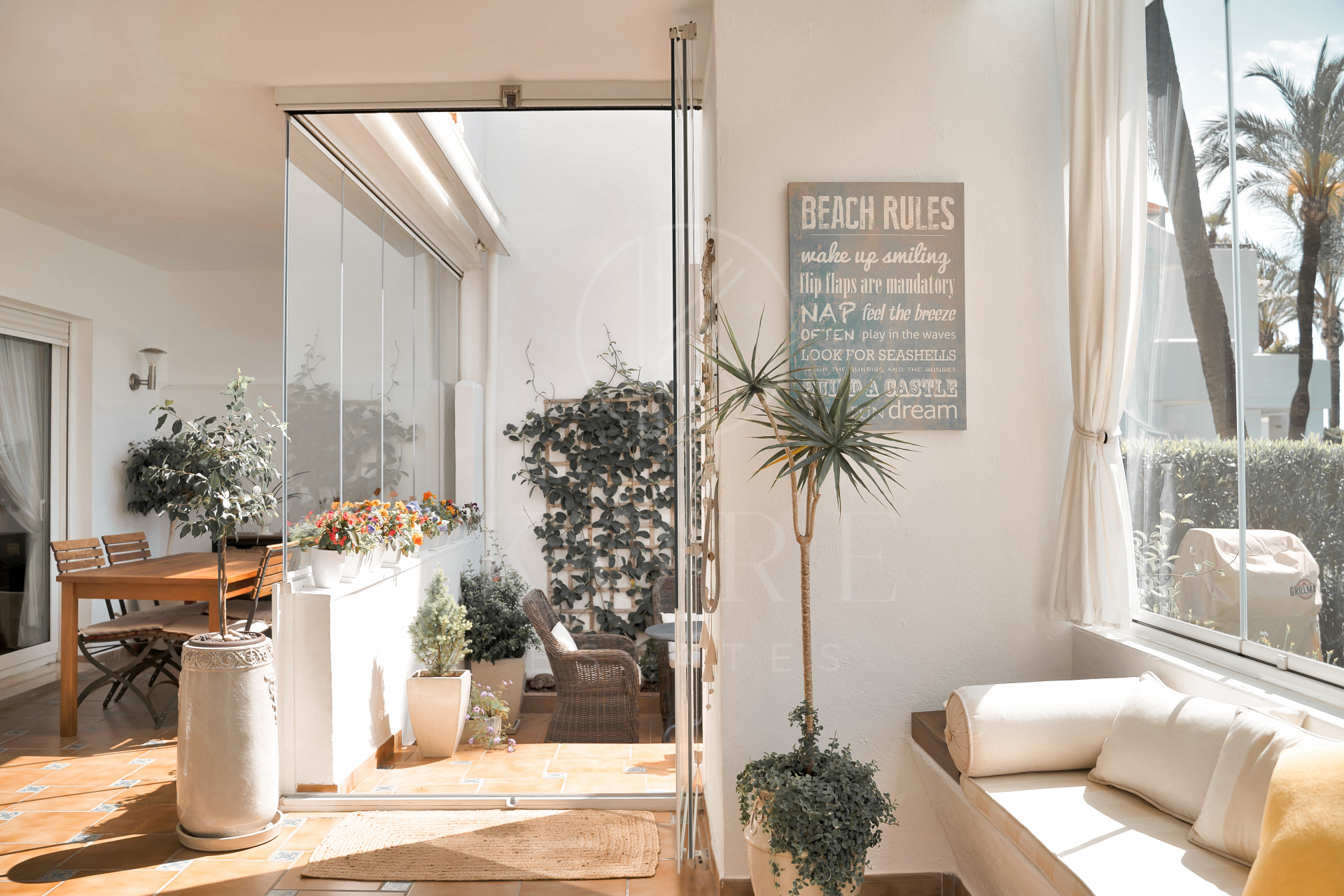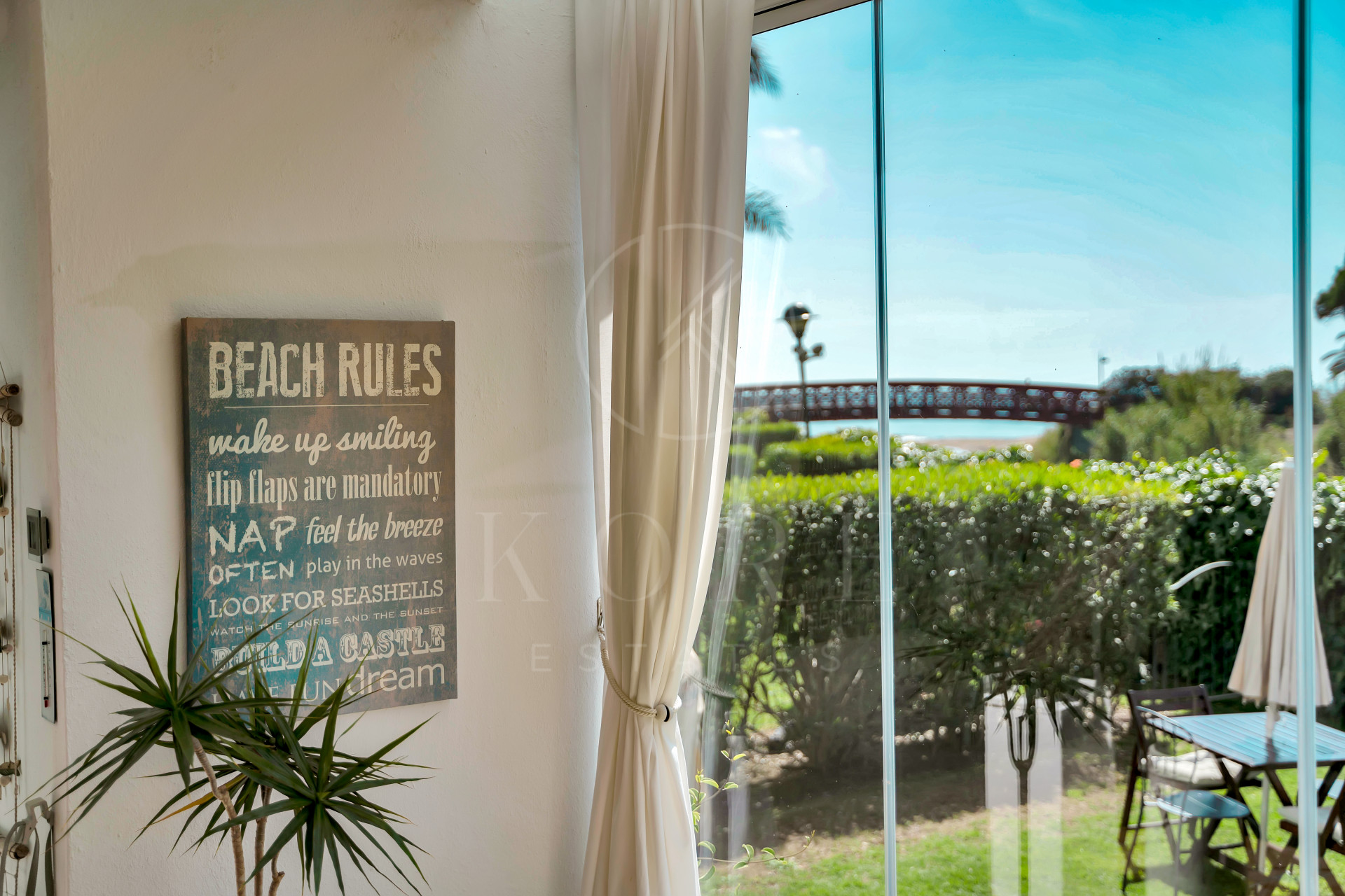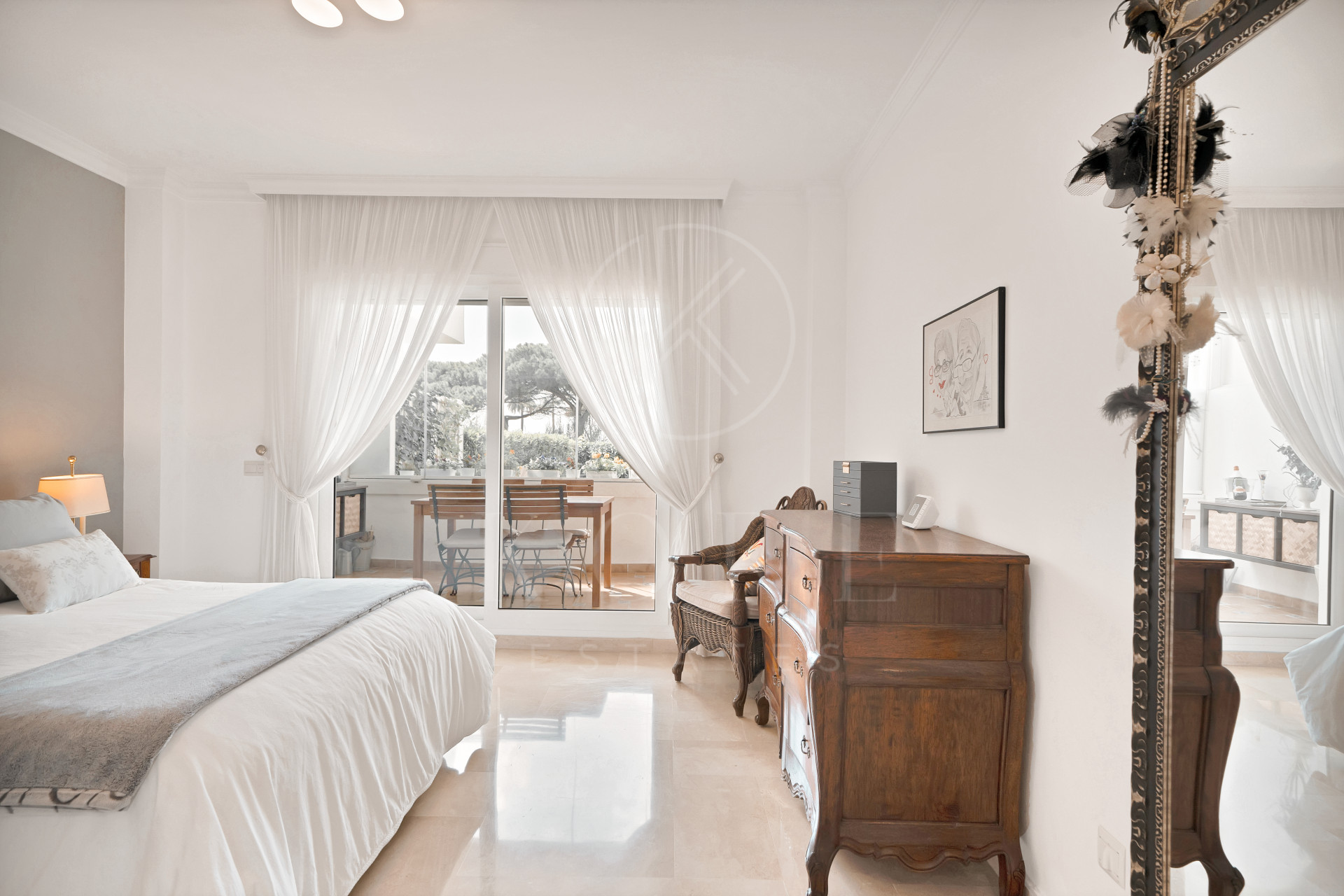 Ubicación Privilegiada: Situado en una de las urbanizaciones más exclusivas en primera línea de playa, con acceso directo al mar y al paseo marítimo.Espacios Amplios y Luminosos: Dispone de un amplio salón-comedor con chimenea, ideal para disfrutar en familia o con invitados. Los grandes ventanales y el acceso directo al jardín privado aportan una atmósfera luminosa y abierta, con vistas despejadas al mar y al campo de golf.Jardín Privado y Terraza: Disfruta del aire libre con estilo gracias al jardín privado, perfecto para cenas al aire libre o simplemente relajarse sintiendo la brisa marina. La generosa terraza ofrece un espacio adicional para disfrutar del entorno natural.Dos Dormitorios en Suite: Ambos dormitorios cuentan con baño privado y armarios empotrados, ofreciendo privacidad, confort y acabados de alta calidad. El diseño ha sido cuidadosamente pensado para una experiencia de vida óptima.Comodidades Modernas: Calefacción por suelo radiante en los baños, aire acondicionado frío/calor, y persianas eléctricas en todas las ventanas para mayor comodidad y seguridad.Trastero y Plaza de Garaje: Incluye una plaza de aparcamiento asignada y un práctico trastero para mayor funcionalidad.Zonas Comunes Exclusivas: La urbanización ofrece servicios de estilo resort, incluyendo dos piscinas, exuberantes jardines tropicales y seguridad 24 horas para total tranquilidad.Con una ubicación inmejorable y características de primer nivel, este apartamento representa una oportunidad única para quienes buscan lo mejor en estilo de vida junto al mar.