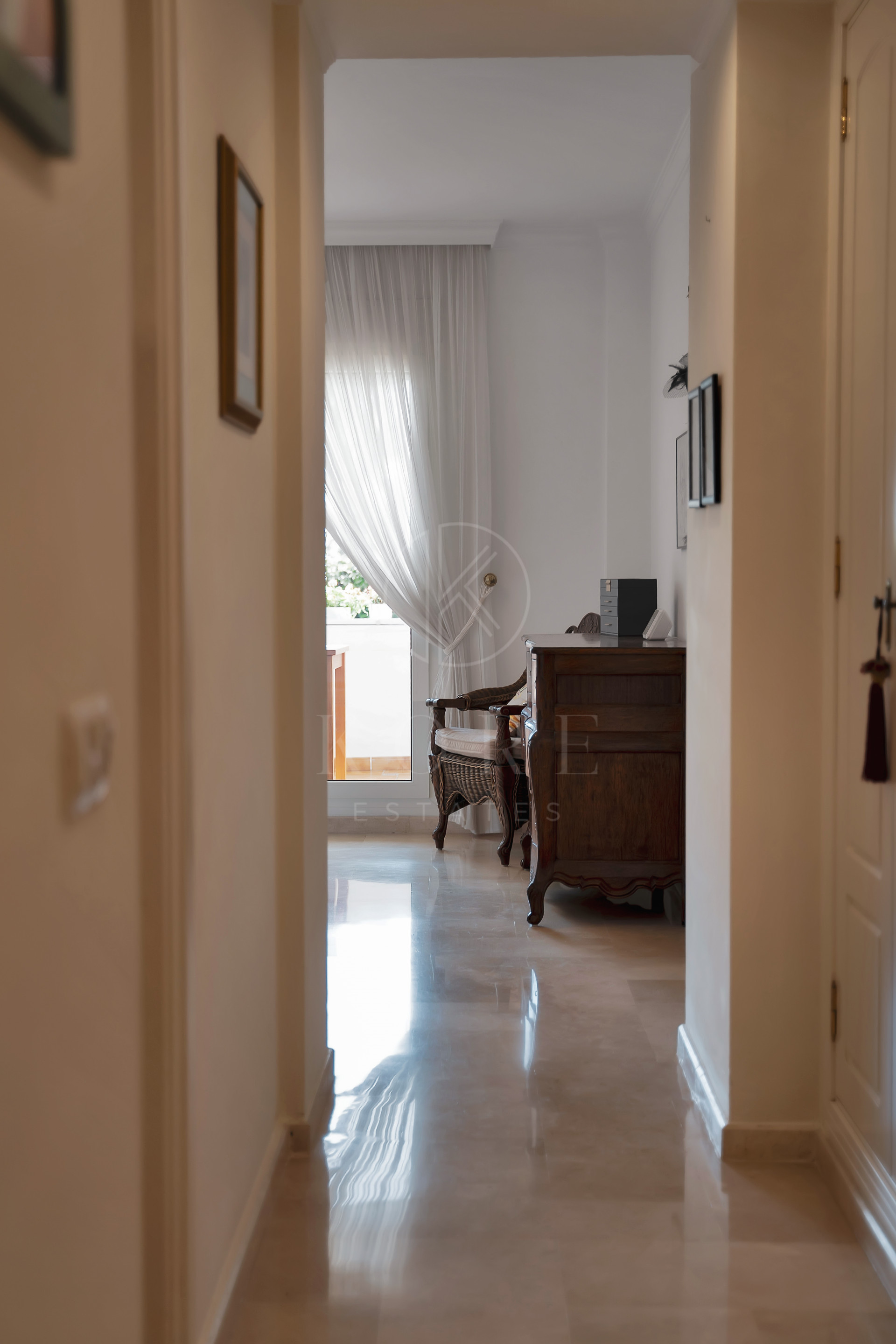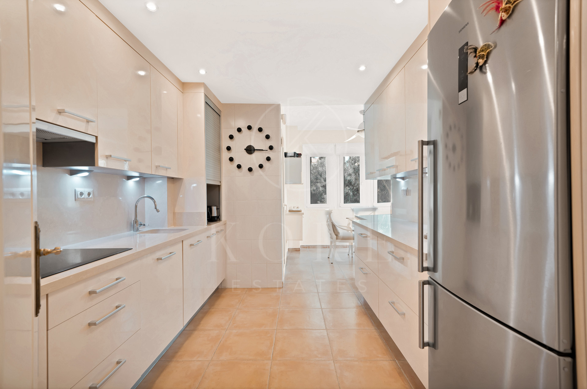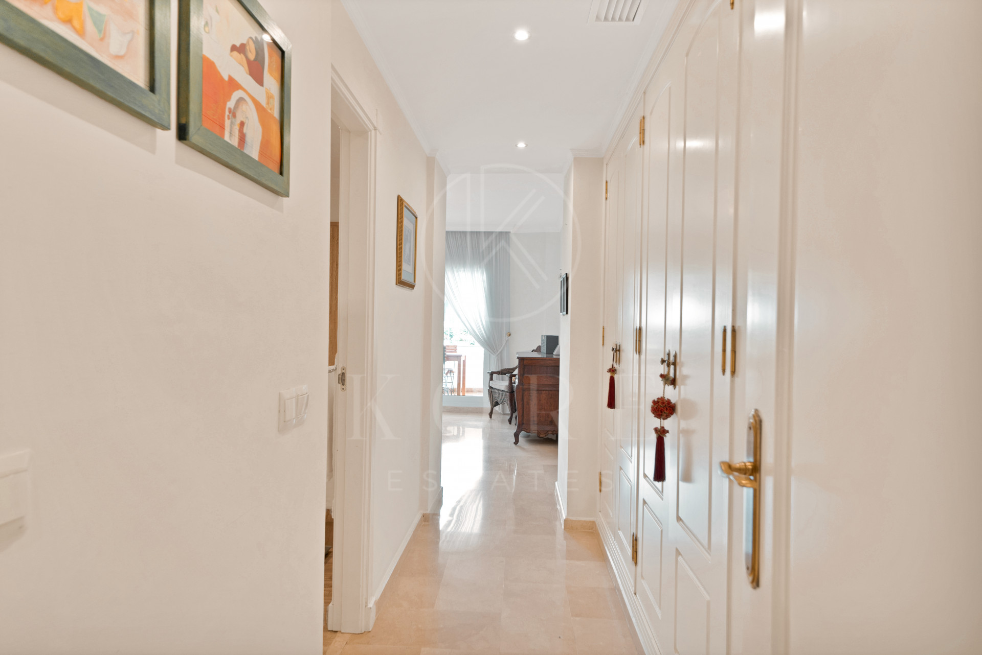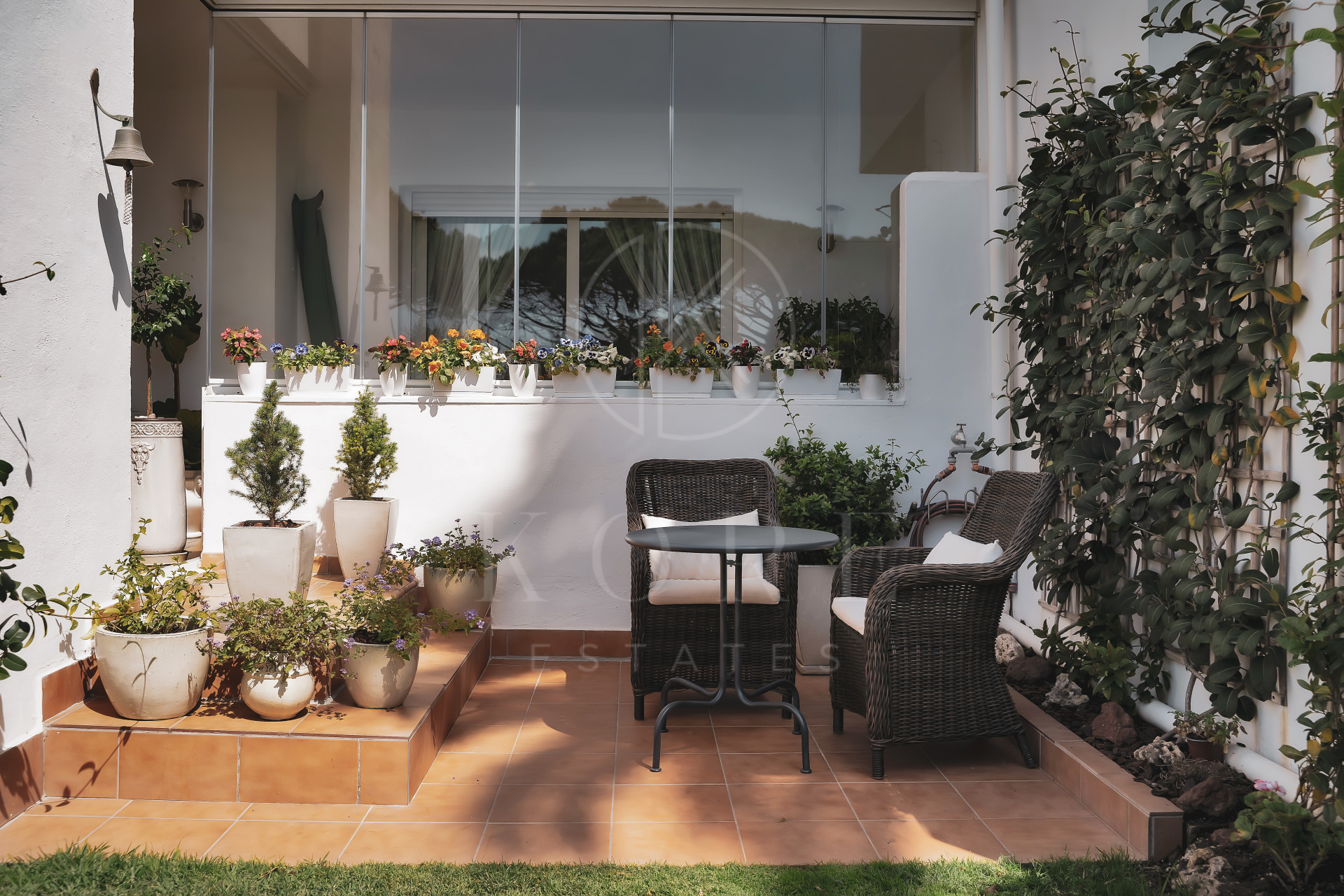 Ubicación Privilegiada: Situado en una de las urbanizaciones más exclusivas en primera línea de playa, con acceso directo al mar y al paseo marítimo.Espacios Amplios y Luminosos: Dispone de un amplio salón-comedor con chimenea, ideal para disfrutar en familia o con invitados. Los grandes ventanales y el acceso directo al jardín privado aportan una atmósfera luminosa y abierta, con vistas despejadas al mar y al campo de golf.Jardín Privado y Terraza: Disfruta del aire libre con estilo gracias al jardín privado, perfecto para cenas al aire libre o simplemente relajarse sintiendo la brisa marina. La generosa terraza ofrece un espacio adicional para disfrutar del entorno natural.Dos Dormitorios en Suite: Ambos dormitorios cuentan con baño privado y armarios empotrados, ofreciendo privacidad, confort y acabados de alta calidad. El diseño ha sido cuidadosamente pensado para una experiencia de vida óptima.Comodidades Modernas: Calefacción por suelo radiante en los baños, aire acondicionado frío/calor, y persianas eléctricas en todas las ventanas para mayor comodidad y seguridad.Trastero y Plaza de Garaje: Incluye una plaza de aparcamiento asignada y un práctico trastero para mayor funcionalidad.Zonas Comunes Exclusivas: La urbanización ofrece servicios de estilo resort, incluyendo dos piscinas, exuberantes jardines tropicales y seguridad 24 horas para total tranquilidad.Con una ubicación inmejorable y características de primer nivel, este apartamento representa una oportunidad única para quienes buscan lo mejor en estilo de vida junto al mar.
