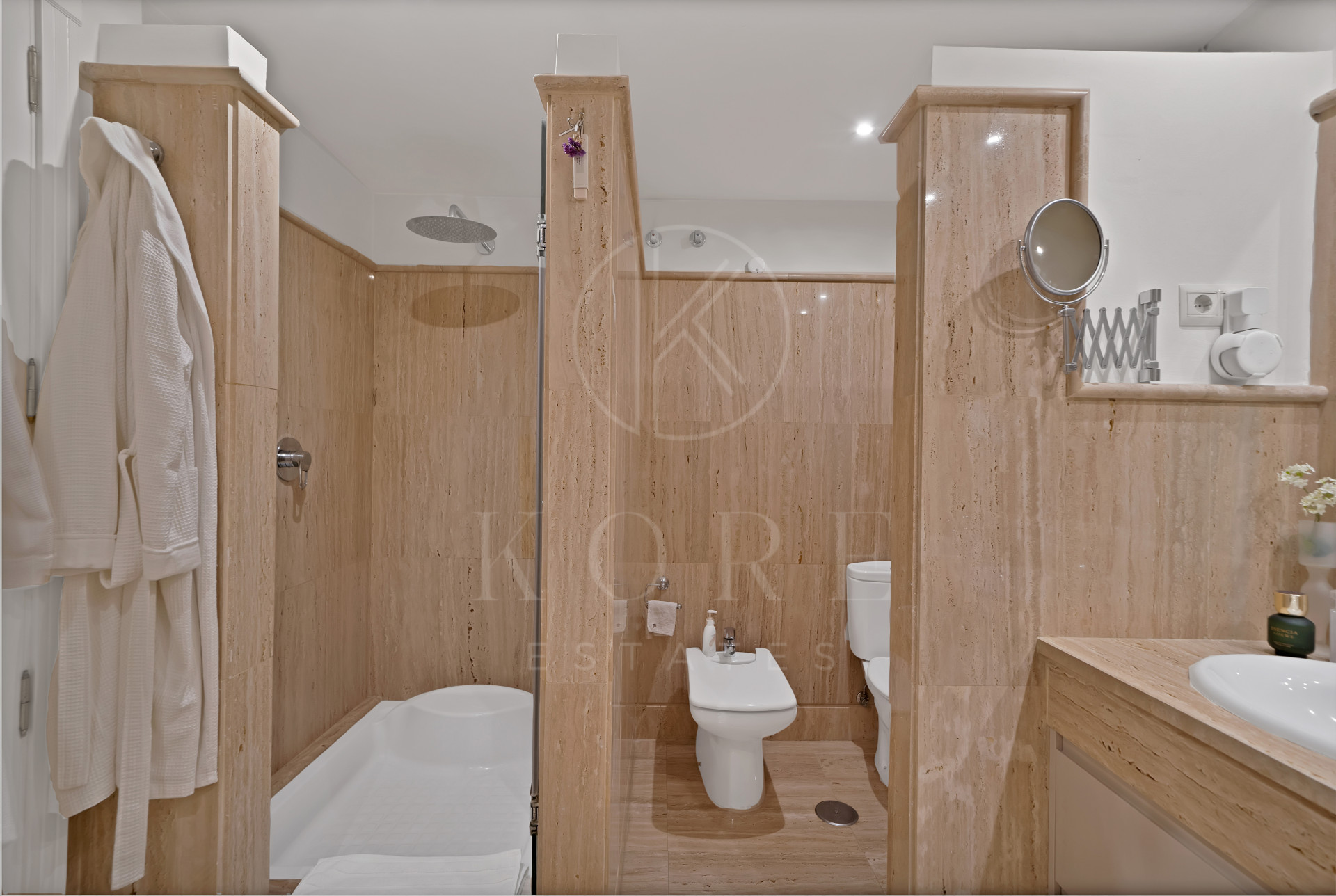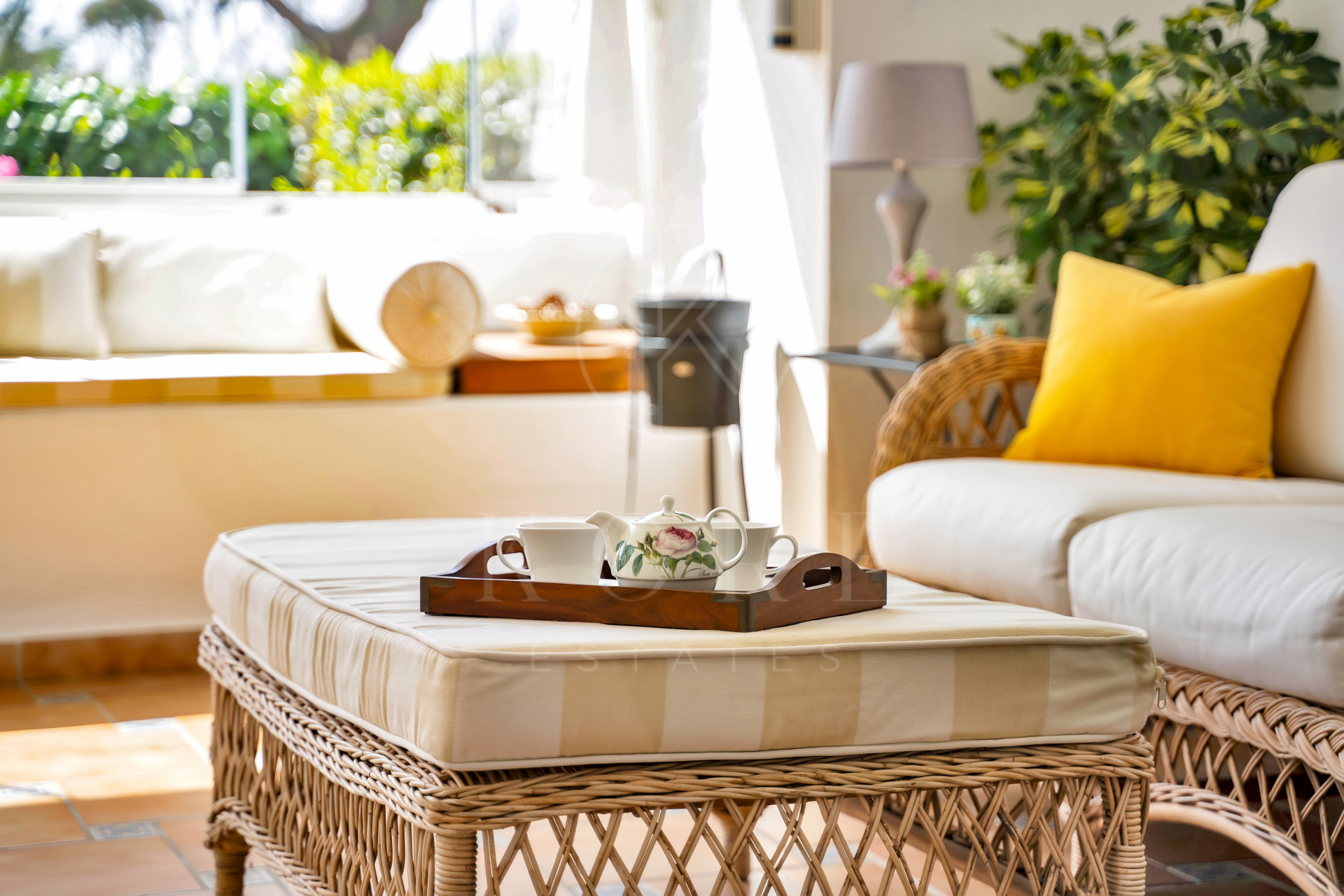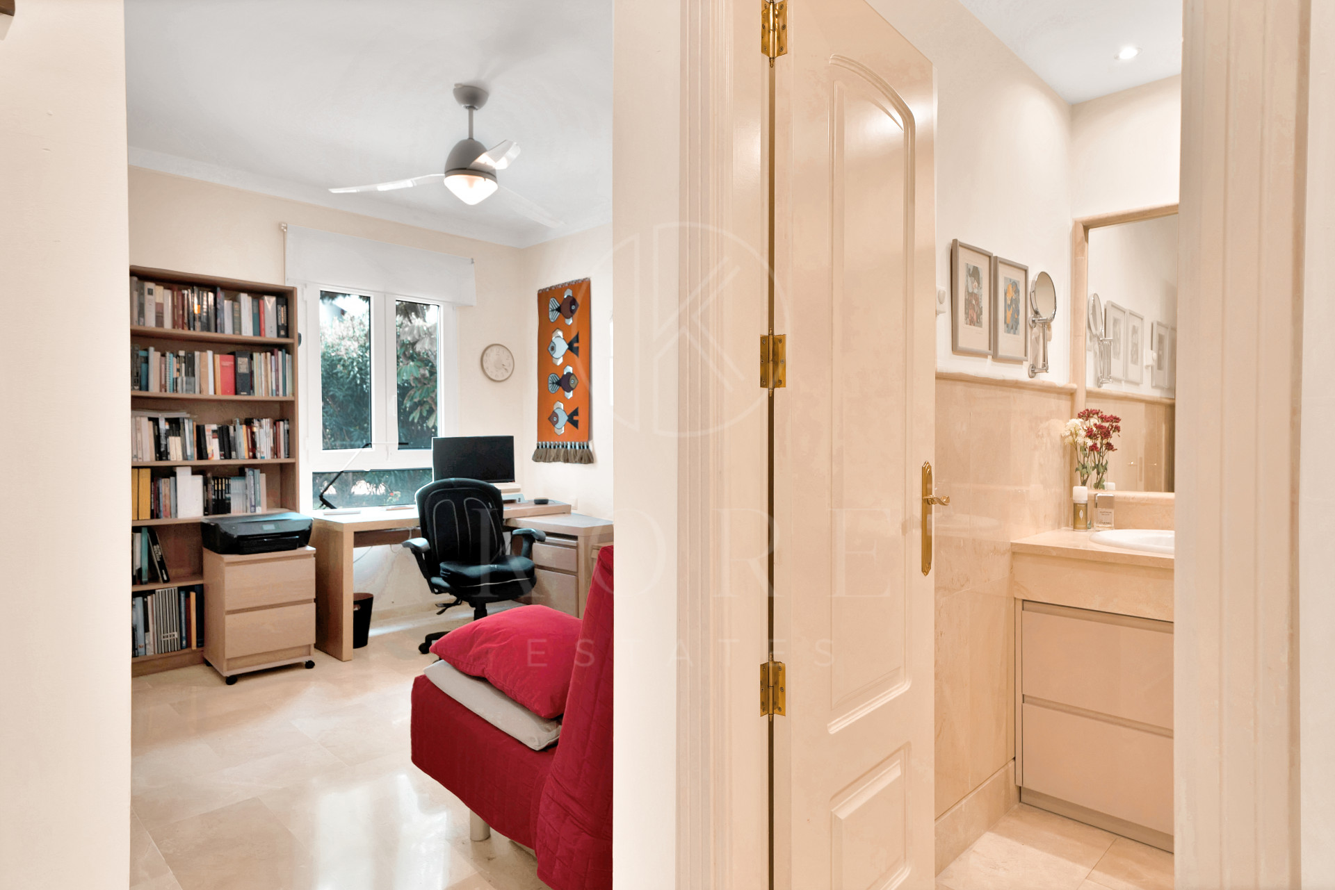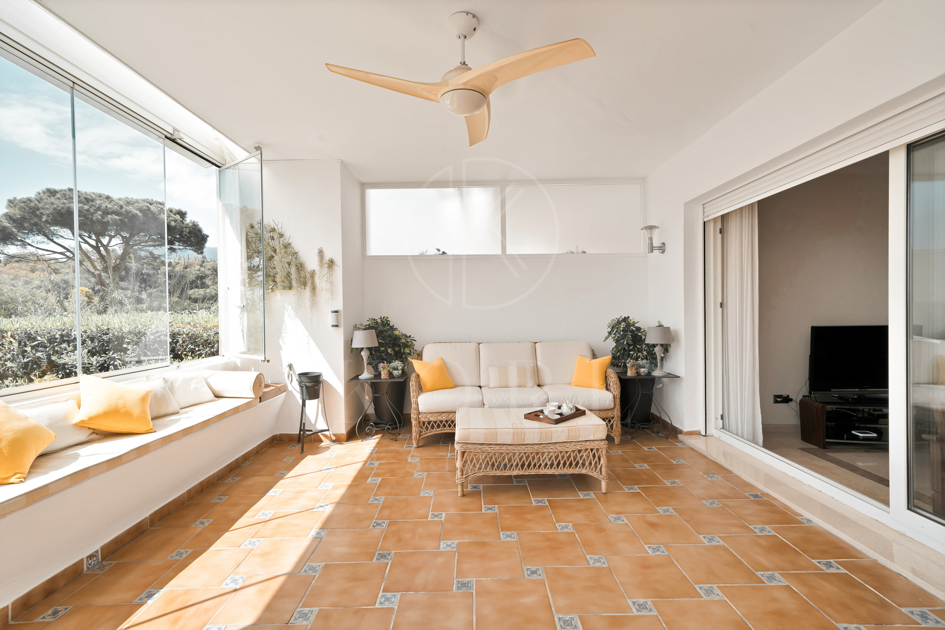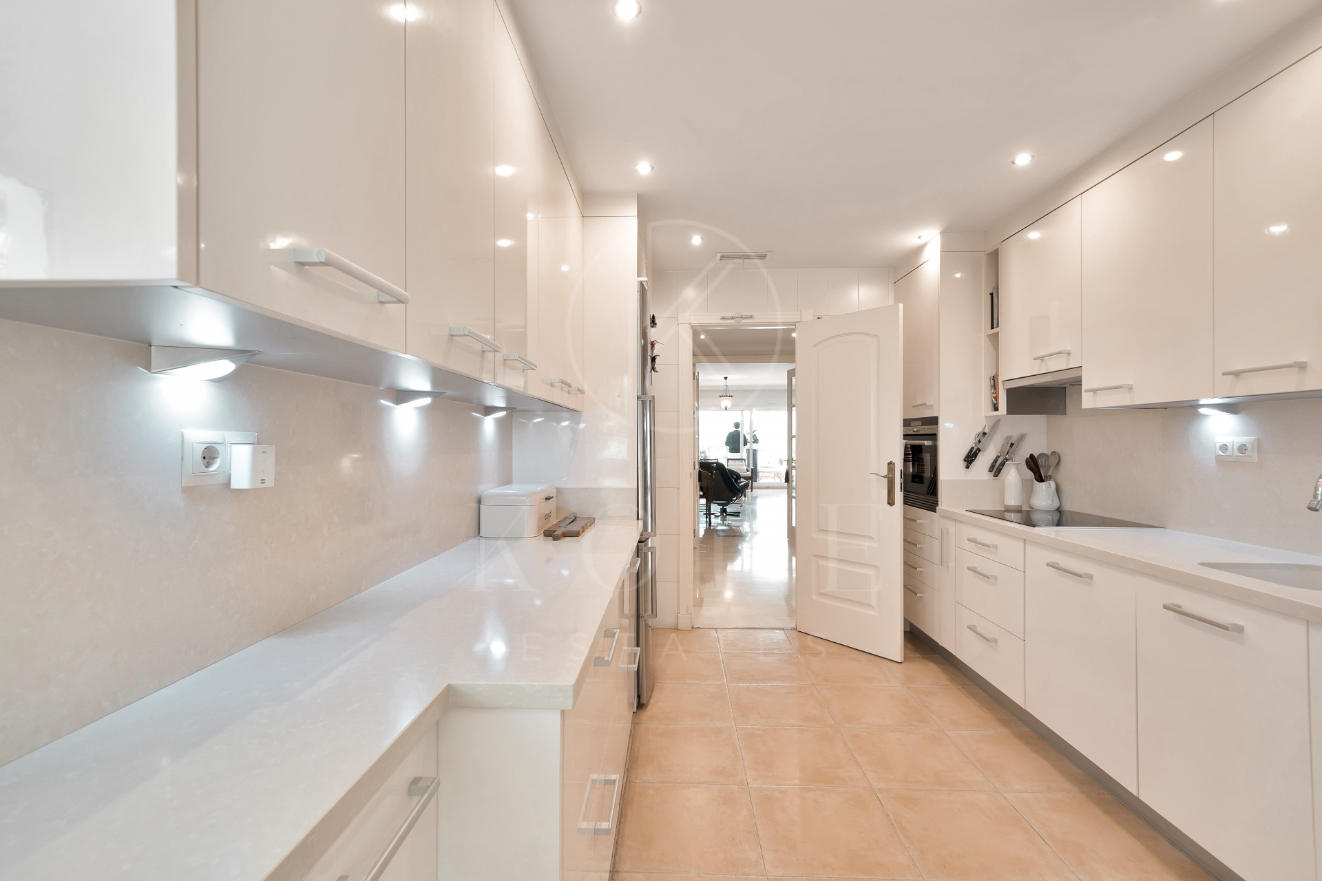 Ubicación Privilegiada: Situado en una de las urbanizaciones más exclusivas en primera línea de playa, con acceso directo al mar y al paseo marítimo.Espacios Amplios y Luminosos: Dispone de un amplio salón-comedor con chimenea, ideal para disfrutar en familia o con invitados. Los grandes ventanales y el acceso directo al jardín privado aportan una atmósfera luminosa y abierta, con vistas despejadas al mar y al campo de golf.Jardín Privado y Terraza: Disfruta del aire libre con estilo gracias al jardín privado, perfecto para cenas al aire libre o simplemente relajarse sintiendo la brisa marina. La generosa terraza ofrece un espacio adicional para disfrutar del entorno natural.Dos Dormitorios en Suite: Ambos dormitorios cuentan con baño privado y armarios empotrados, ofreciendo privacidad, confort y acabados de alta calidad. El diseño ha sido cuidadosamente pensado para una experiencia de vida óptima.Comodidades Modernas: Calefacción por suelo radiante en los baños, aire acondicionado frío/calor, y persianas eléctricas en todas las ventanas para mayor comodidad y seguridad.Trastero y Plaza de Garaje: Incluye una plaza de aparcamiento asignada y un práctico trastero para mayor funcionalidad.Zonas Comunes Exclusivas: La urbanización ofrece servicios de estilo resort, incluyendo dos piscinas, exuberantes jardines tropicales y seguridad 24 horas para total tranquilidad.Con una ubicación inmejorable y características de primer nivel, este apartamento representa una oportunidad única para quienes buscan lo mejor en estilo de vida junto al mar.