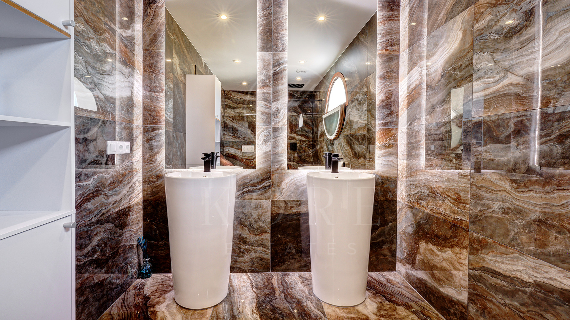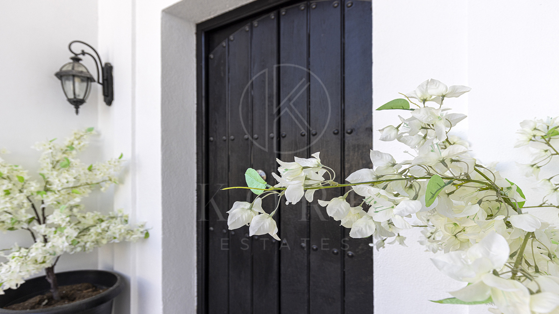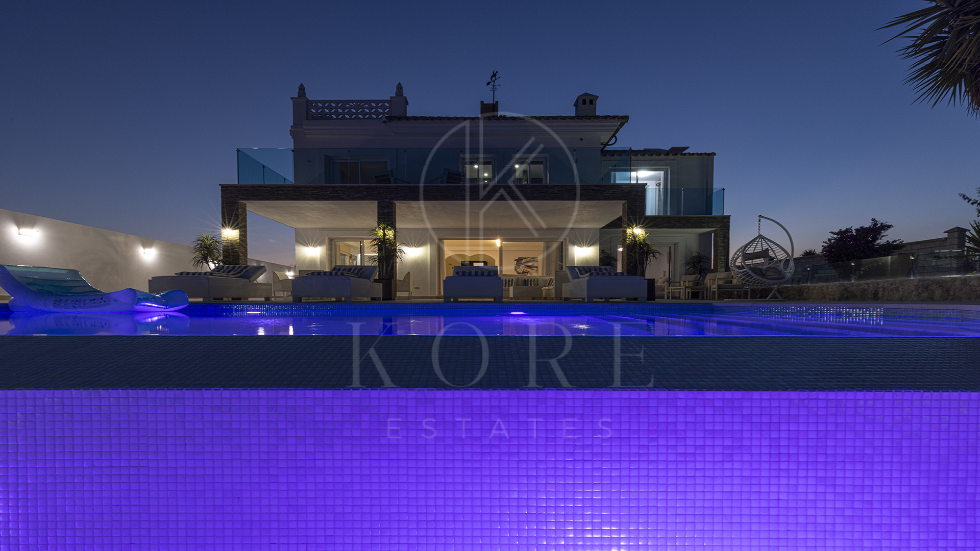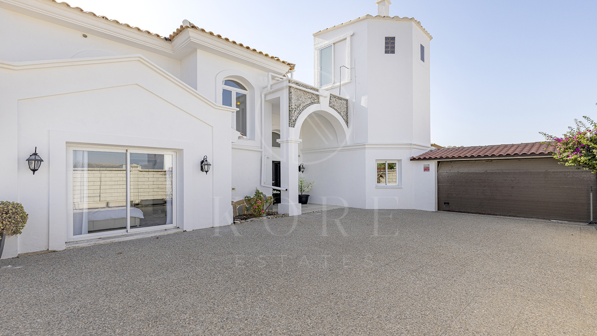 Tras unas llamativas puertas dobles azules, un camino adoquinado conduce hacia un garaje doble privado y la gran entrada principal. Al entrar, un luminoso recibidor con techo alto enmarca su primera impresión del estilo de vida que le espera: la luz del sol entrando por amplios ventanales, la terraza extendiéndose frente a usted y la piscina infinita fundiéndose con el horizonte.