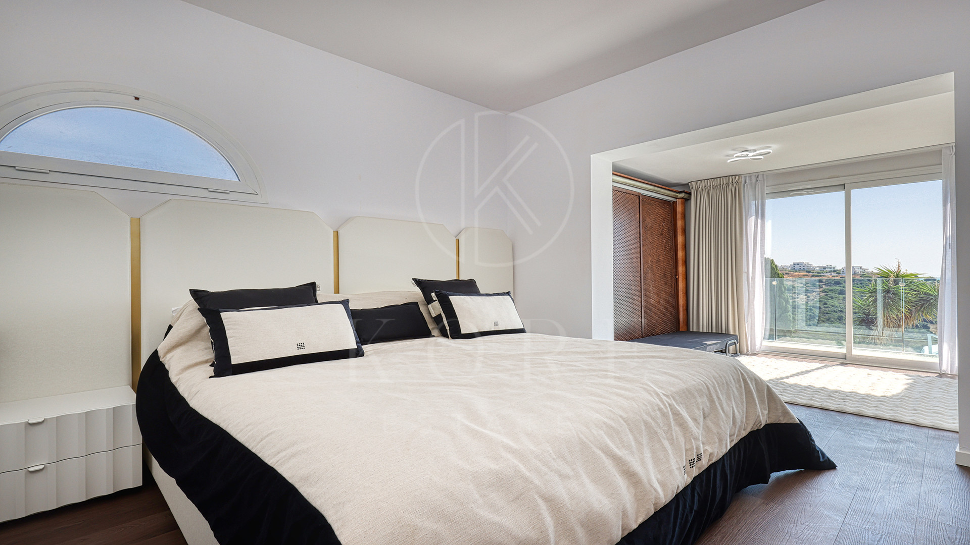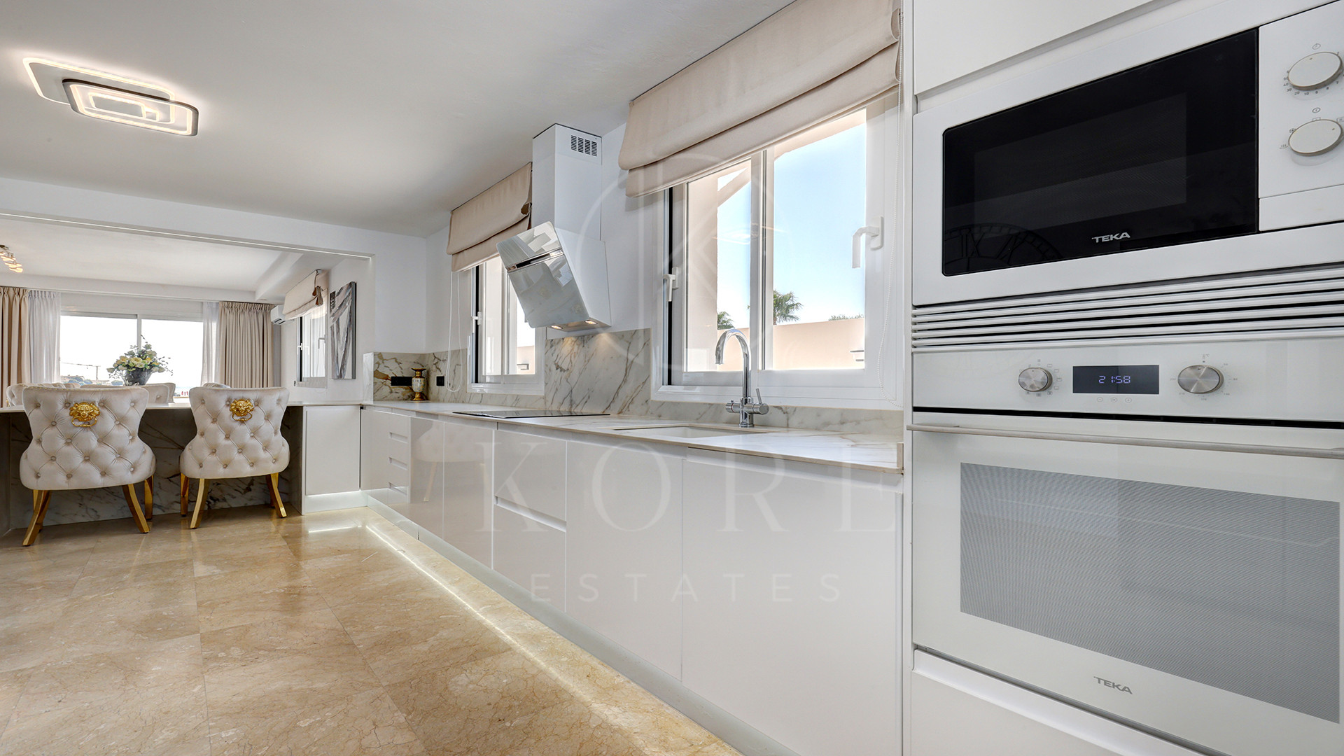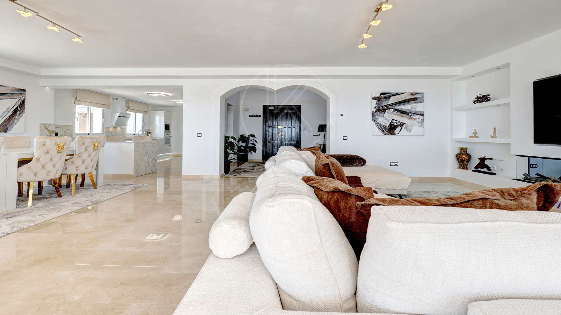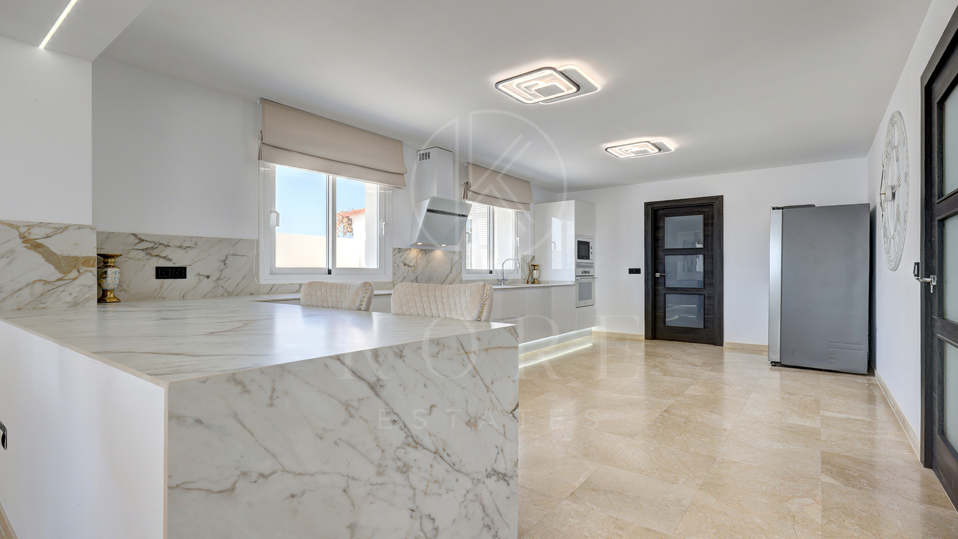 El corazón de la vivienda es una cocina de diseño completamente nueva, moderna, elegante y perfecta para recibir. Su isla en semiforma de L conecta de forma natural con el amplio salón-comedor, un espacio bañado por luz natural, amueblado con estilo y con una pared de medios como punto focal. Aquí, la vida fluye sin esfuerzo entre el interior y el exterior, con terrazas cubiertas y abiertas para disfrutar todo el año.