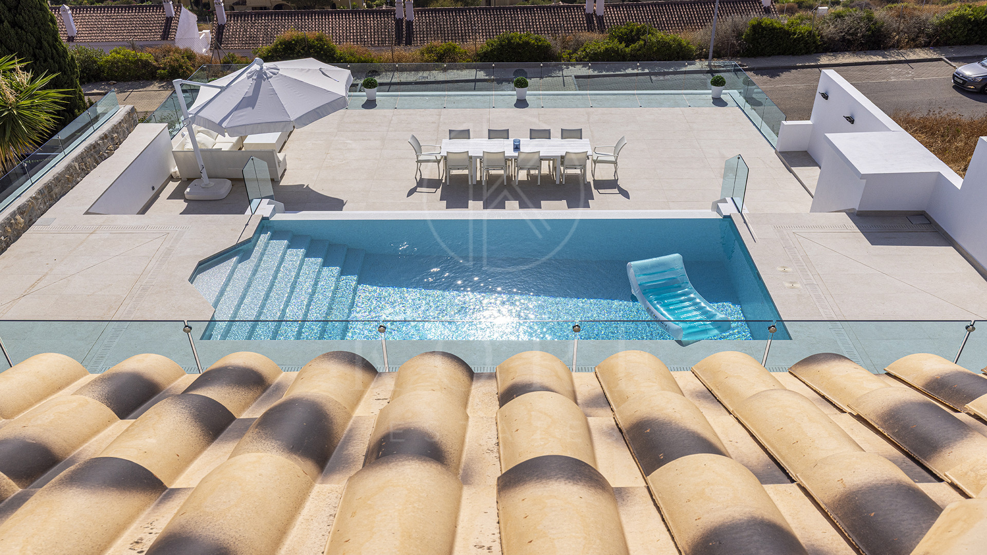 En el exterior, la terraza de dos niveles encarna el auténtico estilo de vida mediterráneo. La parte superior enmarca la piscina infinita como una obra de arte, mientras que la inferior está hecha para largas comidas y cenas al atardecer con amigos. La piscina, equipada con una bomba de gran capacidad, mantiene el agua suave y cristalina, como un espejo del mar.