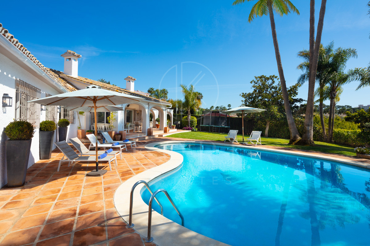 Villa de ocho dormitorios con orientación sur, en una zona tranquila de Elviria, Marbella con vistas al mar