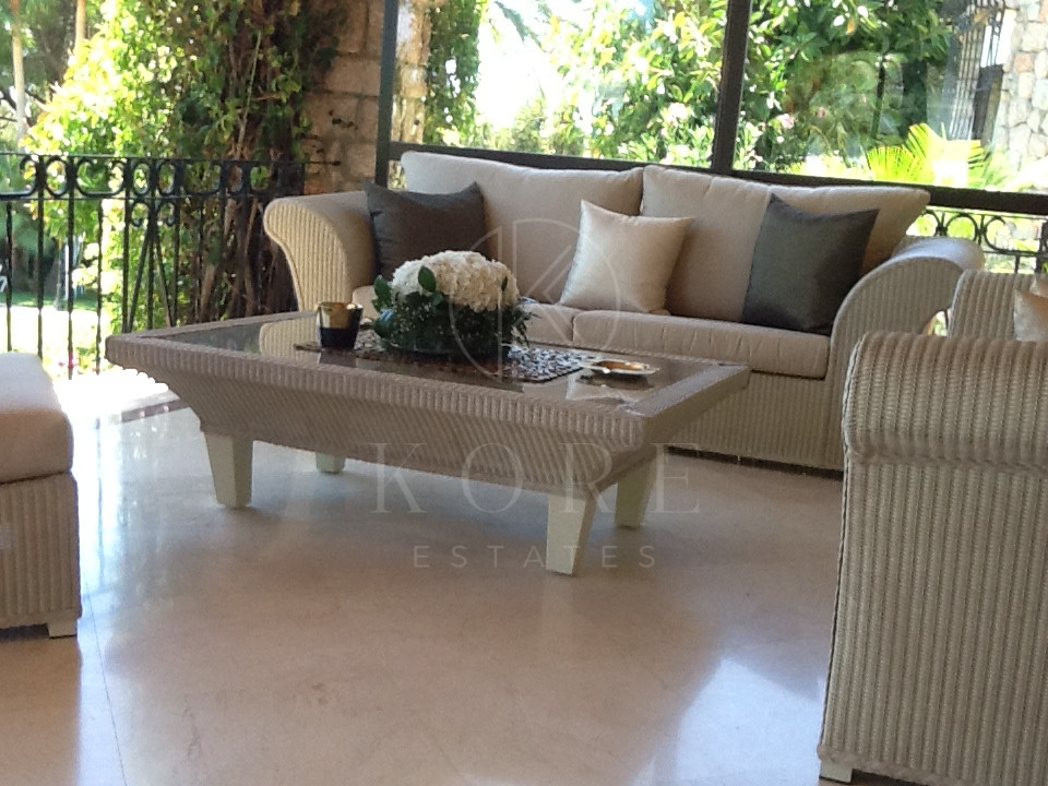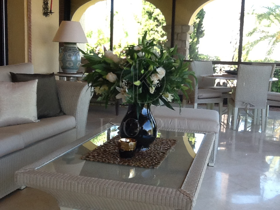 Un comedor con acceso directo a la oficina administrativa y la cocina, un segundo comedor se abre a un encantador patio tradicional andaluz. Patio andaluz con suelo de mosaico de mármol antiguo. Dormitorio principal, sala de estar, vestidor y terraza solárium frente al jardín, la piscina, el campo de golf y el mar; otro dormitorio con baño en-suite que conduce a la terraza de la sala principal que da a la piscina.