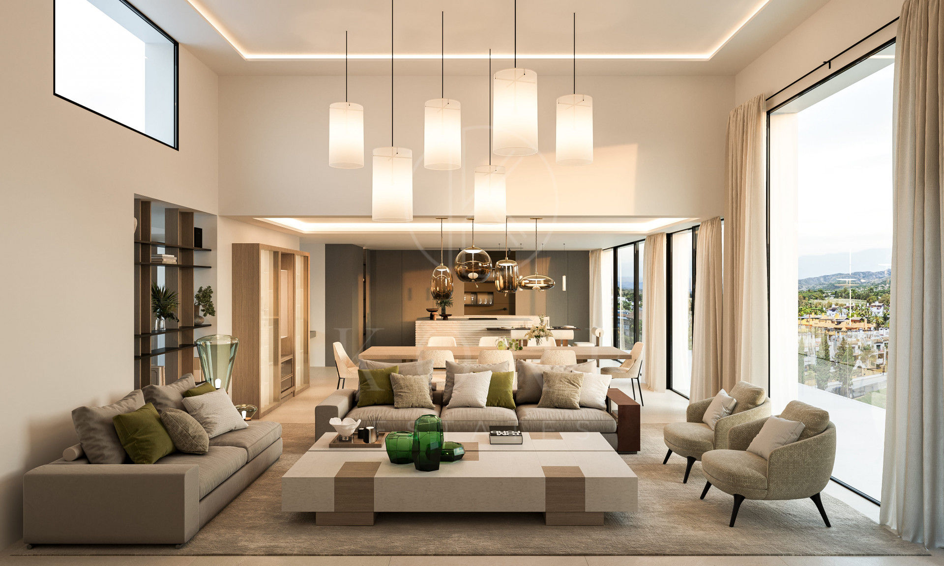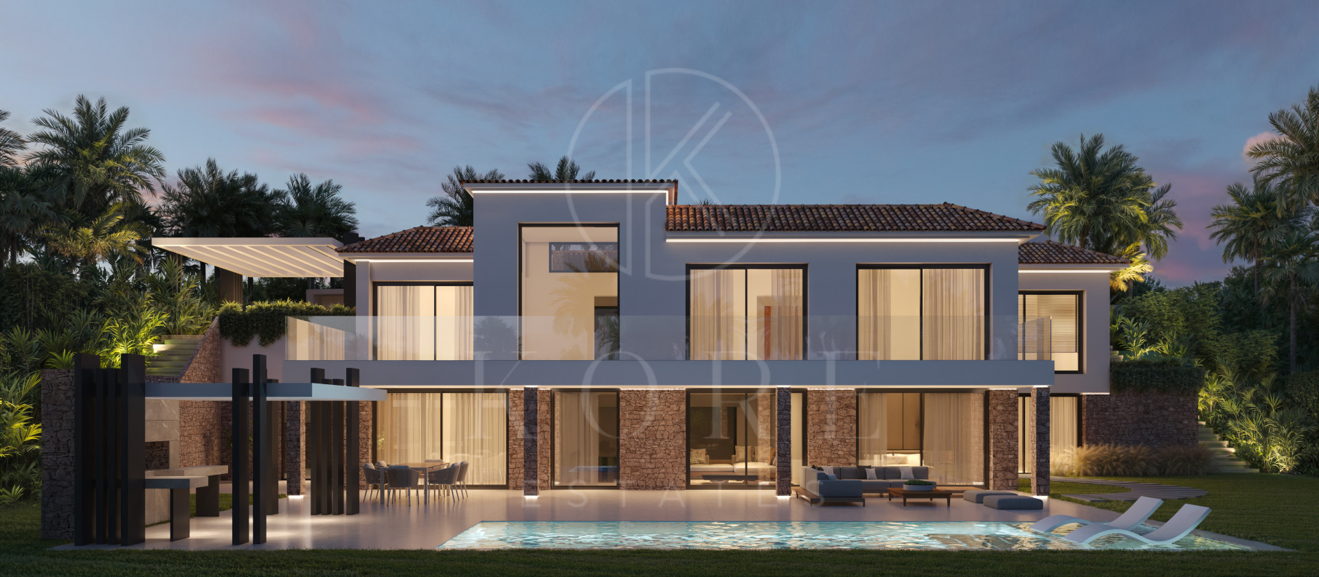 Diseñada por los reconocidos arquitectos Jesús Estepa Rubio y Antonio Estepa Rubio de ER Arquitectos, y decorada por AALTO Exclusive Design, la villa presenta una fusión armoniosa de piedra natural, elegantes elementos de cristal y líneas arquitectónicas limpias. Las zonas de salón y comedor de concepto abierto reciben abundante luz natural gracias a los ventanales de suelo a techo que enmarcan las espectaculares vistas del entorno.
