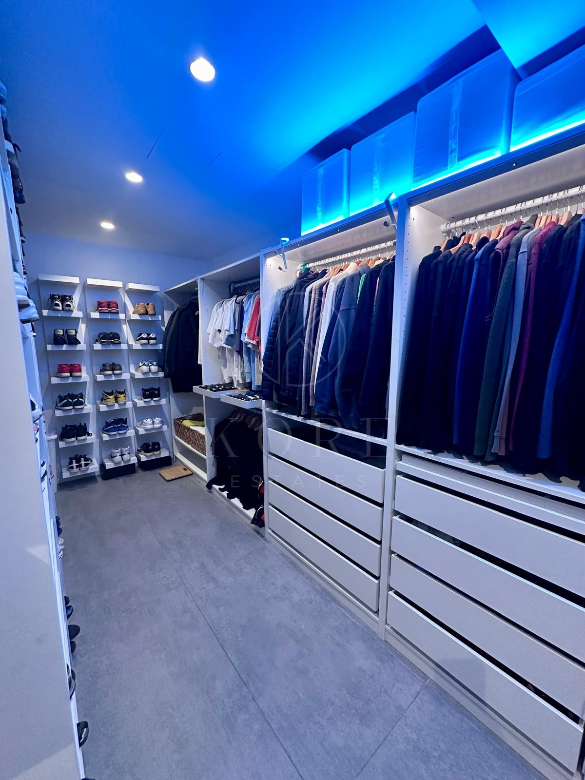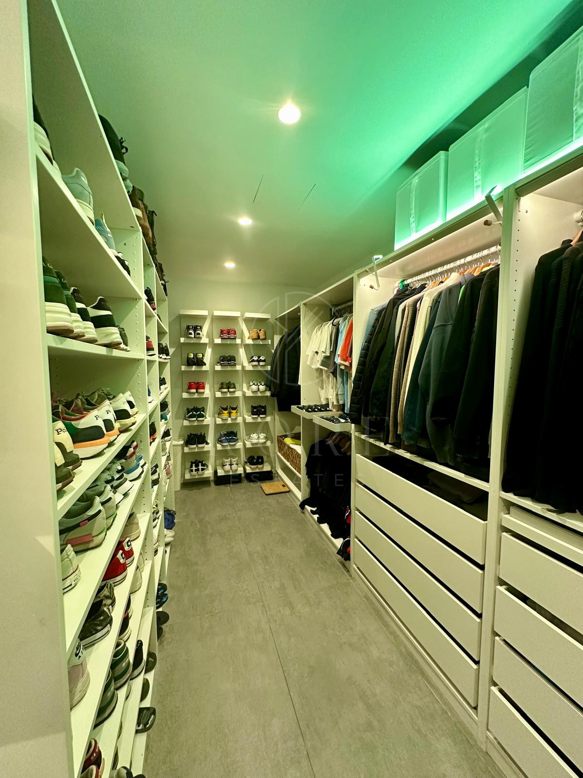 Un enorme vestidor bien dividido, con luces y fabricado a medida.
