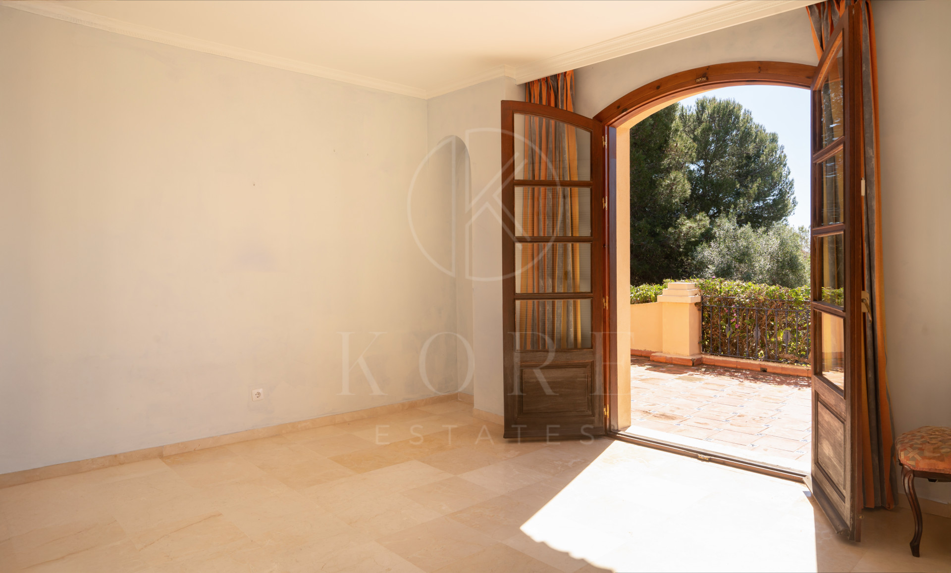 La villa cuenta con un amplio y luminoso salón con chimenea, que conecta perfectamente con una terraza privada y jardines maduros. Una cocina totalmente equipada proporciona comodidad moderna, mientras que una sala de oficina añade flexibilidad para el trabajo o el estudio. Las grandes puertas de cristal y un balcón permiten la entrada de mucha luz natural y ofrecen vistas parciales al mar. La propiedad incluye terrazas cubiertas y descubiertas, perfectas para relajarse al aire libre.