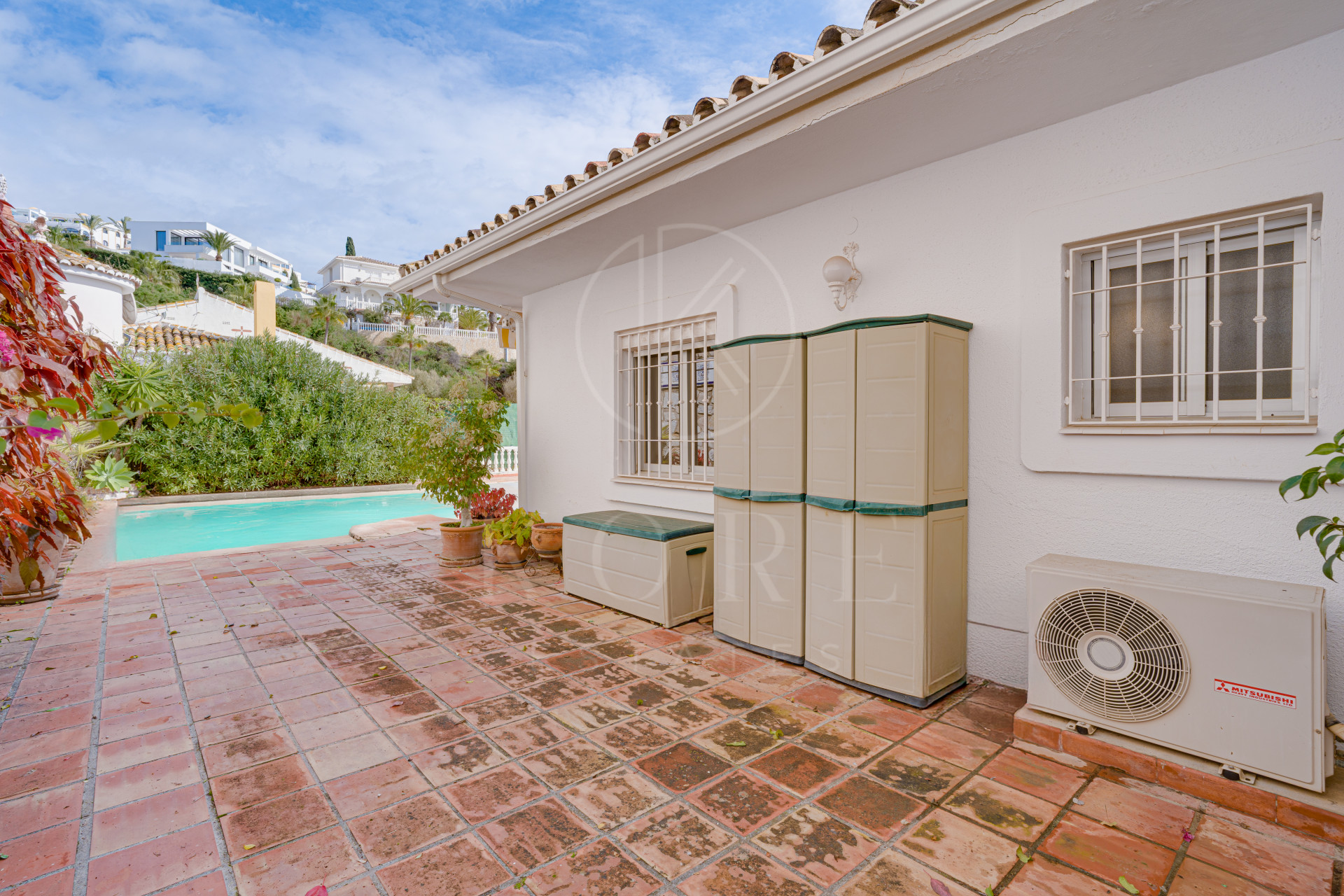 Excelente oportunidad de reforma – hermosa orientación sur, Villa de tres dormitorios situada en Riviera del Sol, Mijas Costa, que ofrece impresionantes vistas al mar y a poca distancia de todas las comodidades y un corto paseo a la playa. La villa está situada en un solo nivel, con la opción de construir un piso adicional, proporcionando un excelente potencial para añadir valor creando más habitaciones, un mayor espacio habitable, y aún más impresionantes vistas al mar. La propiedad consta actualmente de tres dormitorios grandes, uno con baño en suite, dos dormitorios, dos baños adicionales, y un aseo separado junto a la piscina, ideal para vivir al aire libre y entretener. Un amplio salón con chimenea crea una acogedora sala de estar, mientras que la cocina recientemente renovada tiene acceso directo a los espacios exteriores. Situado en una parcela generosa, la villa cuenta con una gran piscina privada, amplias zonas al aire libre, un garaje para un coche, una gran entrada con carport para estacionamiento adicional, y un almacén sustancial, haciendo de esto una inversión ideal o casa familiar con enorme potencial.
