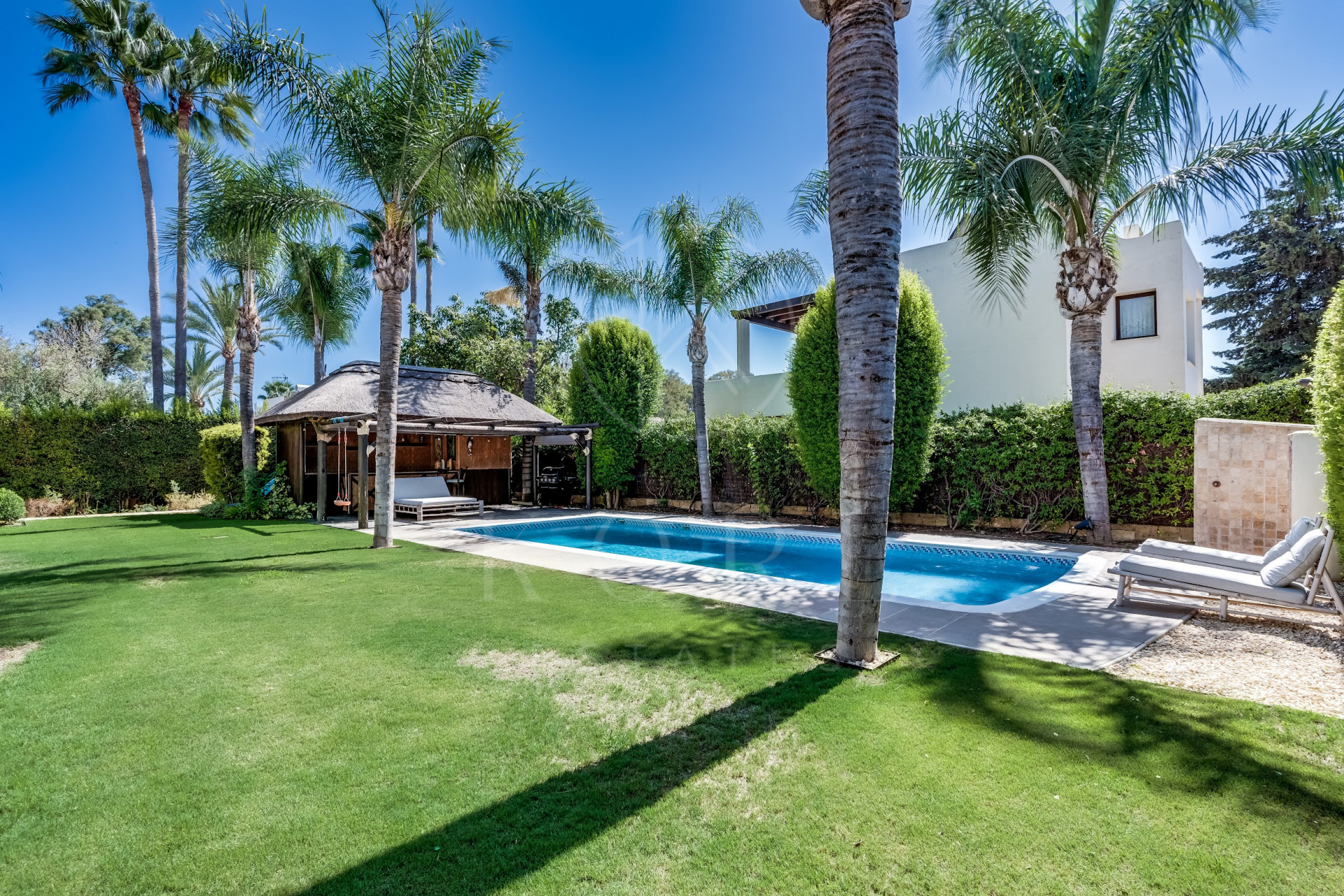 En el exterior encontramos una gran zona de terraza, parcialmente cubierta, ideal para disfrutar del estilo de vida mediterráneo. Destaca la piscina climatizada, ducha exterior, tiki bar y un baño adicional para mayor comodidad.