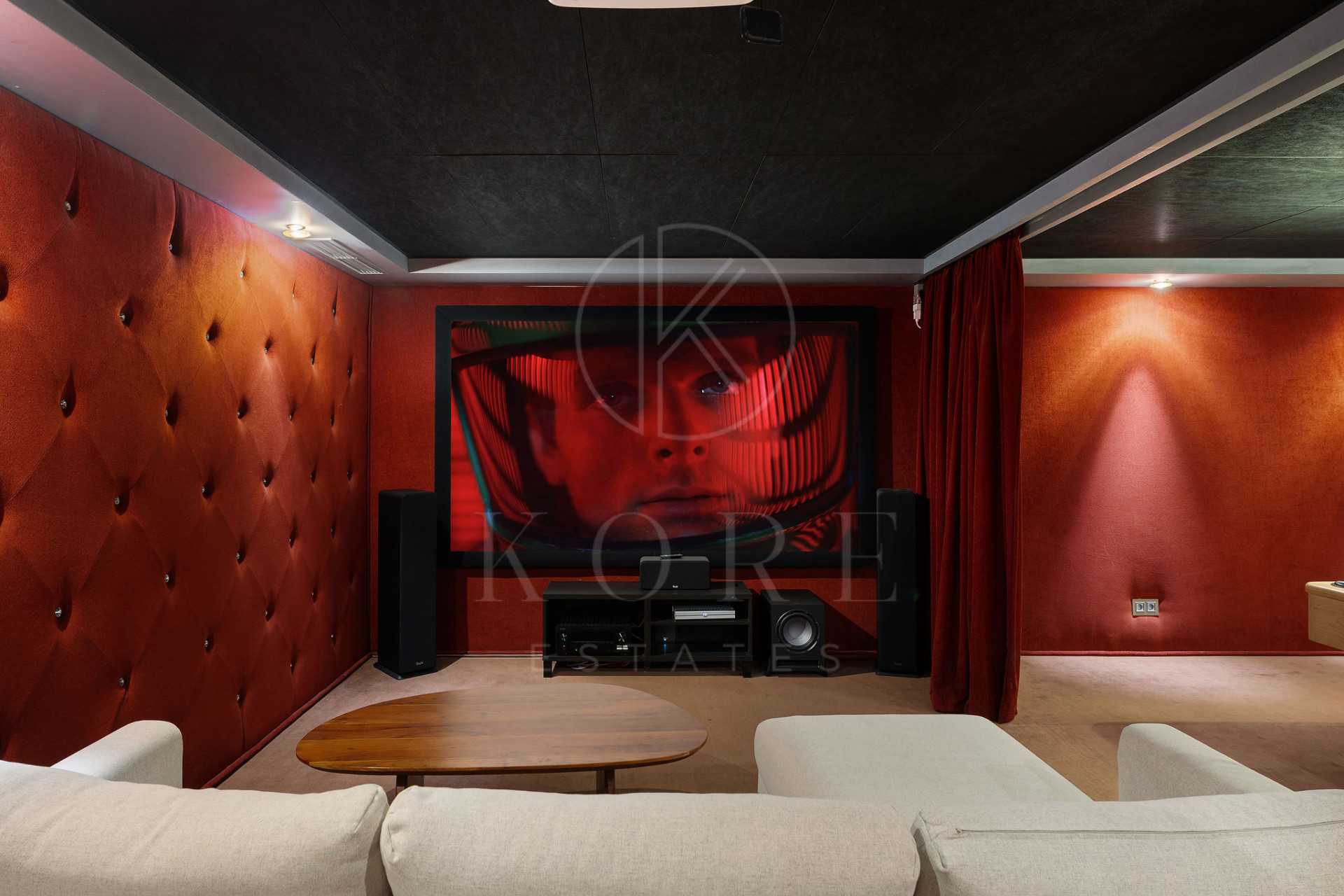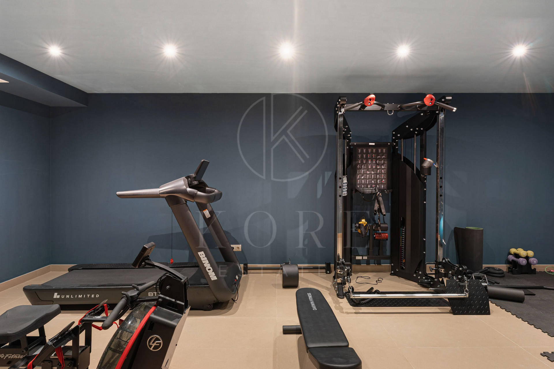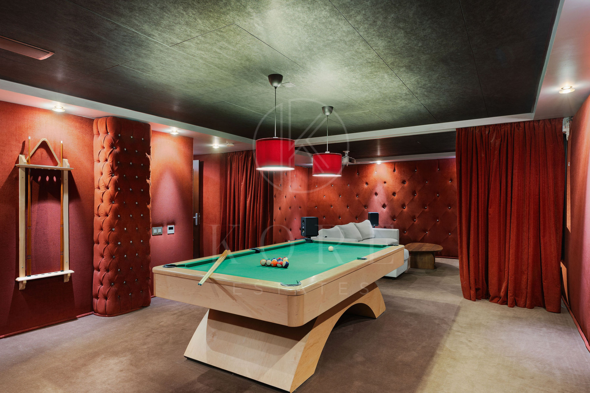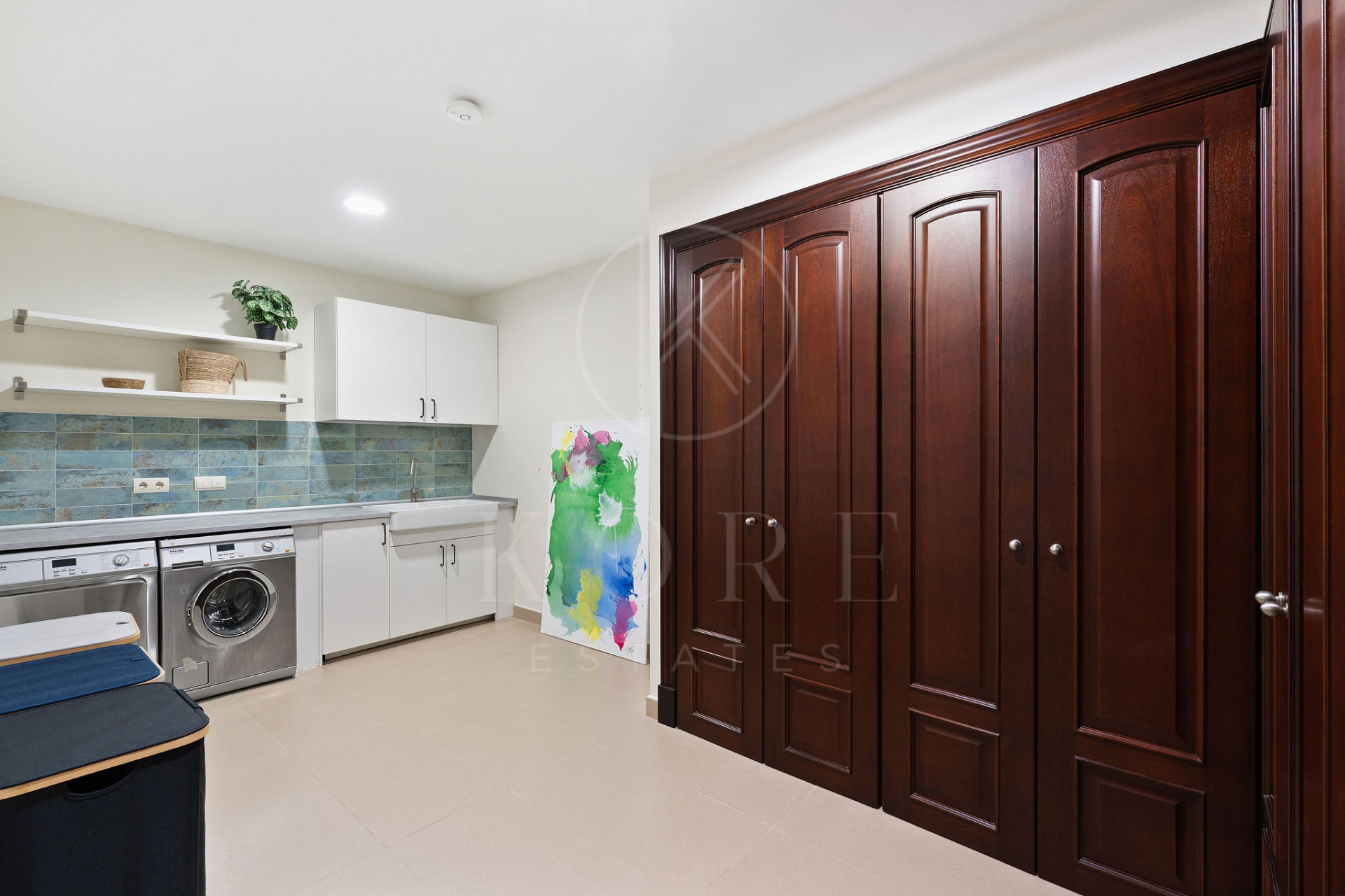 La planta inferior ofrece sala de cine, gimnasio, lavandería y una sala de juegos, además de un gran garaje con punto de carga para coche eléctrico, amplias zonas de almacenamiento y un práctico recibidor.