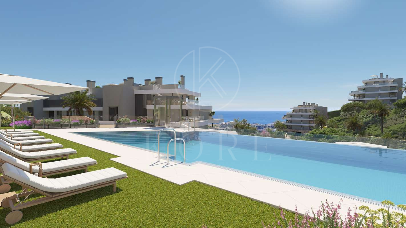 The eye naturally travels from the lake of the emerald-green golf course, whose fairways run from the bottom perimeter of the complex, across the Andalucian countryside to the lively town of La Cala de Mijas. Here the sands of the Mediterranean shoreline boast numerous beach clubs and chiringuitos, just perfect for long, lazy summer lunches. The generously proportioned two and three-bedroom apartments are spaciously arranged in low-rise blocks of just four floors, with delightful manicured communal gardens winding between the residences.