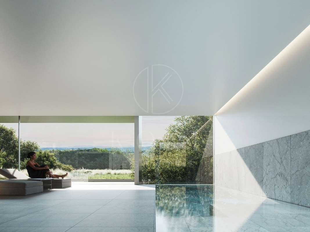Inside, the wellness area covers 152 m² and includes a heated swimming pool naturally lit by a skylight, a fully equipped gym and a sauna, guaranteeing a space for relaxation and personal care all year round. In addition, the villa features a private cinema and wine cellar, designed for the enjoyment and comfort of its residents.