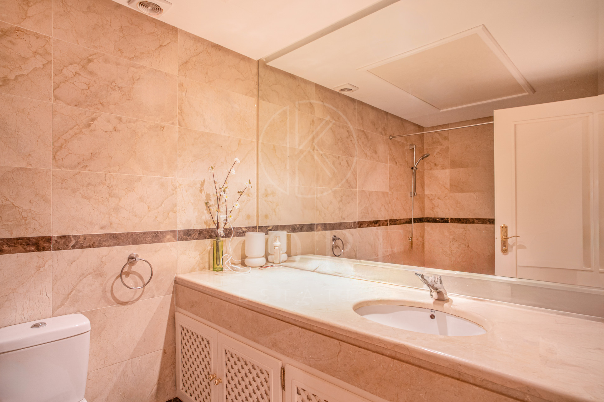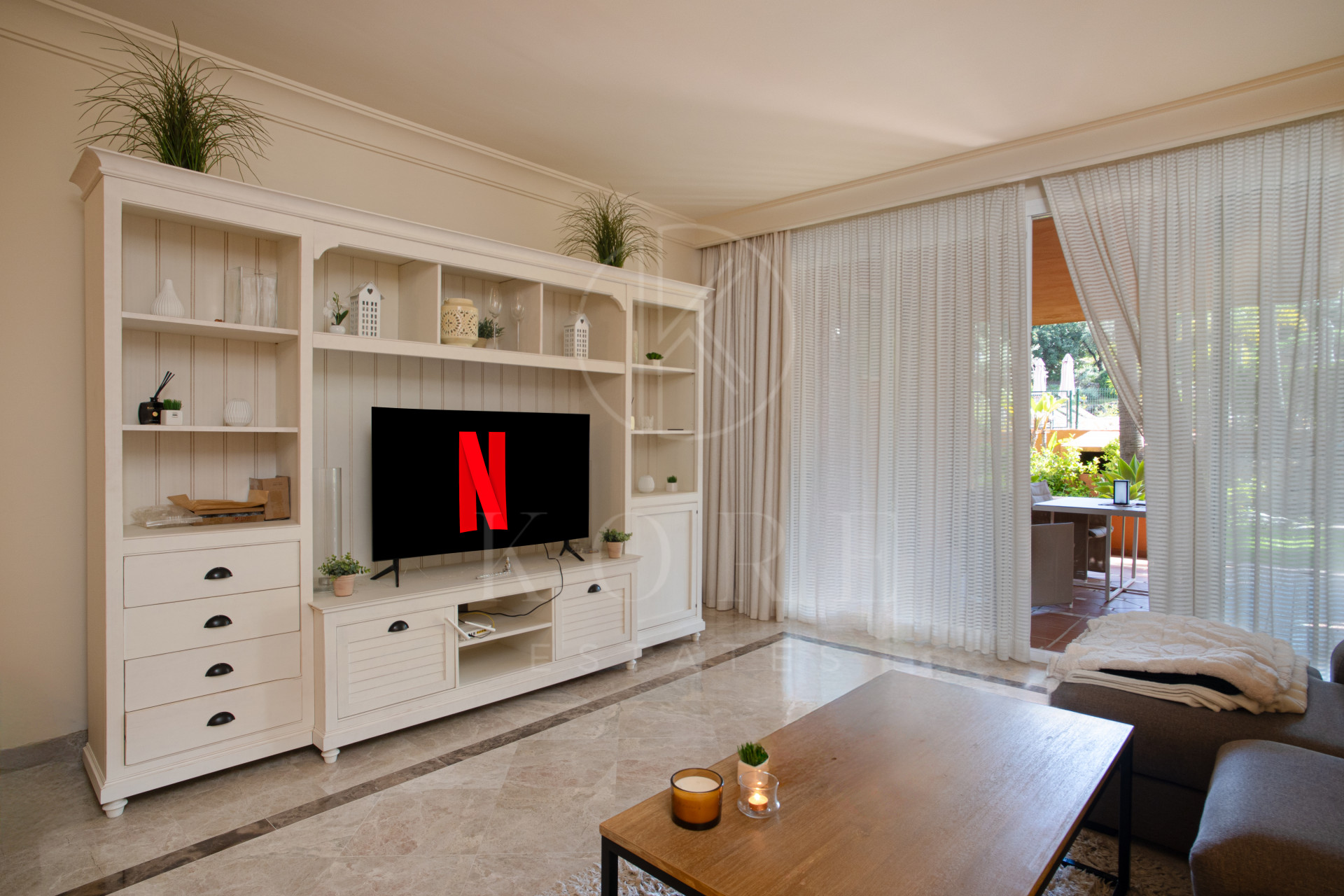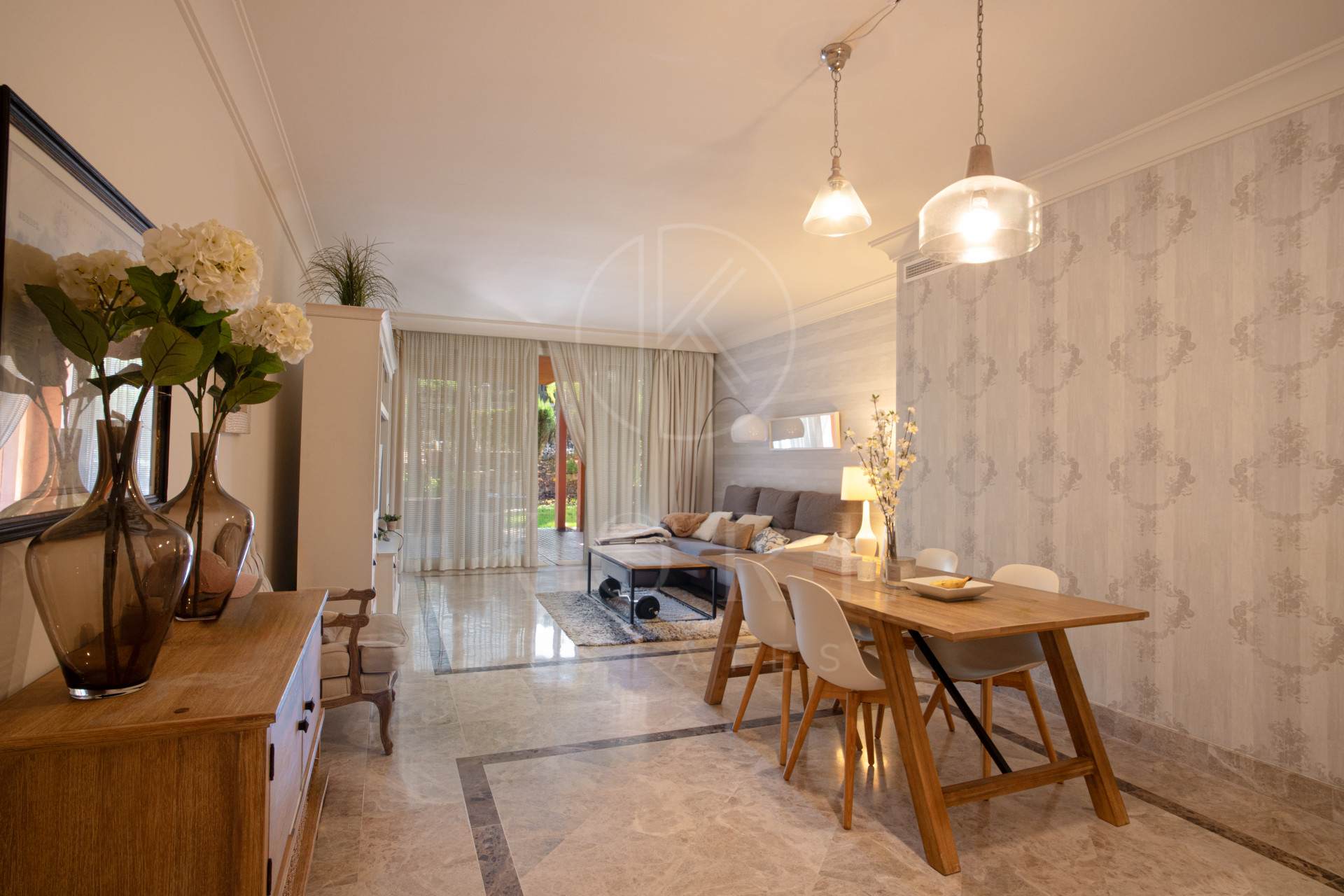 Located in one of the most exclusive and peaceful developments in Nueva Andalucía, this elegant ground floor apartment offers the perfect blend of comfort, privacy, and Mediterranean style. It features two spacious bedrooms and two bathrooms, one of them en-suite, as well as a fully equipped independent kitchen with a laundry area. The bright living-dining area opens onto a large private terrace with direct access to the pool, ideal for enjoying outdoor living all year round. The property also includes a private parking space and storage room. Set within a gated community with 24-hour security, surrounded by over 13,000 m² of tropical gardens, a lake, and a large swimming pool, it’s an ideal choice as a permanent residence, holiday home, or investment. Just minutes from Puerto Banús, top golf courses, and all essential amenities.