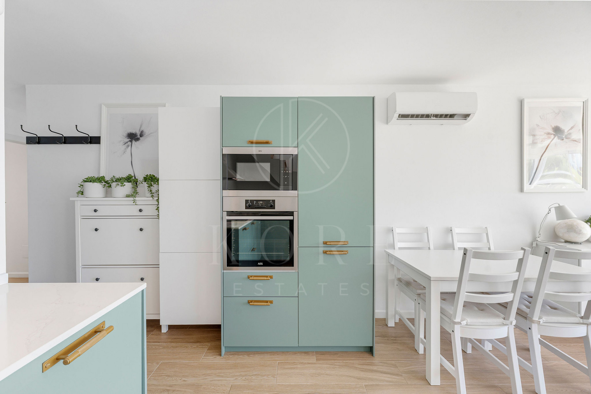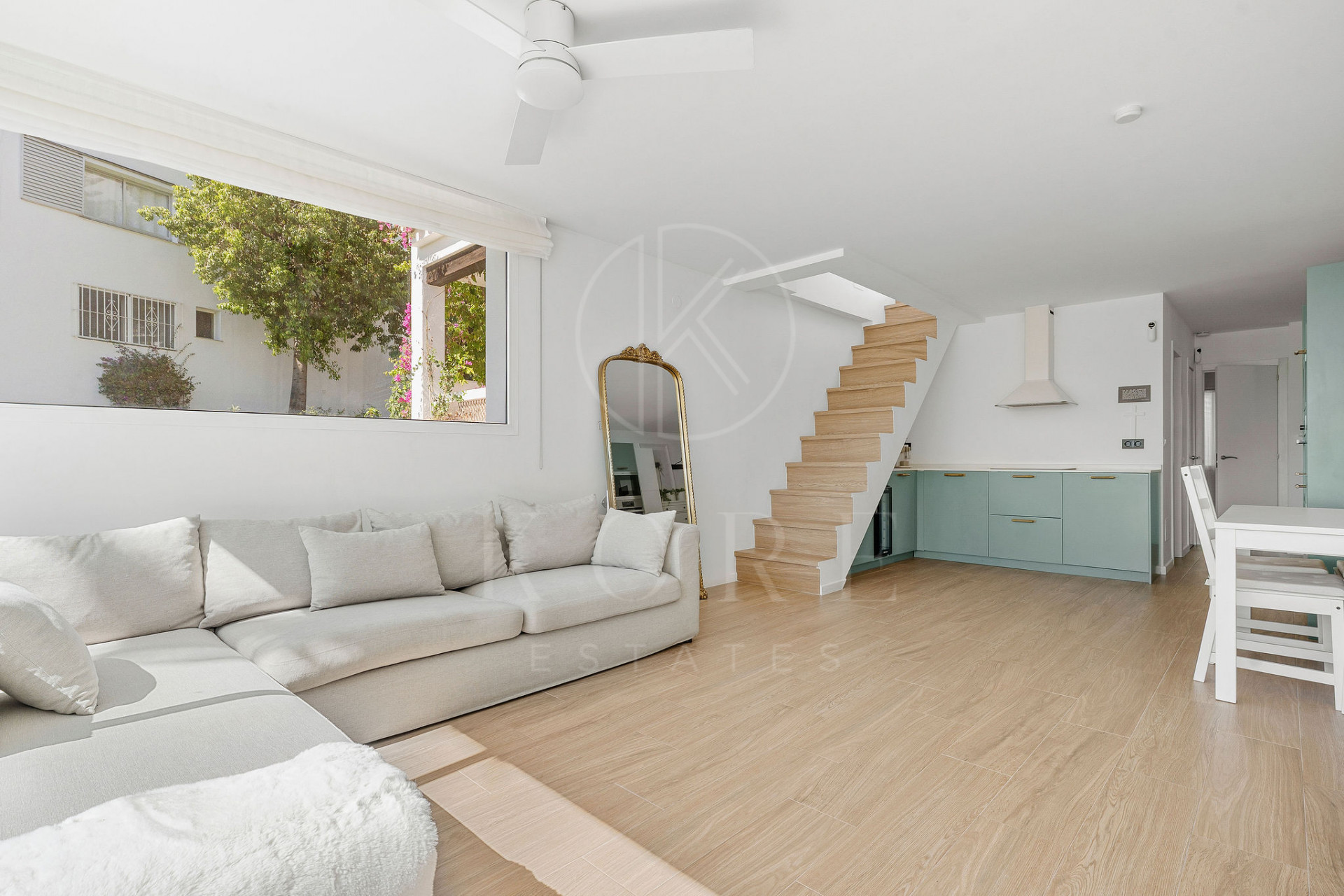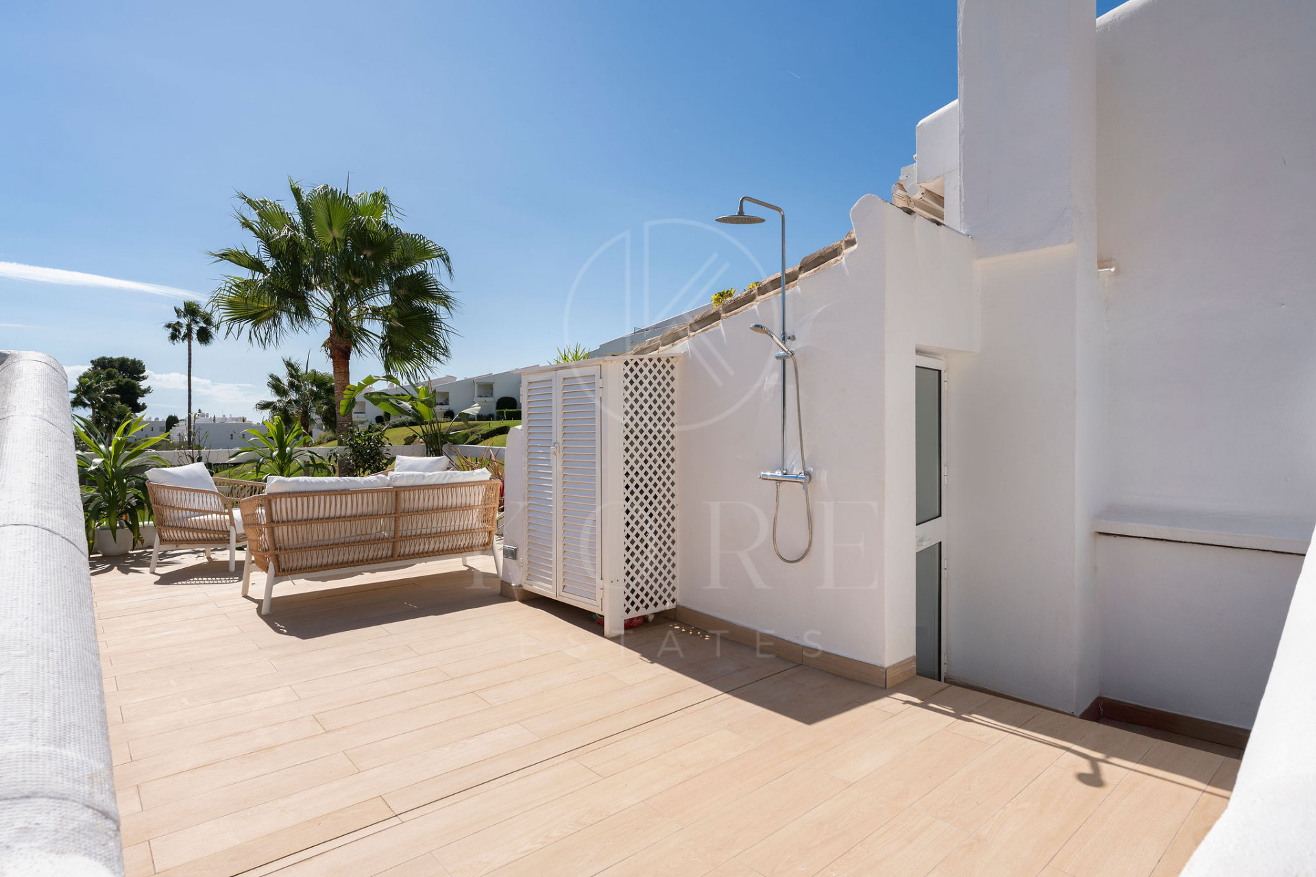 This elegant property offers a perfect blend of modern comfort and Mediterranean charm. The kitchen is sleek and fully equipped, designed for both functionality and style. The open-plan living and dining area is filled with natural light leading you upstairs onto a spacious private terrace with stunning sea, mountain and golf view and surrounding greenery. This terrace provides the ultimate outdoor living space, perfect for sunbathing, alfresco dining, or simply enjoying the peaceful surroundings.