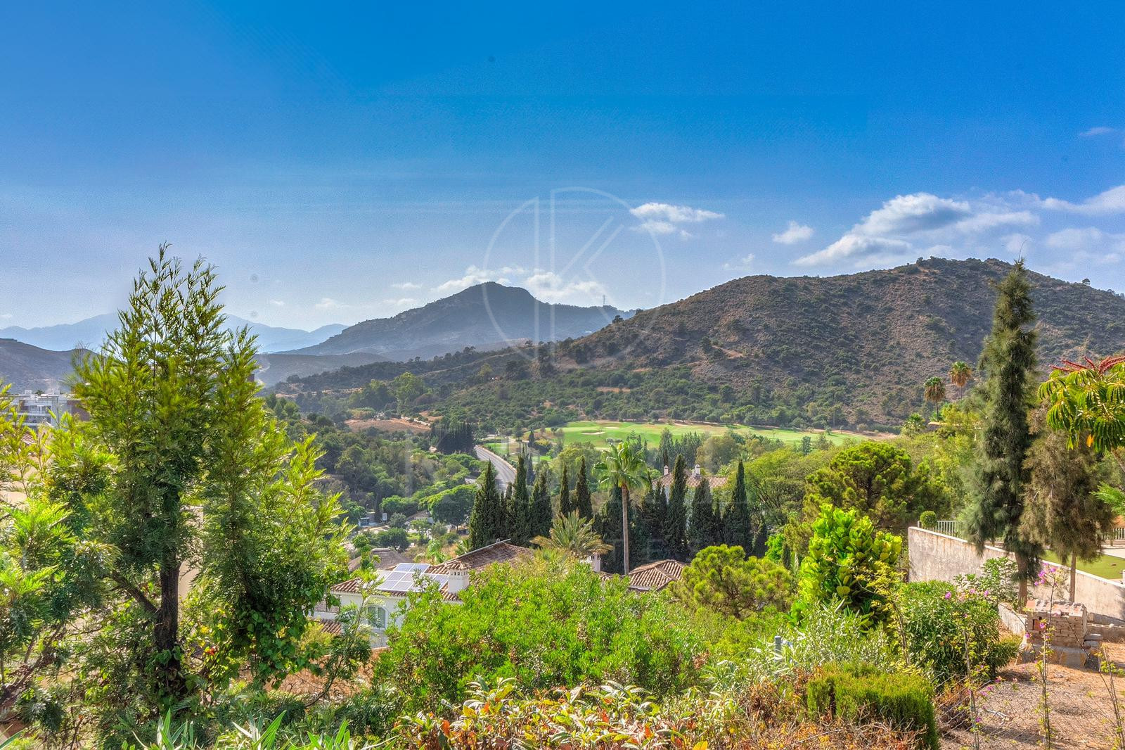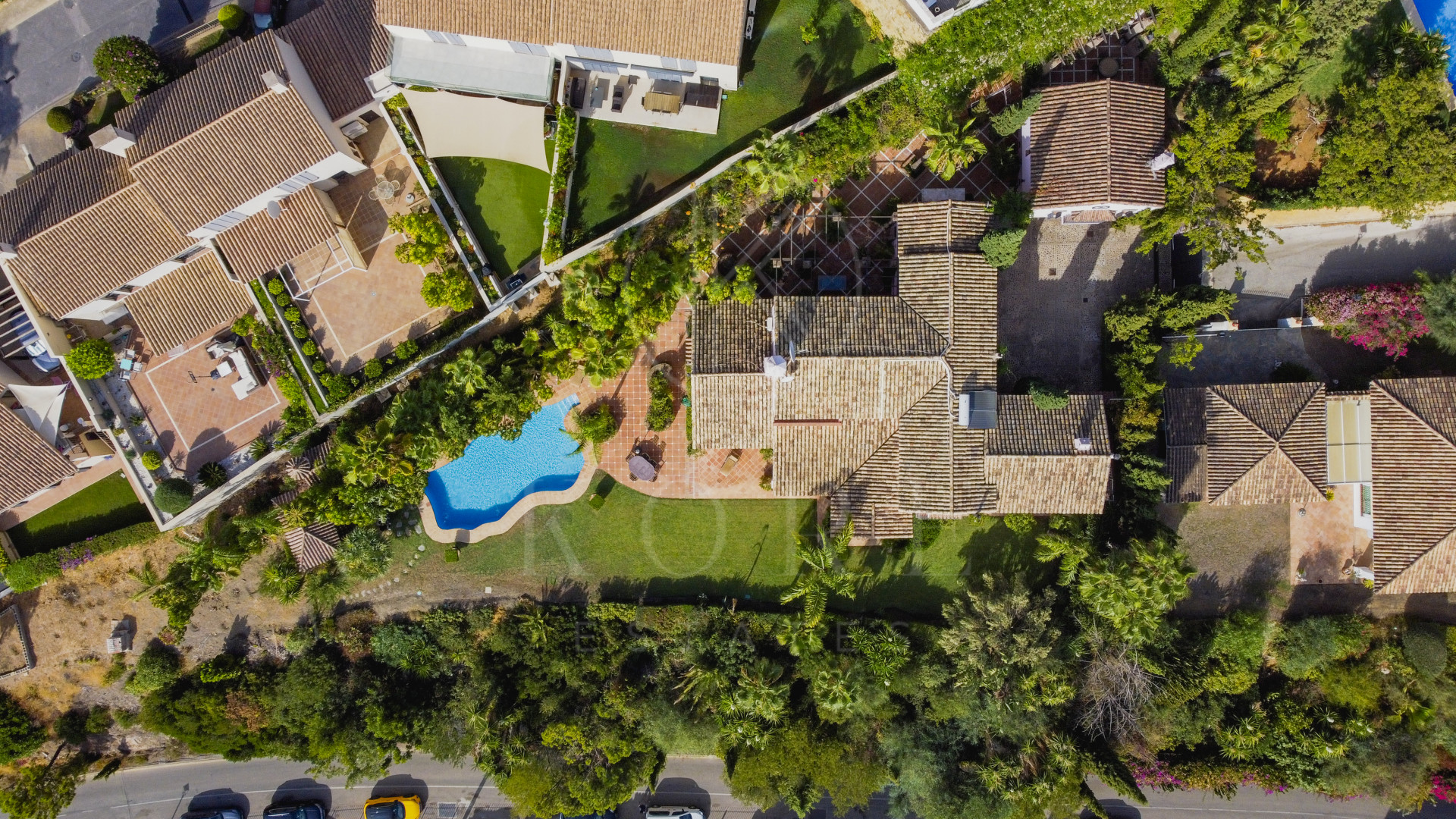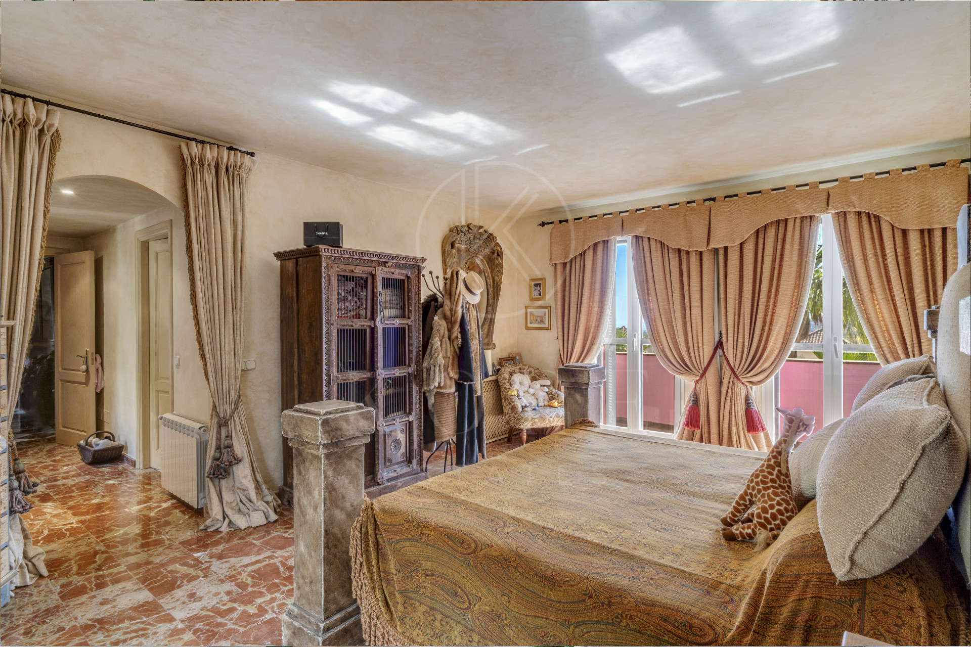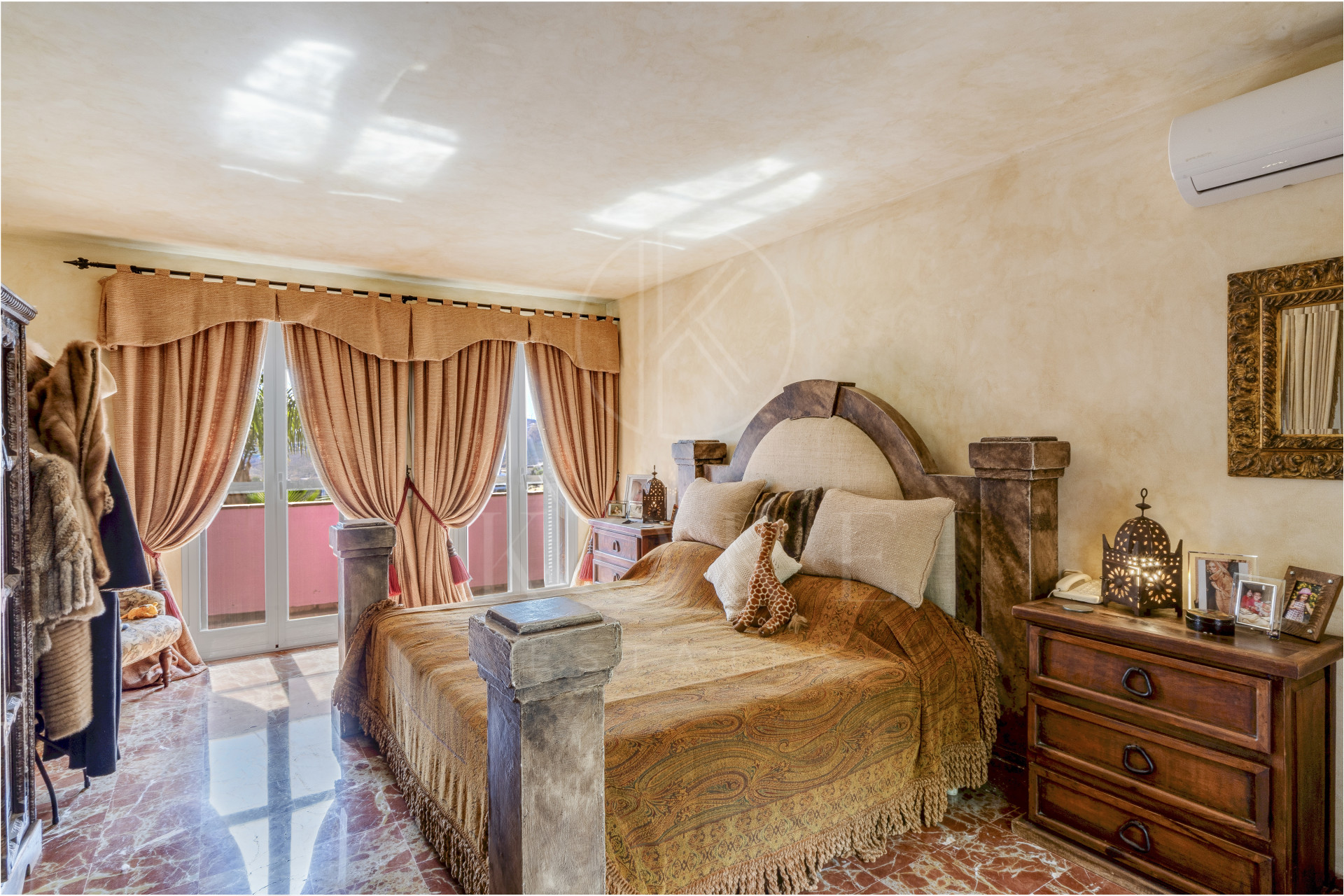 Charming five-bedroom Andalusian style villa in the gated community Puerto de Los Almendros, Benahavis. Located in a sought-after area, only ten minutes from Puerto Banús and the beach. The property is set on a large plot with mature gardens, swimming pool, barbecue area, and a courtyard with a fountain. The villa has a southwest orientation that boasts stunning views of the golf course and the country side which are fully protected. You enter the grounds through impressive gates into a courtyard with ample parking. The villa is distributed over 2 floors with a double height entrance hall and spacious rooms offering plenty of natural light throughout the house. The ground floor offers both formal and informal lounges; a dining room connected to a fully fitted kitchen, perfect for entertaining; and a Guest Suite. The first floor has the master suite and two bedrooms with an ensuite bathroom, all of the bedrooms open on to lovely balconies which can be accessed without entering the villa. In addition to reception areas this wonderful home also has a library, which could be the 6th bedroom, utility, laundry and storage rooms, and a studio apartment with independent access. Other features include air-conditioning, gas central heating, security window bars, fitted wardrobes and solar panels. This traditional villa was designed by renowned architect Cesar De Leyva and is the epitome of luxury living; it can be your full-time residence or a holiday retreat offering absolute peace and privacy.