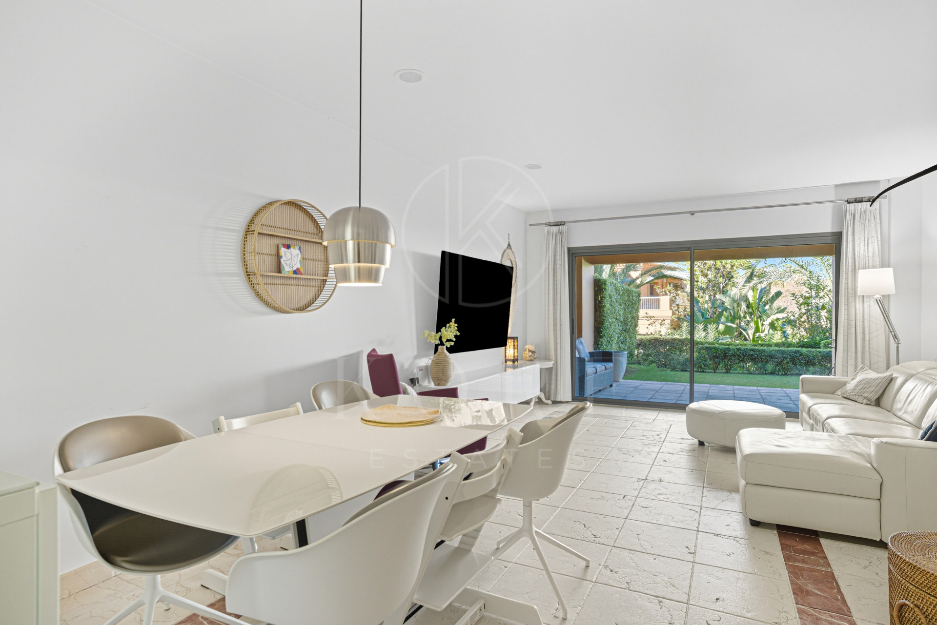Wonderful two-bedroom, ground floor apartment located in the sought after gated community of Benatalaya, Estepona East. The community offers 24hr security, concierge, communal swimming pools, indoor heated pool, gym, sauna, hammam and is located next to local schools’ shops and a short drive to the beach. The property has an open plan living and dining room with direct access to the private terrace and garden; fully fitted kitchen; master suite with access to the terrace; guest bedroom; and guest bathroom. Other features include hot and cold air conditioning, underfloor heating in the bathrooms, electric shutters, private parking space and a storeroom. A perfect property for year-round living or holiday home.