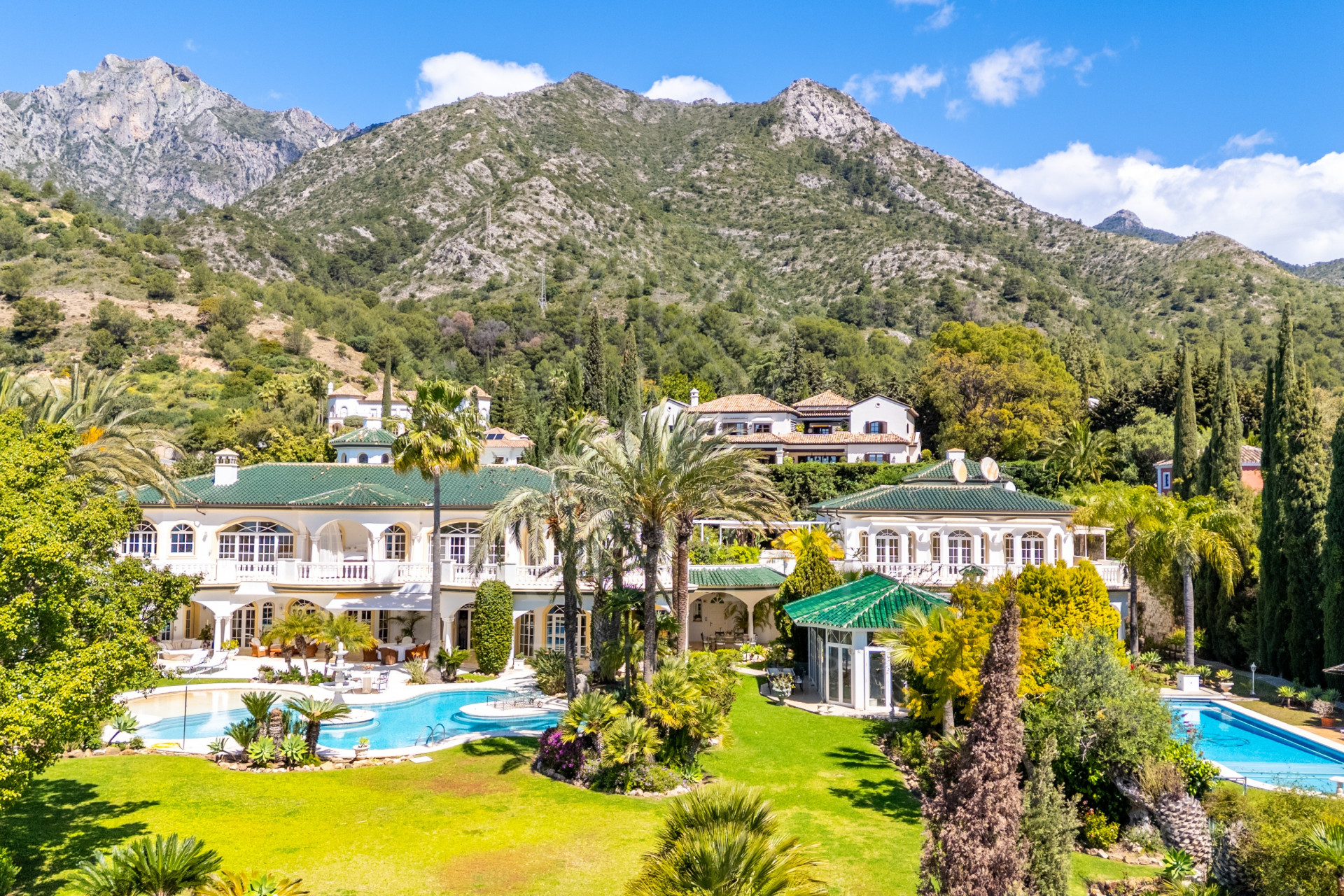 Set on a commanding elevated plot of 7,200 m² within the secure and prestigious Cascada de Camoján community, this extraordinary estate enjoys breathtaking panoramic views over the Mediterranean. The property comprises three independent residences: a luxurious four-bedroom main villa, a connected seven-bedroom guesthouse, and a separate four-bedroom finca with its own private tennis court.