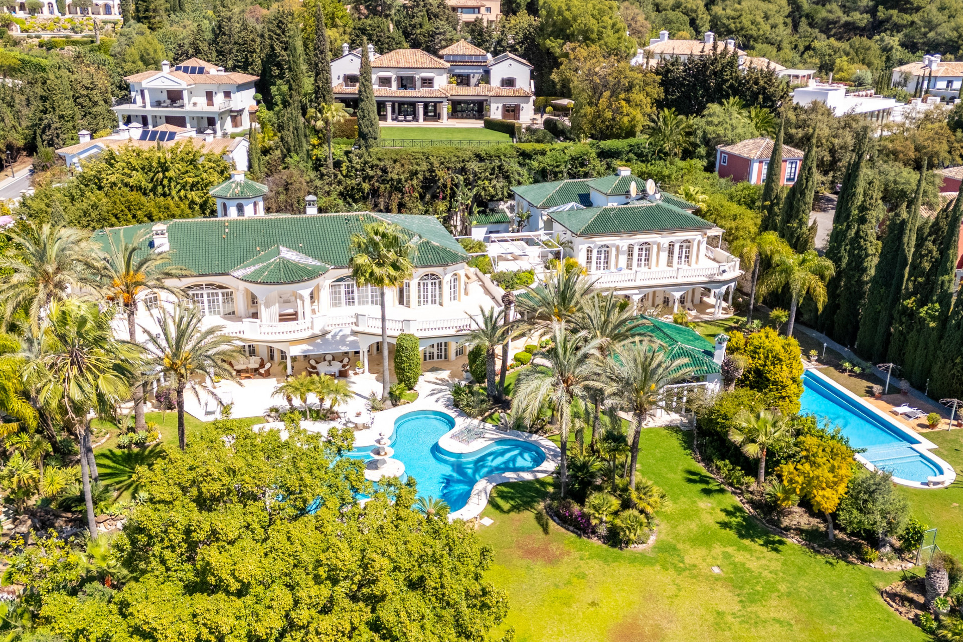 The lower ground floor of the main residence features a second garage, utility rooms, and multiple storage areas. Both the main villa and guesthouse boast separate landscaped gardens and their own heated swimming pools.