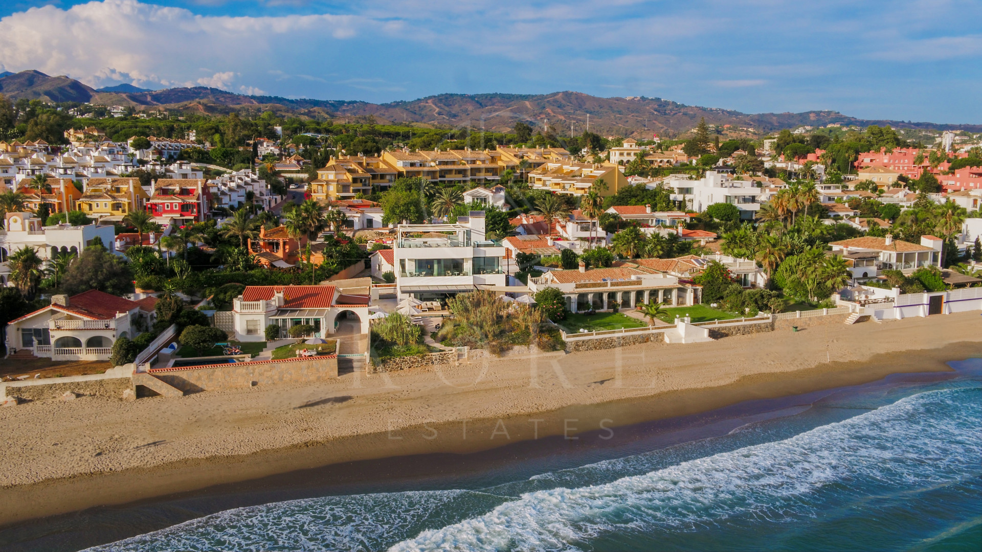 This stunning property, facing south-east, offers panoramic sea views and breathtaking sunsets, combining a modern design with the highest standards of quality and comfort. On the main floor, an elegant double-height entrance hall leads to a spacious living-dining area with large windows overlooking the sea, connected to an open-plan fully equipped kitchen featuring state-of-the-art appliances.This level also includes one bedroom and a fully fitted bathroom. From the living room, there is direct access to the main terrace, which features a heated saltwater swimming pool, an outdoor dining area, and chill-out sofas ideal for relaxing. A private path crosses the dunes and leads directly to the beach, ensuring privacy and exclusivity. On the lower floor, the villa offers a wellness area with sauna and relaxing bathtub, a spacious laundry room, a fully equipped bathroom, and two bedrooms with natural light. The first floor includes three bedrooms boasting impressive sea views and direct access to the terrace. One of the two bathrooms on this level is especially large and also has access to the terrace, which features a sitting and dining area to enjoy the spectacular views. Finally, the upper floor hosts a stunning rooftop solarium with jacuzzi, chill-out area, tables and chairs, and 360° panoramic views of the sea and the mountains.Additionally, the property is equipped with underfloor heating throughout, solar panels, centralized air conditioning, a wireless sound system, LED lighting, and an automatic irrigation system in the outdoor areas. There is also outdoor parking space for up to five cars, providing maximum comfort and convenience. A truly unique villa that combines luxury, technology, and a privileged beachfront location, offering an unparalleled lifestyle by the sea in Marbella.