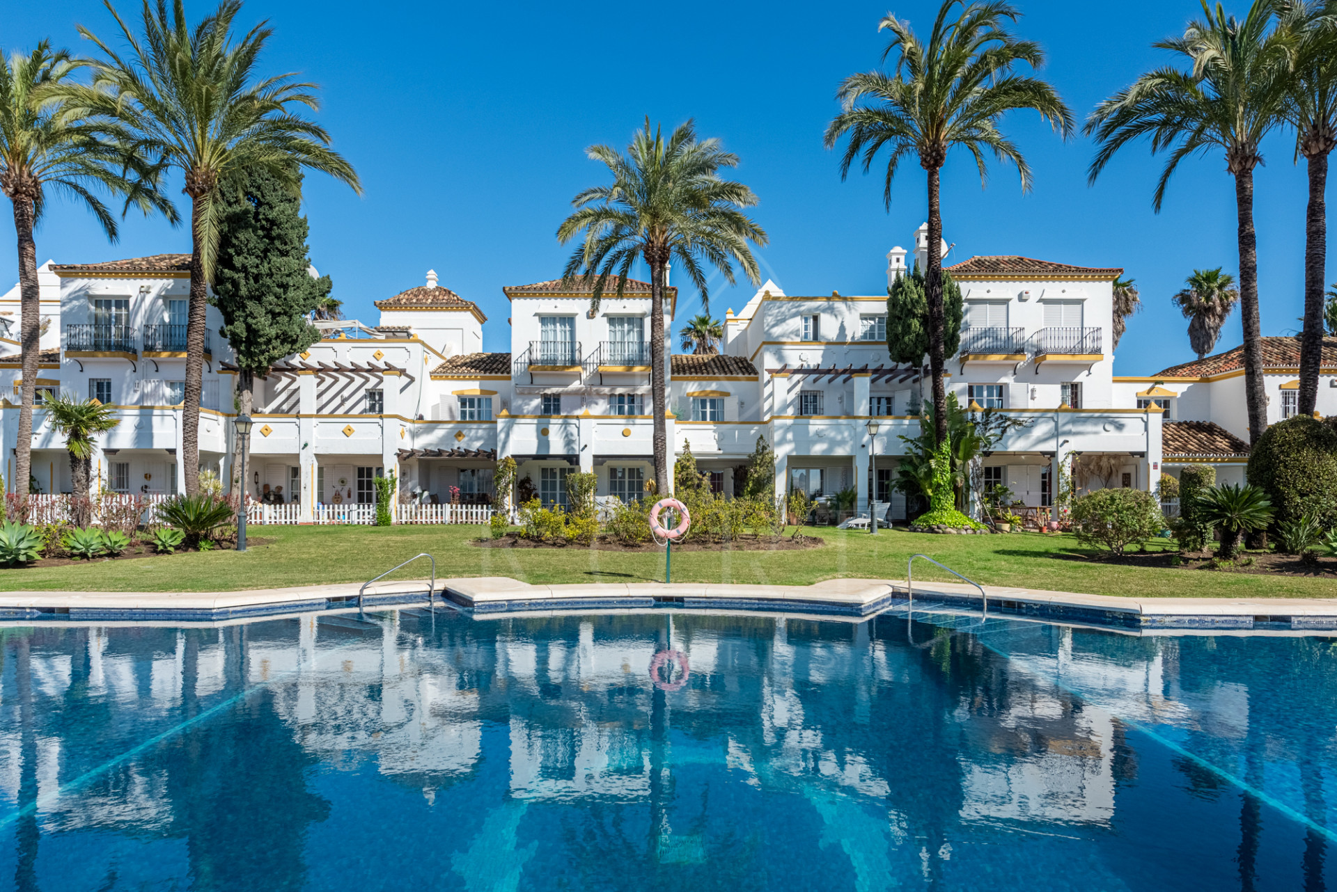 The property forms part of a charming community with beautiful landscaped gardens and a swimming pool, which can be accessed directly from the ground-floor terrace.